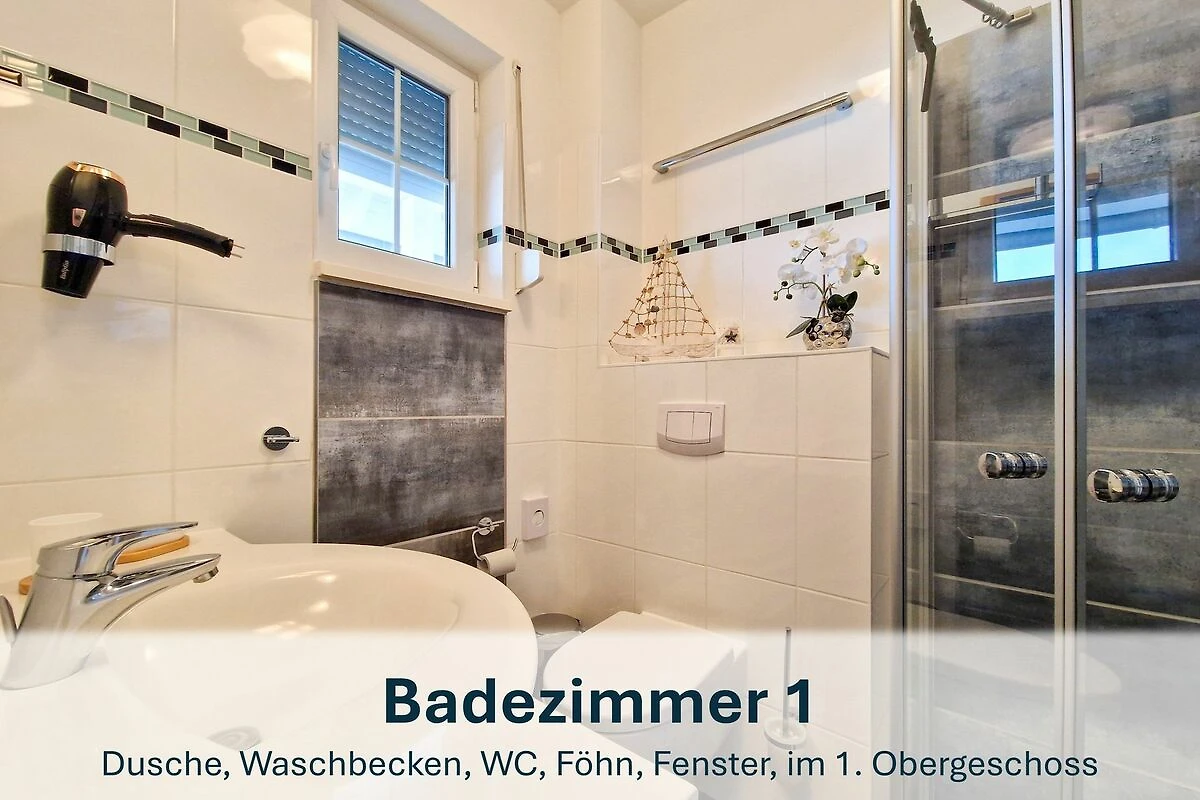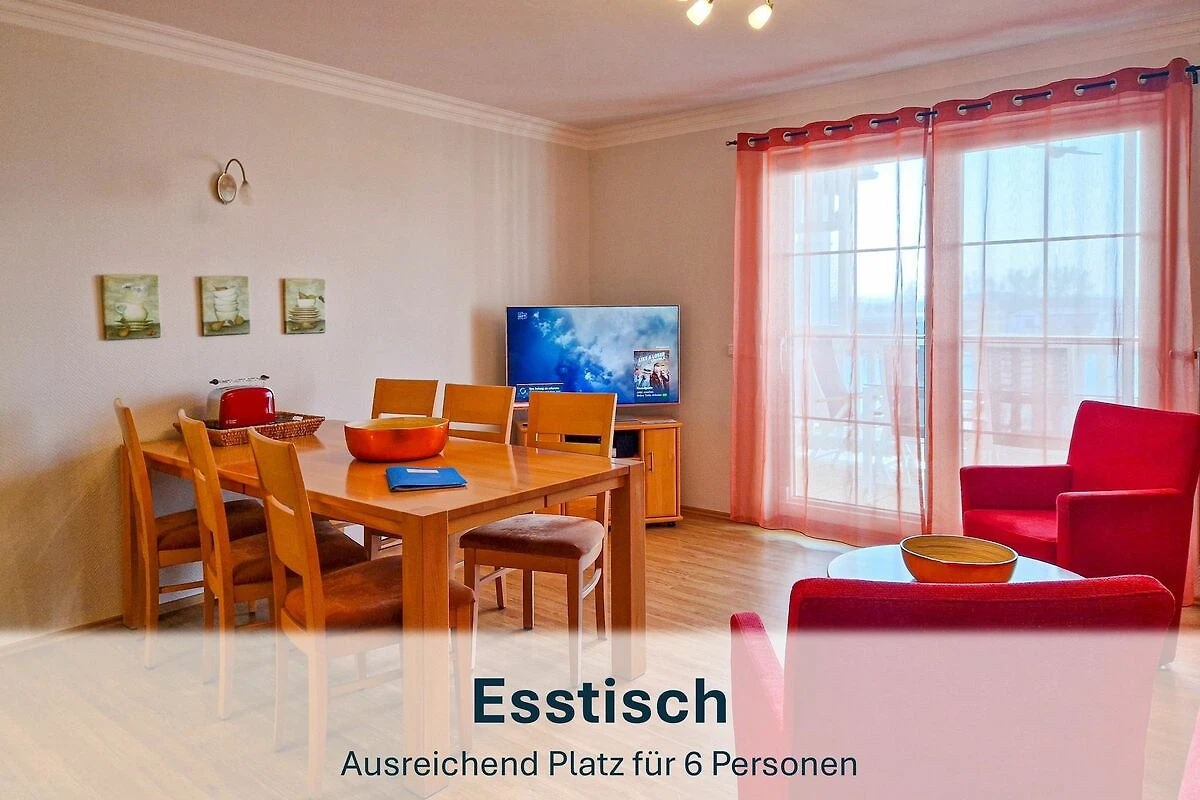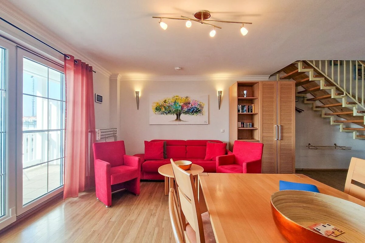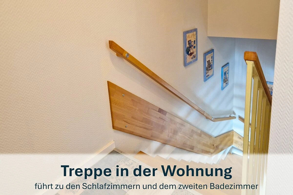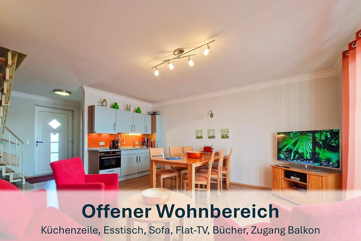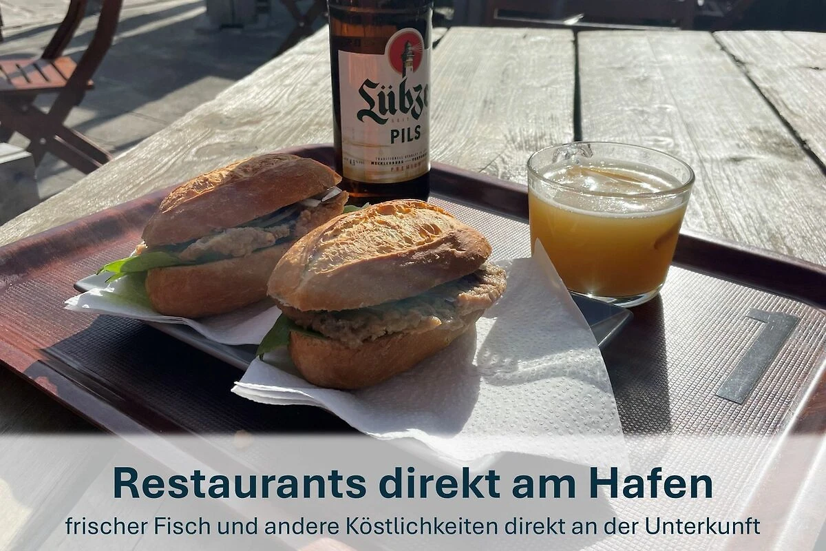 Im hellen Wohn-/Essbereich auf der 1. Etage erwarten Sie eine gemütliche Sitzecke mit Schlafsofa für 2 Personen, Sat-TV, Radio und ein Esstisch - ideal für entspannte Abende. Die moderne Einbauküche mit Backofen lässt keine Wünsche offen. Vom Balkon aus geniessen Sie den atemberaubenden Blick auf das lebendige Treiben im Yachthafen Karlshagen. Ein geräumiges Bad/WC rundet das erste Stockwerk ab.