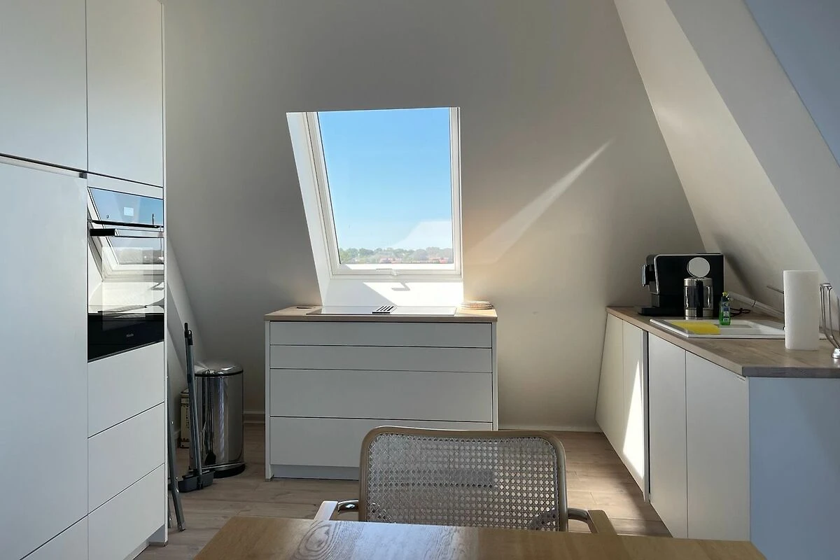 moderne offene Wohnküche mit Esstisch für vier Personen (Kaffeevollautomat mit Bohnen - vorrätig)