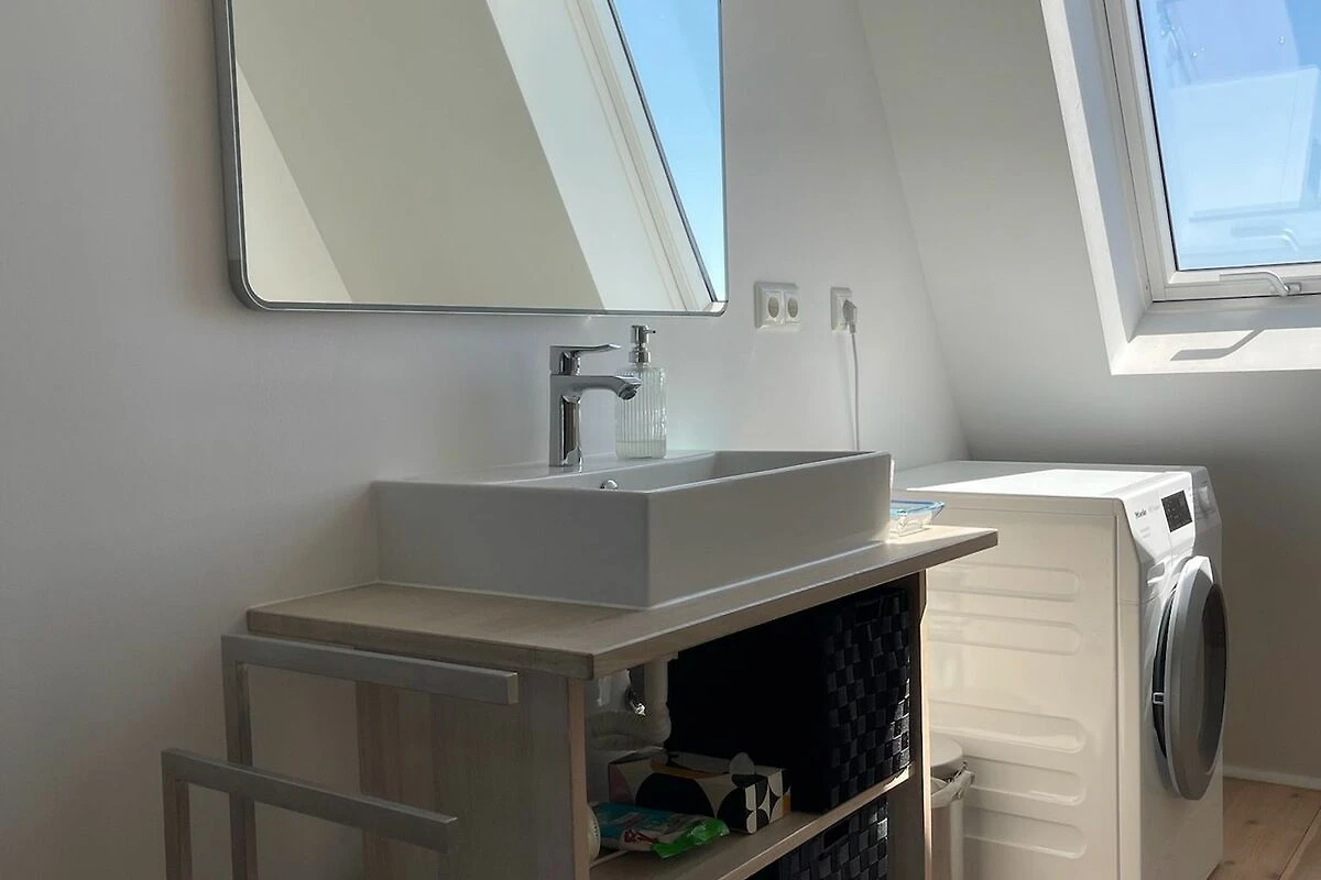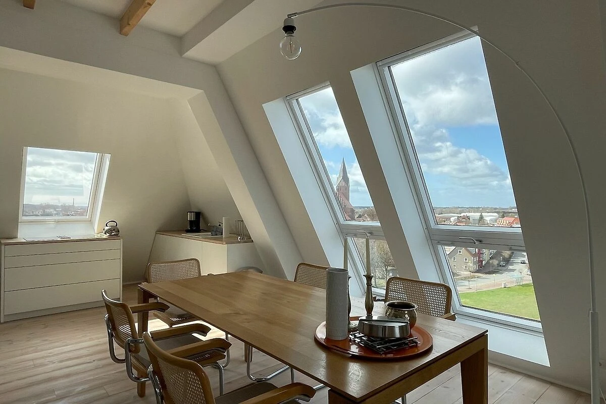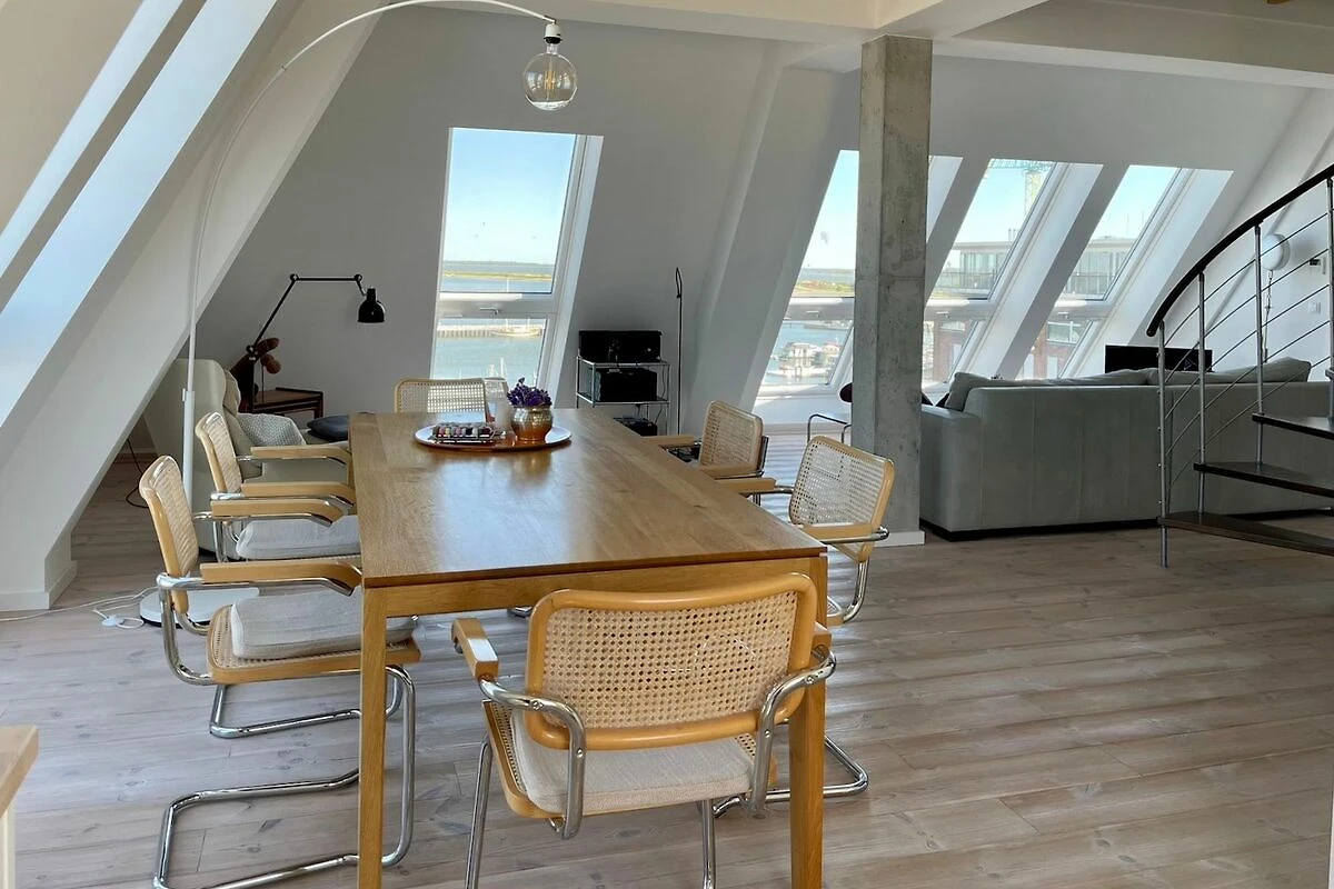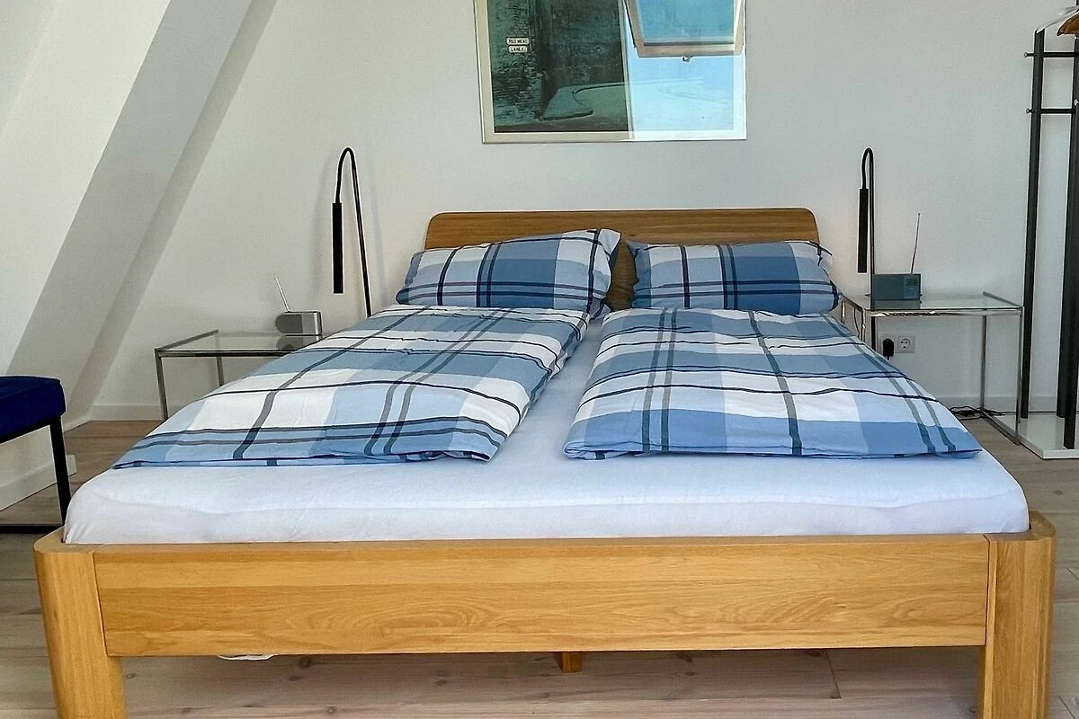 Die Renovierung des denkmalgeschützten Speichers wurde 2021 abgeschlossen. Mit einem Aufzug erreichen Sie die Maisonette-Wohnung, die sich über zwei Ebenen erstreckt und Ihnen eine hochwertige, designorientierte Ausstattung bietet: