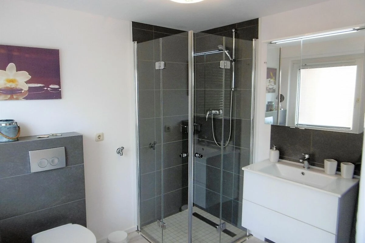 Die modern ausgestattete Ferienwohnung im Erdgeschoss umfasst ein kombiniertes Wohn- / Schlafzimmer mit Doppelbett, ein Schlafzimmer mit 2 Einzelbetten, ein Badezimmer mit ebenerdiger Dusche und eine kleine Diele mit Esstisch.