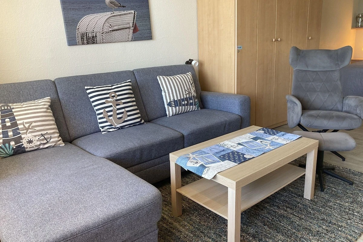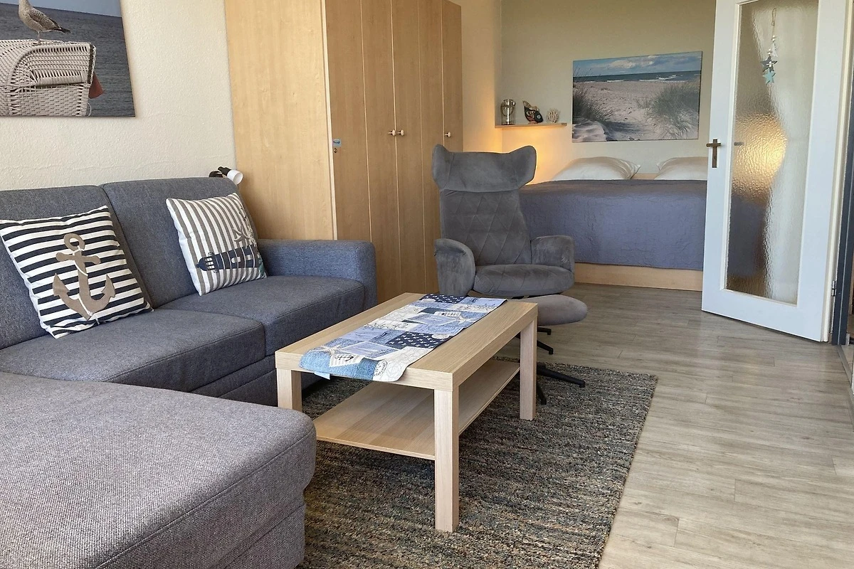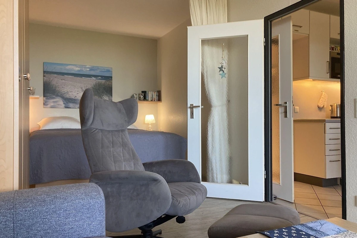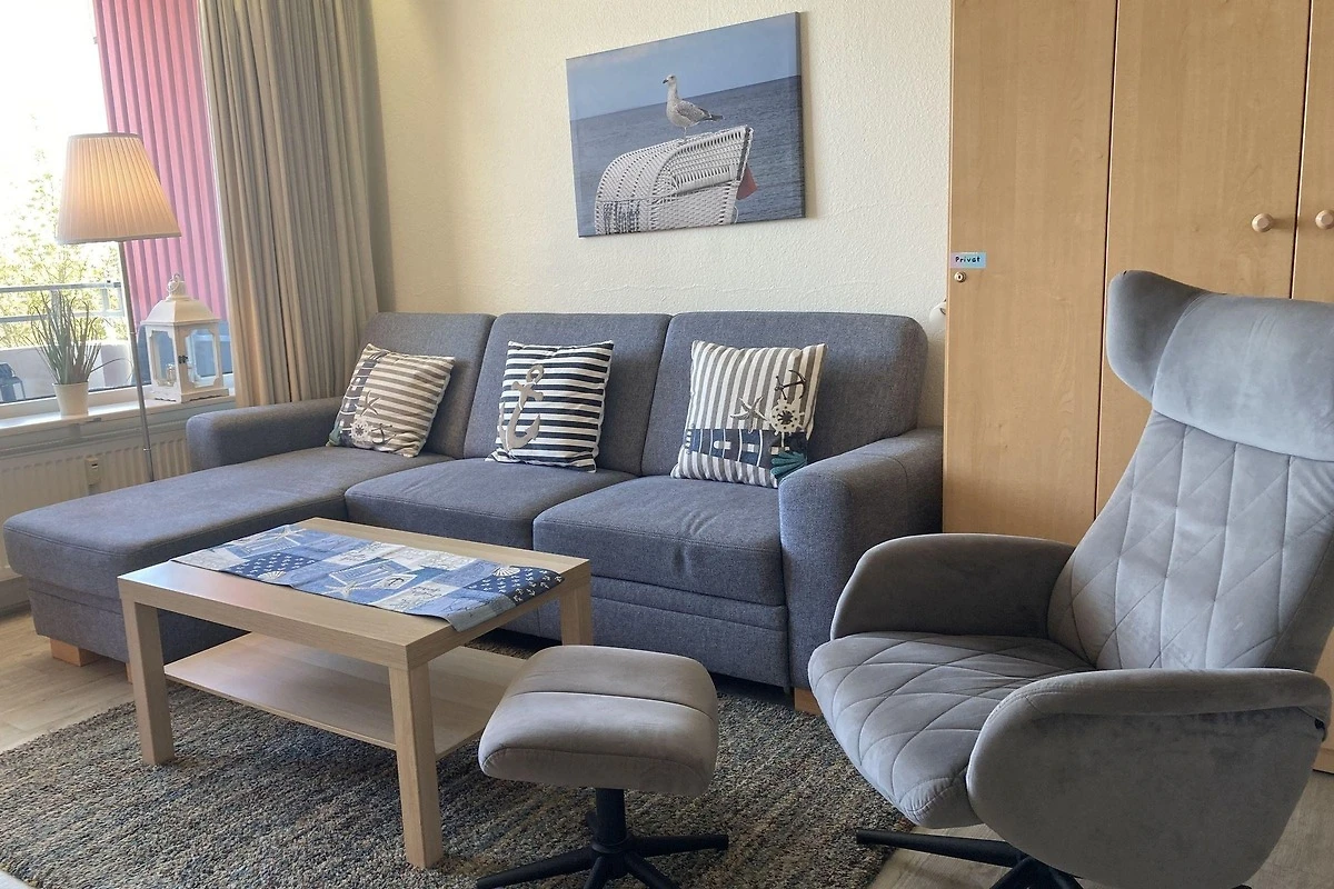 - Wohn-, Schlafzimmer mit gemütlicher Chaiselongue - Couch und einem Sessel mit Hocker,