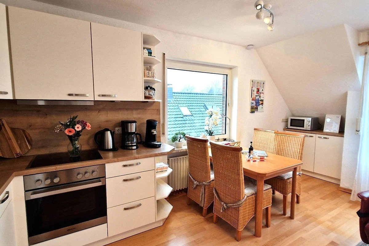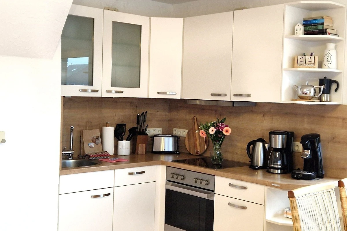 In dieser einladenden Ferienwohnung erwartet die Gäste eine moderne Ausstattung, die Komfort und Funktionalität vereint. Die offene Küche ist voll ausgestattet und verfügt über einen Geschirrspüler, Elektro-/Gasherd, Backofen, Mikrowelle, Kühlschrank sowie eine Kaffeemaschine und Gefriermöglichkeit – ideal für die Zubereitung leckerer Mahlzeiten. Ausgestattet mit WLAN ist die Unterkunft auch für digitale Entspannung bestens geeignet.