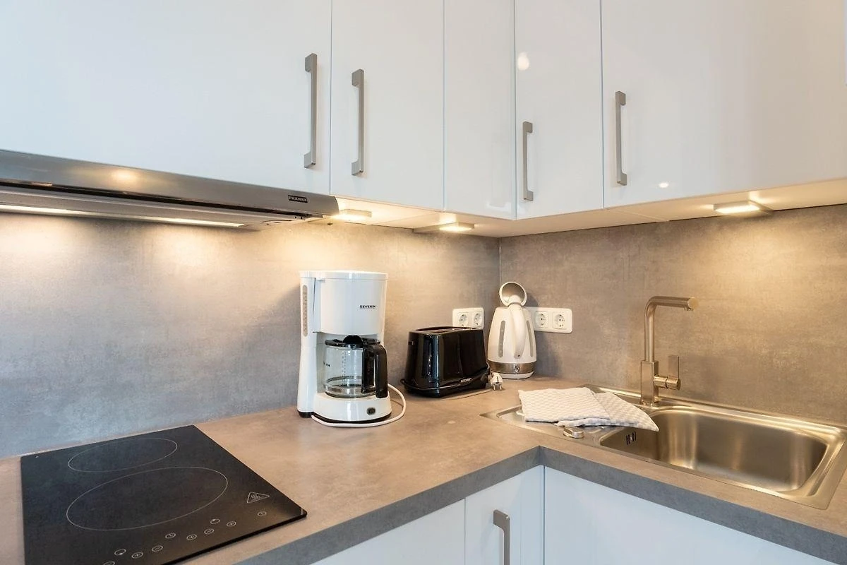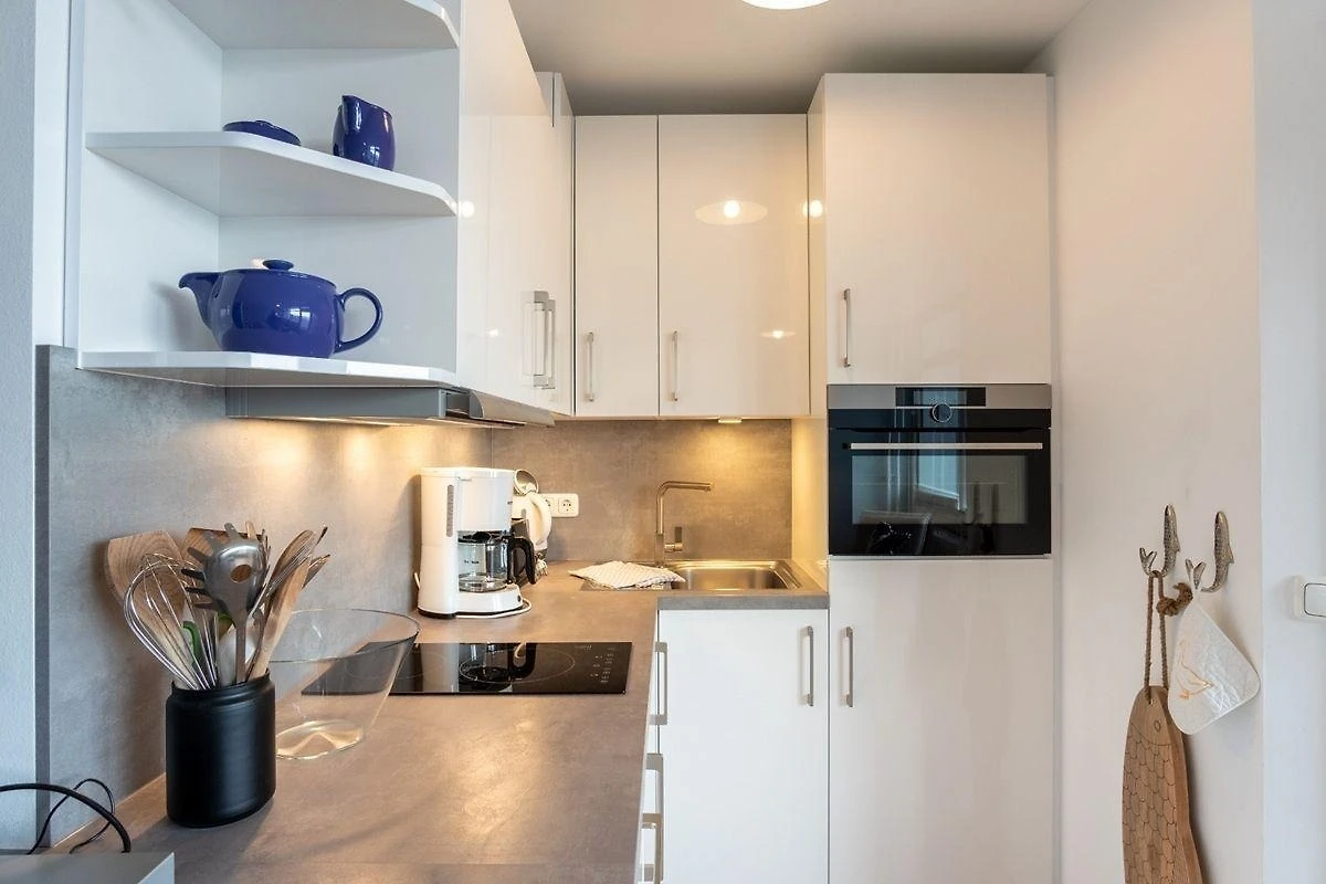 Die zuletzt 2021 modernisierte 45m²-Wohnung verfügt über einen grosszügigen Wohn-Schlafbereich mit einem komfortablen Doppelbett im hinteren Bereich, einer gemütlichen Sofaecke mit Flatscreen-TV und der Essecke für drei Personen. Der offene Küchenbereich ist für den Urlaubsbedarf voll ausgestattet. Ausserdem stehen Ihnen noch ein Geschirrspüler und ein Backofen zur Verfügung. Das angrenzende Kinderzimmer verfügt über ein Einzelbett und ist auch für einen Erwachsenen geeignet. Die Dusche im Badezimmer ist mit einer Glastrennwand ausgestattet und hat einen niedrigen Einstieg.