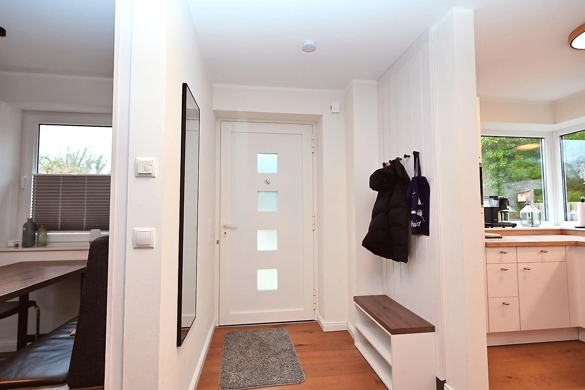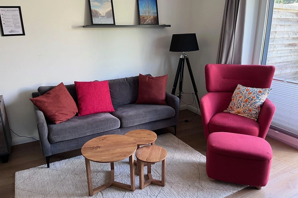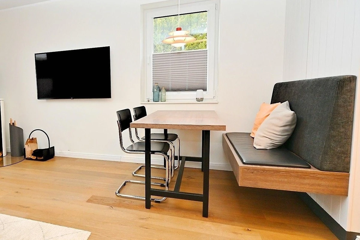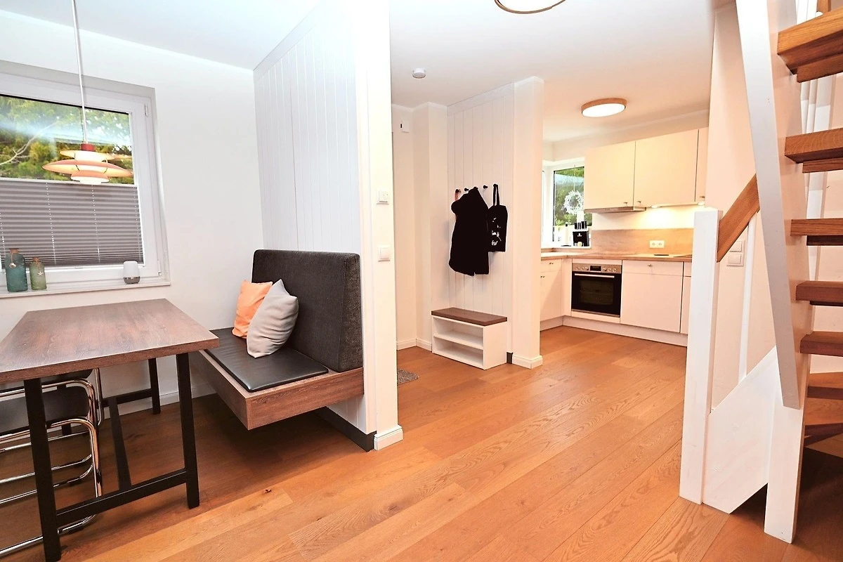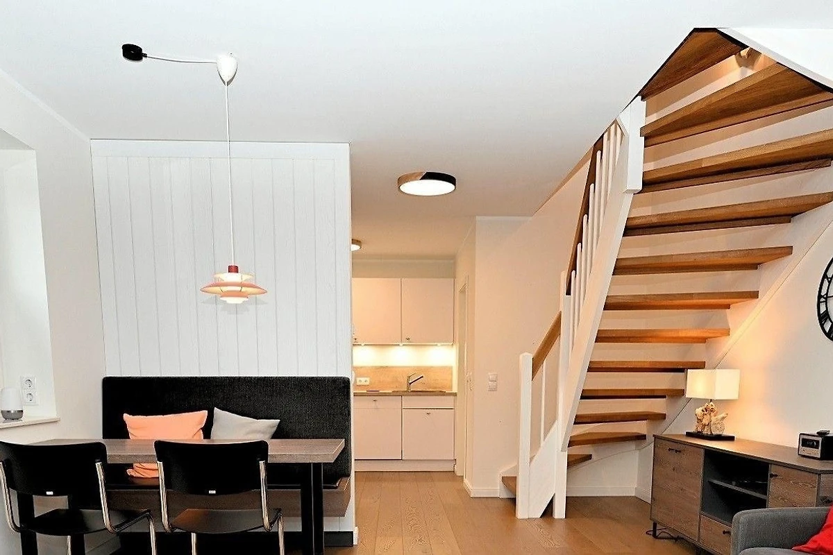 Das Traum-Ferienhaus in Hohwacht ist nur 150 Meter vom Strand entfernt und bietet Platz für bis zu vier Personen. Der grosszügige Wohn- und Essbereich ist mit einem kuscheligen Sofa, einem 55'' TV und einem Kamin ausgestattet, der für Gemütlichkeit sorgt. Die offene Küche verfügt über hochwertige BOSCH-Geräte, darunter Induktionsherd, Backofen und Kühlschrank, sowie sämtliches Koch- und Essgeschirr. Die beiden Schlafzimmer sind mit komfortablen COCO-MAT Boxspringbetten aus 100% Naturmaterialien ausgestattet, die für erholsamen Schlaf sorgen. Im ersten Stock befindet sich ein Badezimmer mit einer luxuriösen XL-Regendusche und im Erdgeschoss ein Gäste-WC. Praktische Annehmlichkeiten wie eine Waschmaschine, ein Trockner im Kellerraum sowie kostenfreies WLAN runden das Angebot ab. Haustiere sind ebenfalls willkommen.