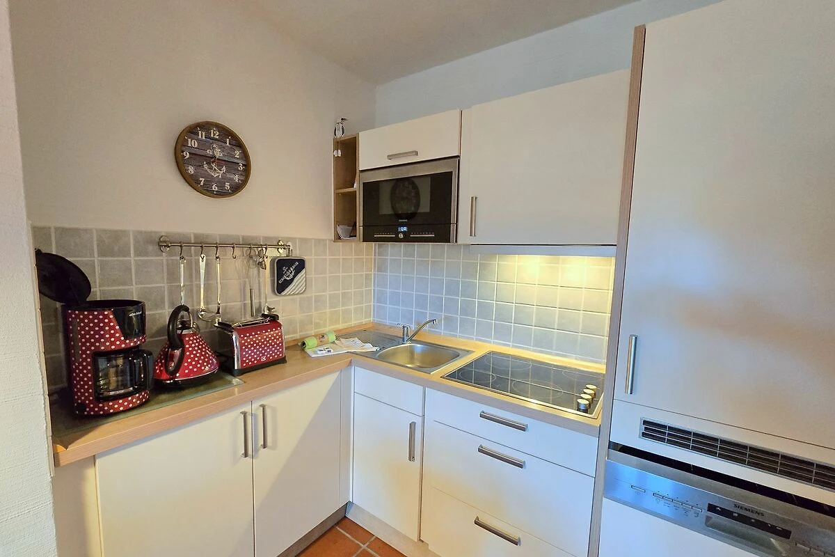 Diese freundliche Ferienwohnung lädt zu einem Grillabend auf der privaten Terrasse ein. Die Küchenzeile des 1-Raum Appartements ist mit allem notwendigen ausgestattet und bietet neben einer Kochmöglichkeit, einen Wasserkocher, eine Kaffeemaschine und einen Toaster. Im Wohn- und Schlafbereich steht der Sat-TV (LCD) und das bequeme Bett. Das Badezimmer überzeugt mit einer geräumigen Dusche, einem Waschbecken, einem WC sowie einem großen Spiegel. Haustiere sind in dieser Wohnung herzlich willkommen.