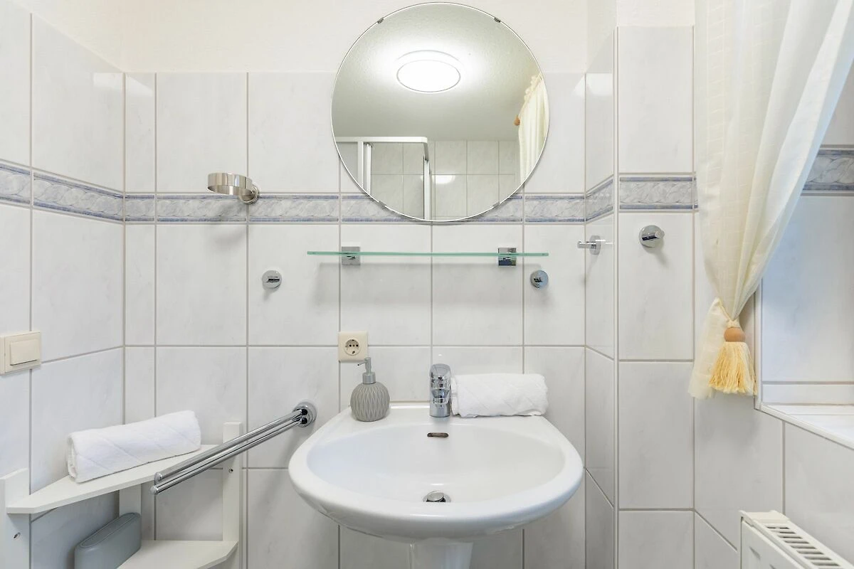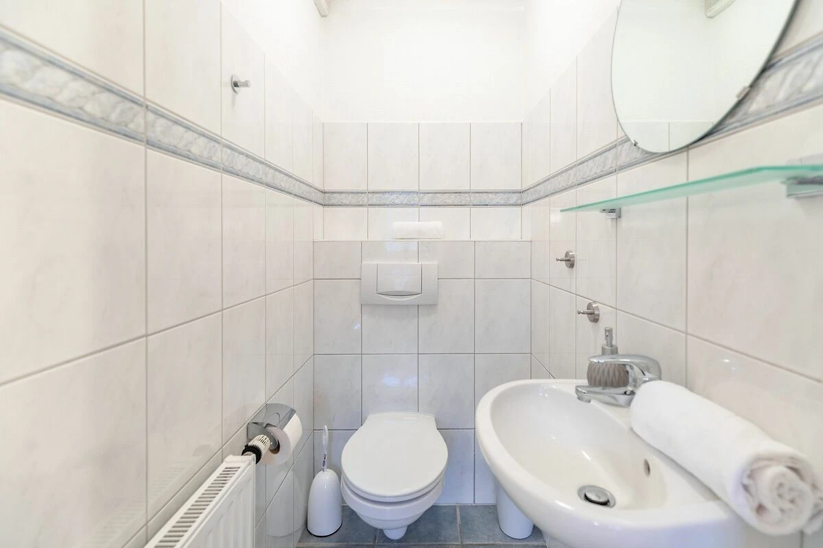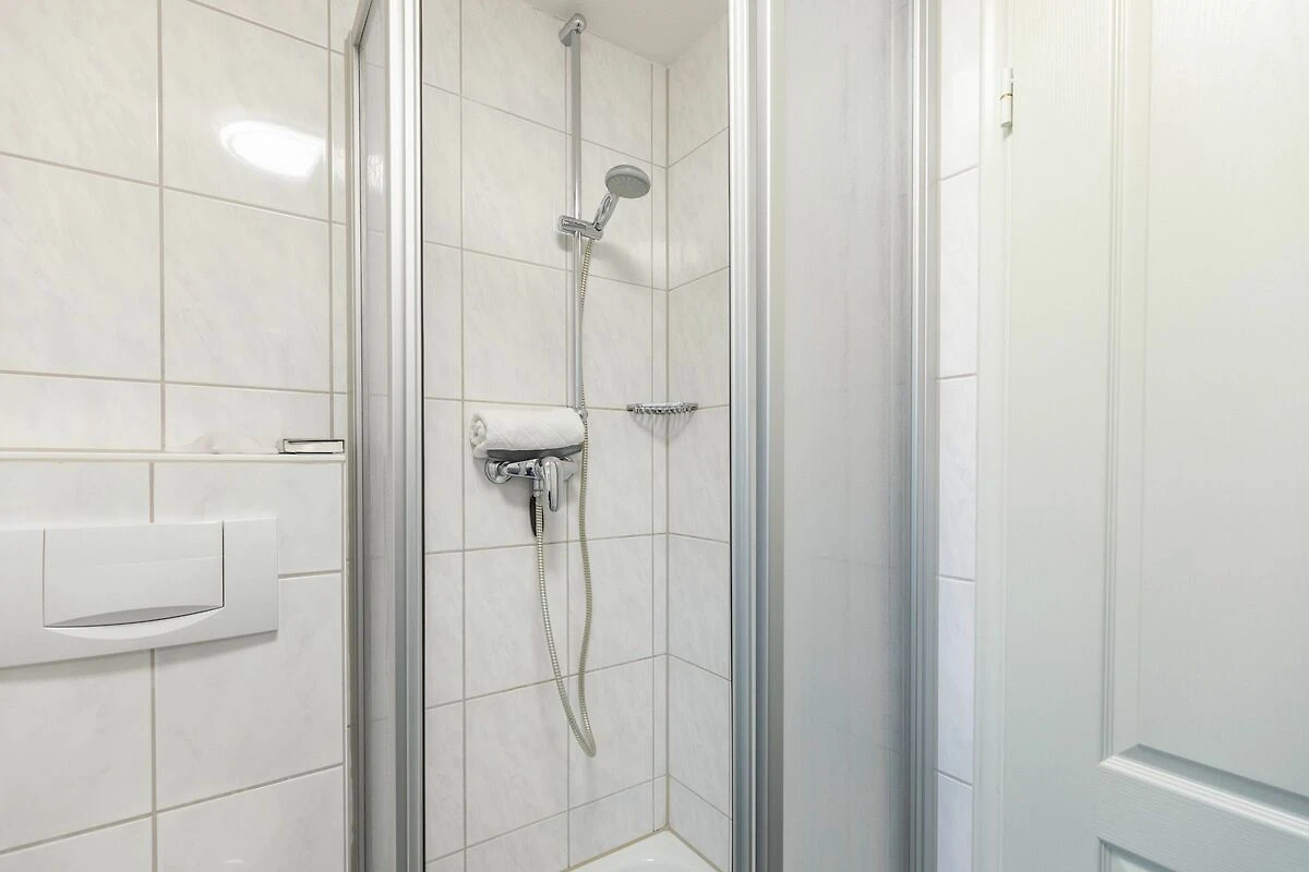 Das Badezimmer ist mit Dusche und einem Haartrockner ausgestattet, ergänzt durch ein zusätzliches Gäste-WC für mehr Privatsphäre. Zur Nutzung stehen außerdem eine Waschmaschine und ein Trockner in Gemeinschaftsnutzung im Keller bereit.