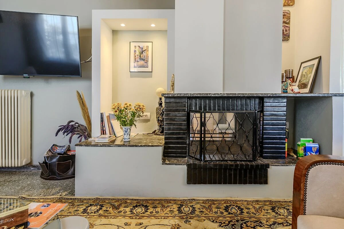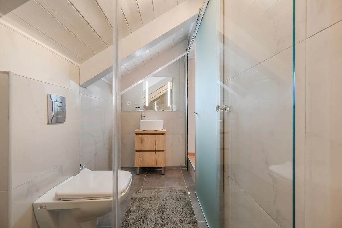 In der 1. Etage: (Wohnzimmer(TV(Flatscreen, Satellit, smart TV), TV, Esstisch, Kaminofen, Sitzecke), offene Küche(Wasserkocher, Toaster, Kaffeemaschine, Backofen, Mikrowelle, Spülmaschine, Kühlschrank, Tiefkühlschrank, ), Schlafzimmer mit Badezimmer(Doppelbett, Dusche, Waschbecken, Toilette, ))