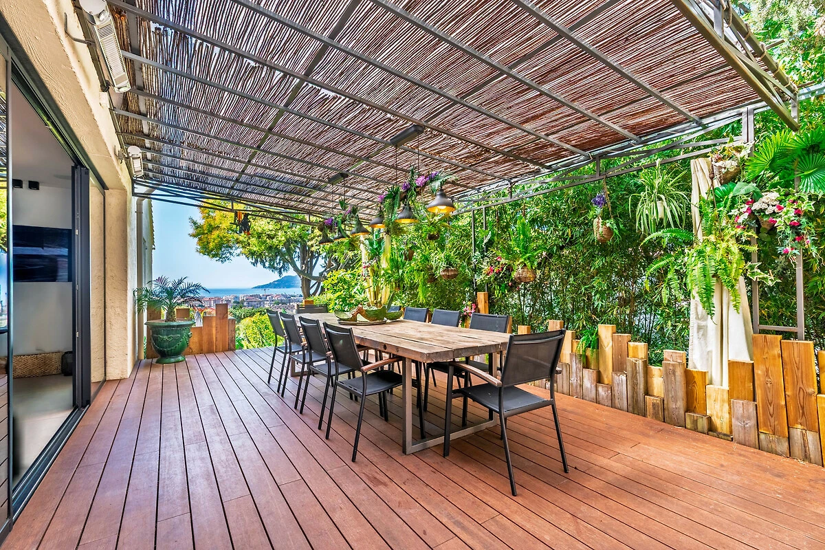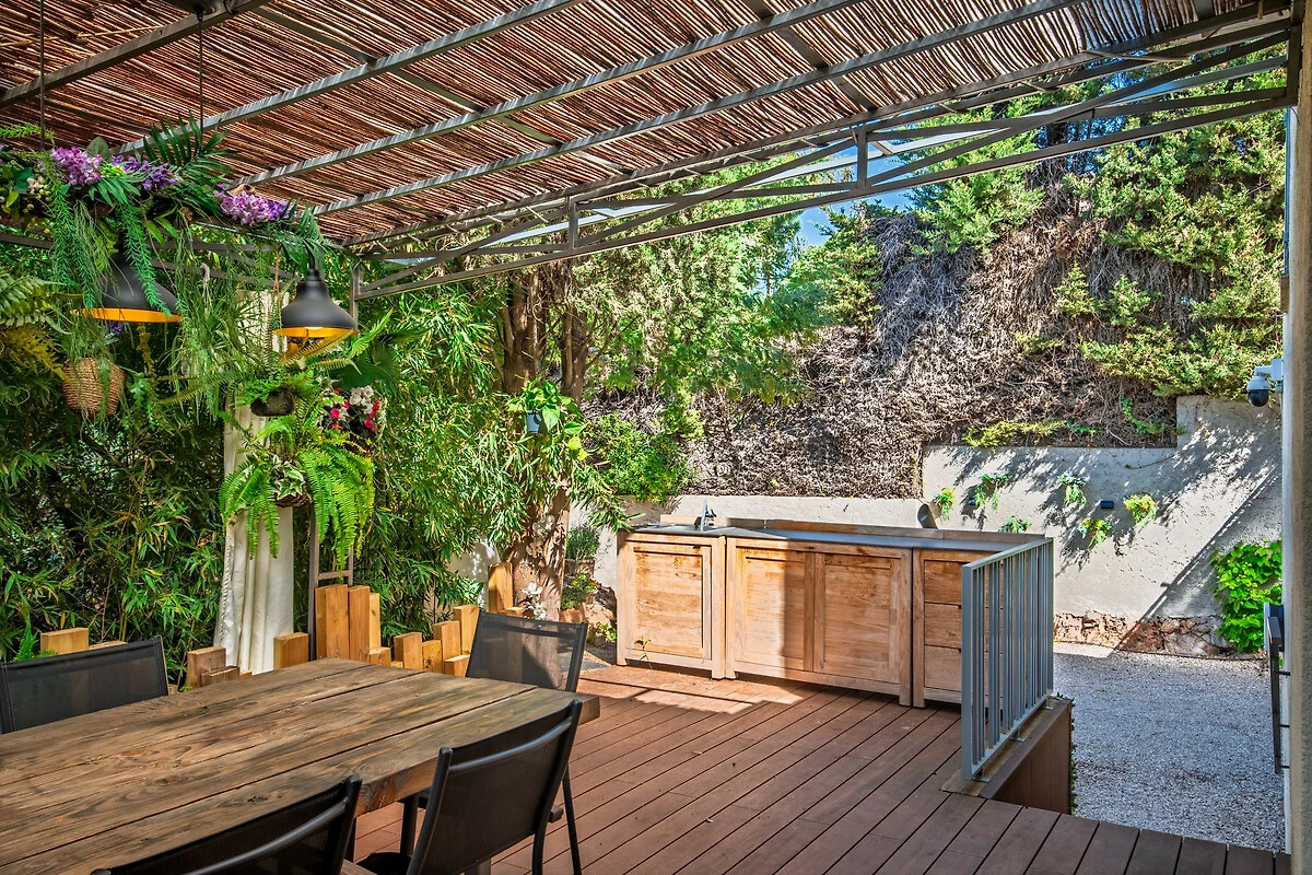 Bei der Ankunft führen einige Stufen direkt zur Terrasse des Erdgeschosses: ein angenehmer, schattiger Aussenlebensraum mit einem grossen Tisch für Mahlzeiten mit Meerblick sowie einer Sommerküche, ausgestattet mit einem Waschbecken, einem Herd und einer Plancha. Von dieser Terrasse aus gelangt man ins Innere und in einen geräumigen, lichtdurchfluteten und zeitgenössischen Wohnbereich von 100 m², der Wohnzimmer, Esszimmer und eine moderne Küche umfasst, alle mit Blick aufs Meer ausgerichtet.
