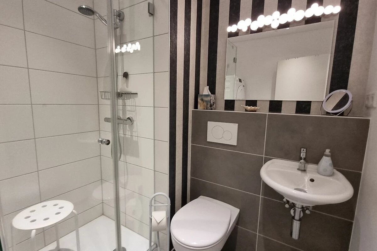 Das moderne Badezimmer ist mit einer bodengleichen Dusche und hochwertigen Annehmlichkeiten wie einem Kosmetikspiegel und einem Haartrockner ausgestattet.