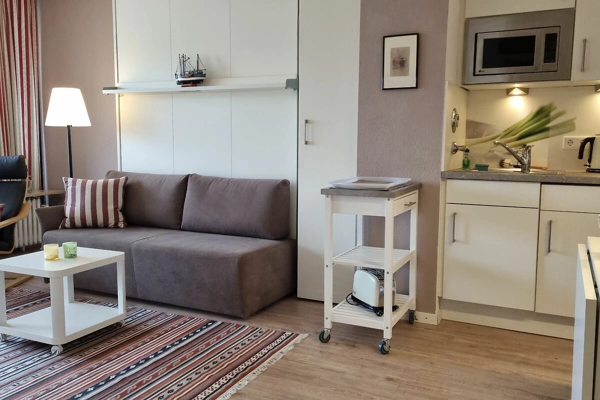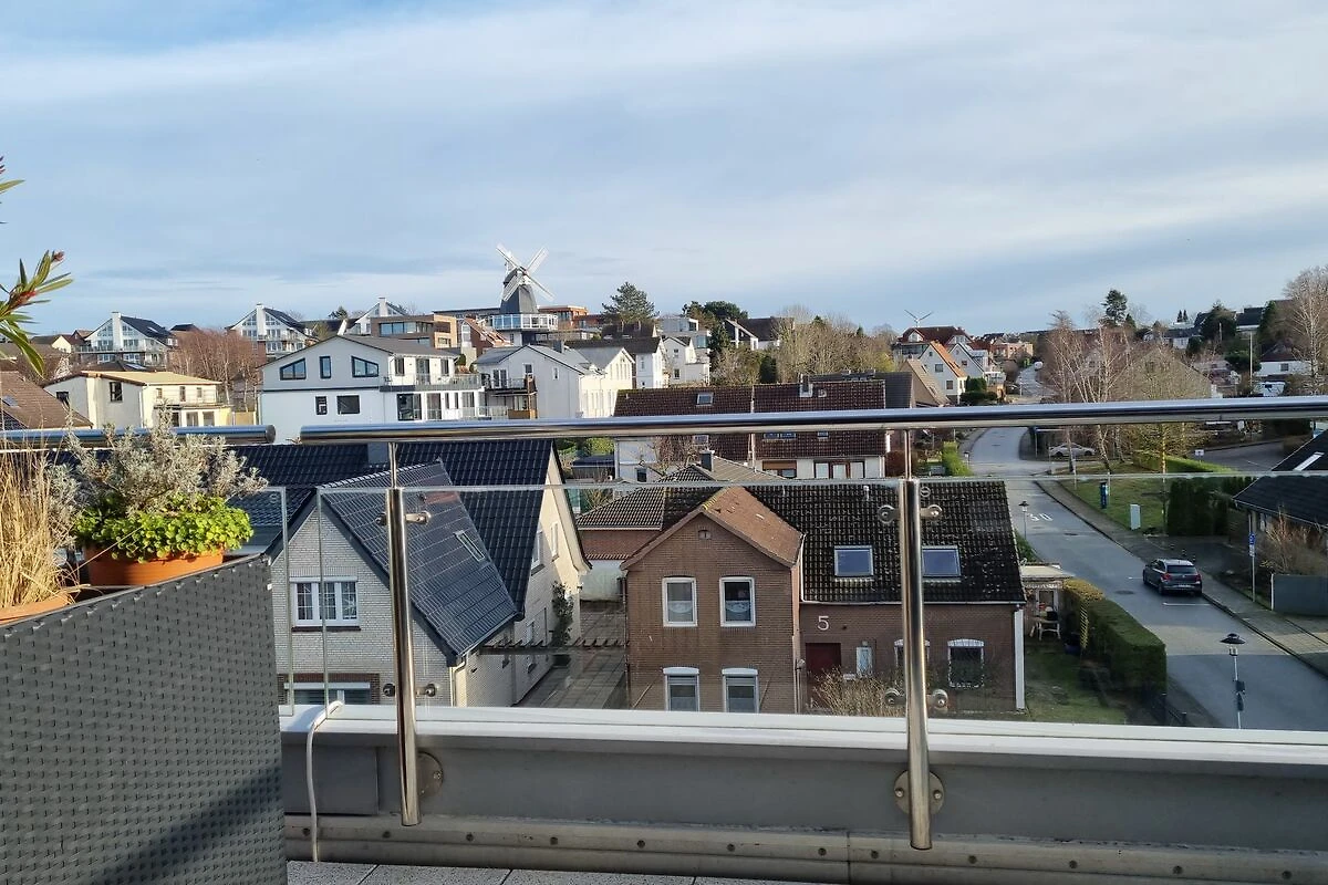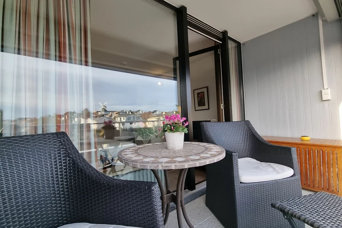 Die Ferienwohnung überzeugt mit einem offenen Wohnkonzept, das einladend und funktional ist. Der Wohnbereich erwartet Euch mit einem gemütlichen Sofa, einem Essbereich und einer voll ausgestatteten moderner Küche mit Ceranfeld, Mikrowelle und all den nötigen Küchenutensilien, um köstliche Mahlzeiten zuzubereiten. Am Morgen könnt Ihr euch mit einer frisch gebrühten Tasse Kaffee, zubereitet mit der Kaffeemaschine, auf dem dazugehörigen Balkon mit Blick auf die historische Windmühle entspannen. Der Balkon wird zum perfekten Ort, um den Tag mit einem tiefen Atemzug frischer Meeresluft zu beginnen. Der dazugehörige, überdachte Balkon mit südöstlicher Ausrichtung bietet auf 12 m² nicht nur ausreichend Platz zum Verweilen, sondern ist auch mit einer Markise ausgestattet – ideal, um geschützt die Sonne zu genießen oder den Tag entspannt ausklingen zu lassen.
