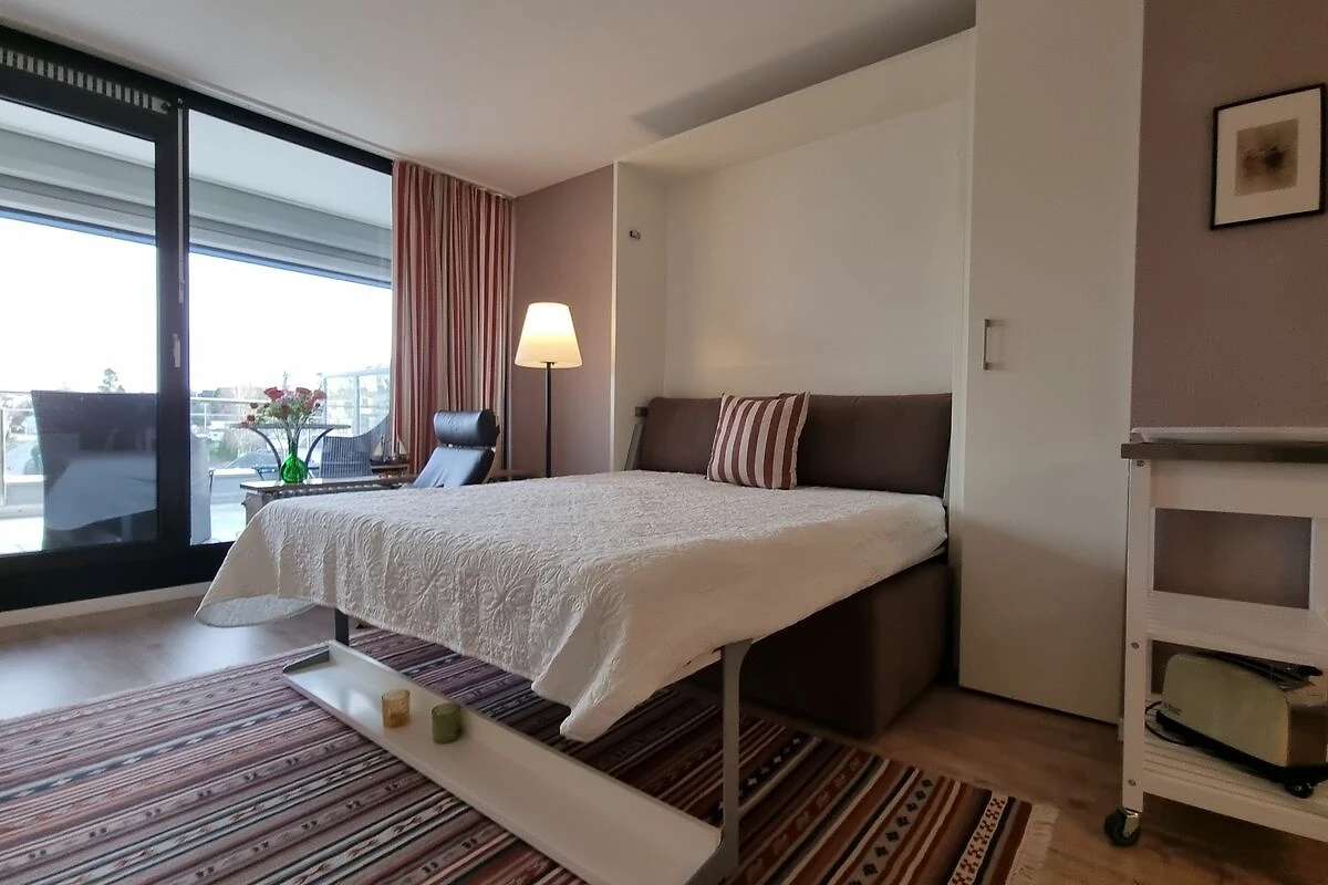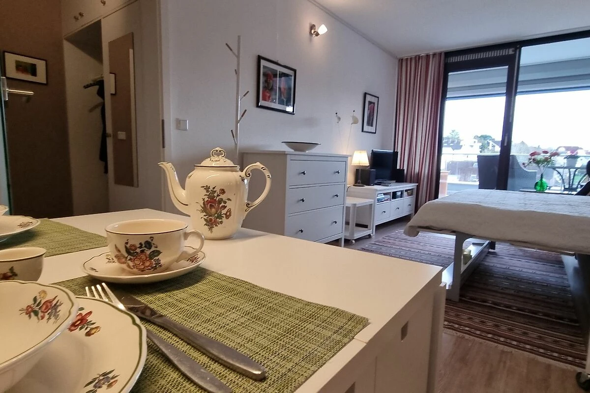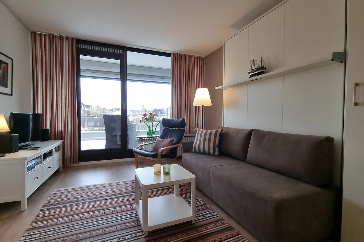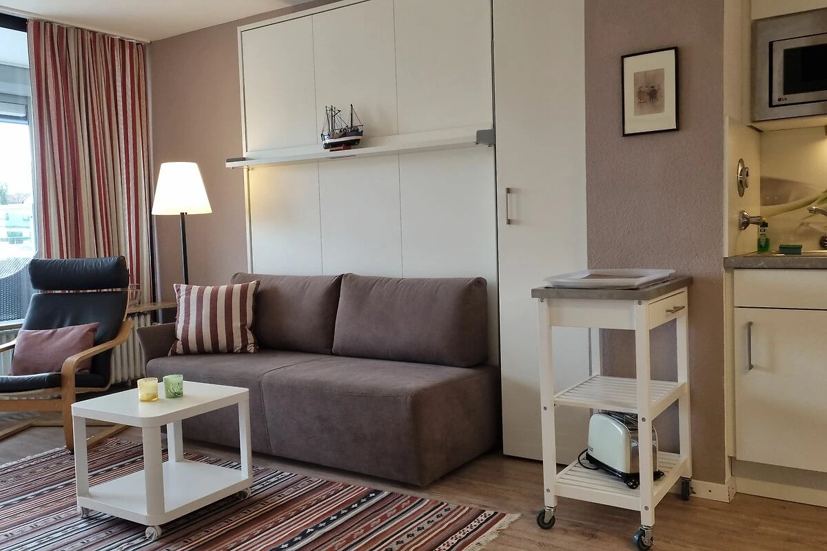 Die Ferienwohnung überzeugt mit einem offenen Wohnkonzept, das einladend und funktional ist. Der Wohnbereich erwartet Euch mit einem gemütlichen Sofa, einem Essbereich und einer voll ausgestatteten moderner Küche mit Ceranfeld, Mikrowelle und all den nötigen Küchenutensilien, um köstliche Mahlzeiten zuzubereiten. Am Morgen könnt Ihr euch mit einer frisch gebrühten Tasse Kaffee, zubereitet mit der Kaffeemaschine, auf dem dazugehörigen Balkon mit Blick auf die historische Windmühle entspannen. Der Balkon wird zum perfekten Ort, um den Tag mit einem tiefen Atemzug frischer Meeresluft zu beginnen. Der dazugehörige, überdachte Balkon mit südöstlicher Ausrichtung bietet auf 12 m² nicht nur ausreichend Platz zum Verweilen, sondern ist auch mit einer Markise ausgestattet – ideal, um geschützt die Sonne zu genießen oder den Tag entspannt ausklingen zu lassen.
