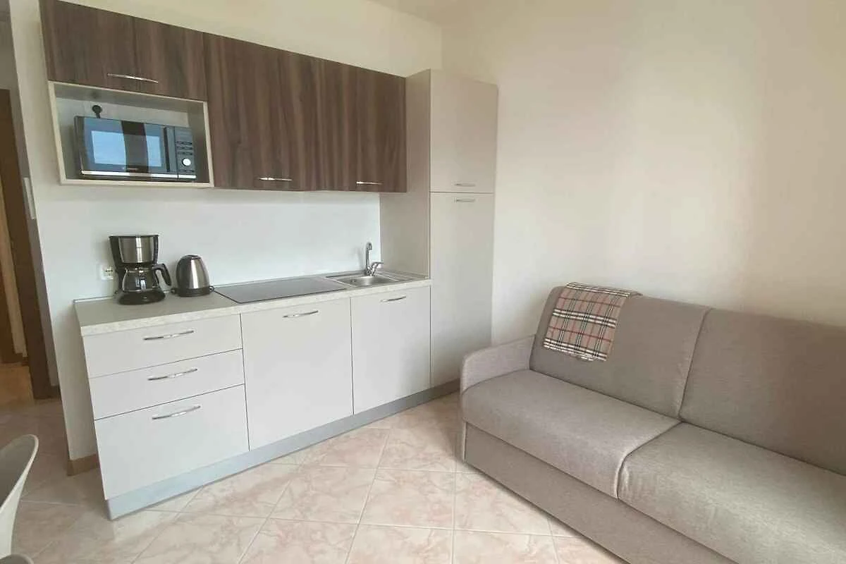 Der Eingang in Ihre Ferienwohnung befindet sich im Obergeschoss. Wohnzimmer mit Sitzecke, TV, Klimaanlage, Essecke (3 Plätze), Zugang zum Balkon (5 qm, Gartenmöbel, 1 Tisch, 2 Stühle) und vom Balkon hat man einen Seeblick. Schlafzimmer mit 1 Einzelbett. Schlafzimmer mit 1 Doppelbett und 1 Gitterbett. Kochecke im Wohnzimmer mit Elektroherd (Induktionsherd, 4 Platten), Geschirrspüler, Kühlschrank (Eisfach), Mikrowelle, Kaffeemaschine, Toaster und elektrischem Wasserkocher. Bad mit Dusche, 1 Waschbecken, WC, Bidet und Föhn.