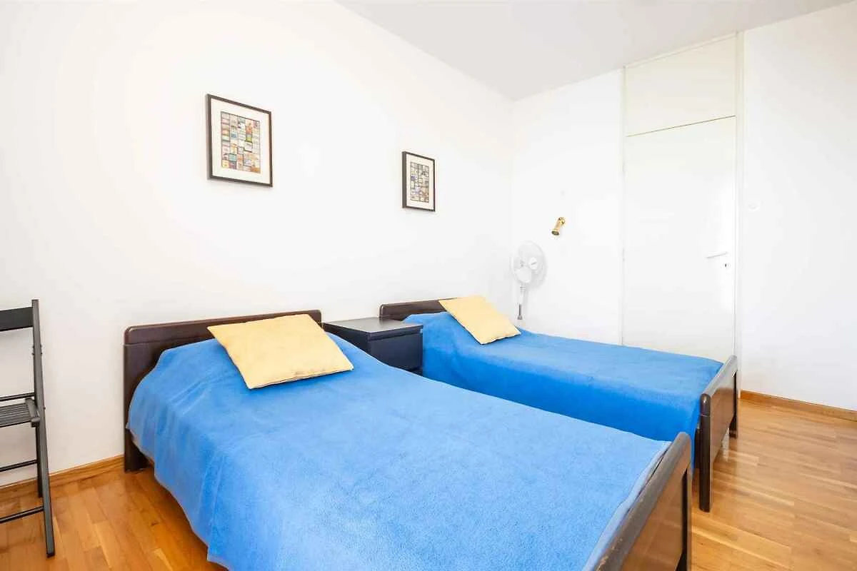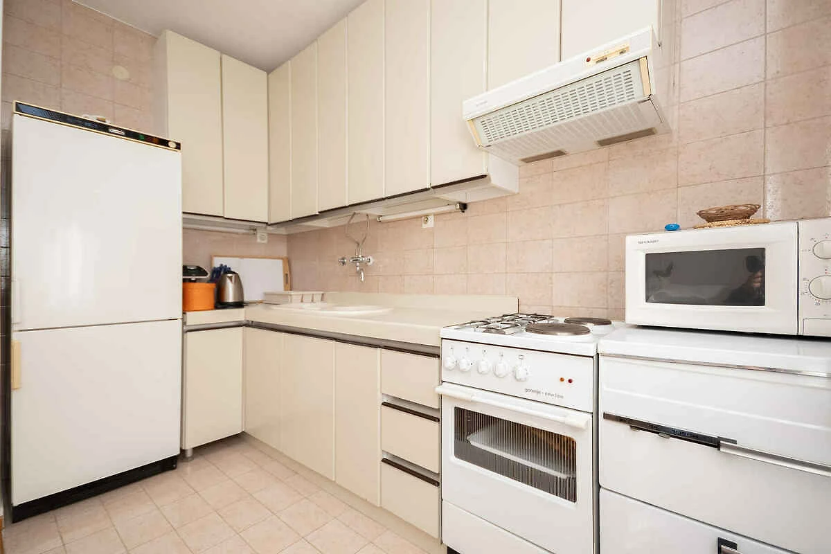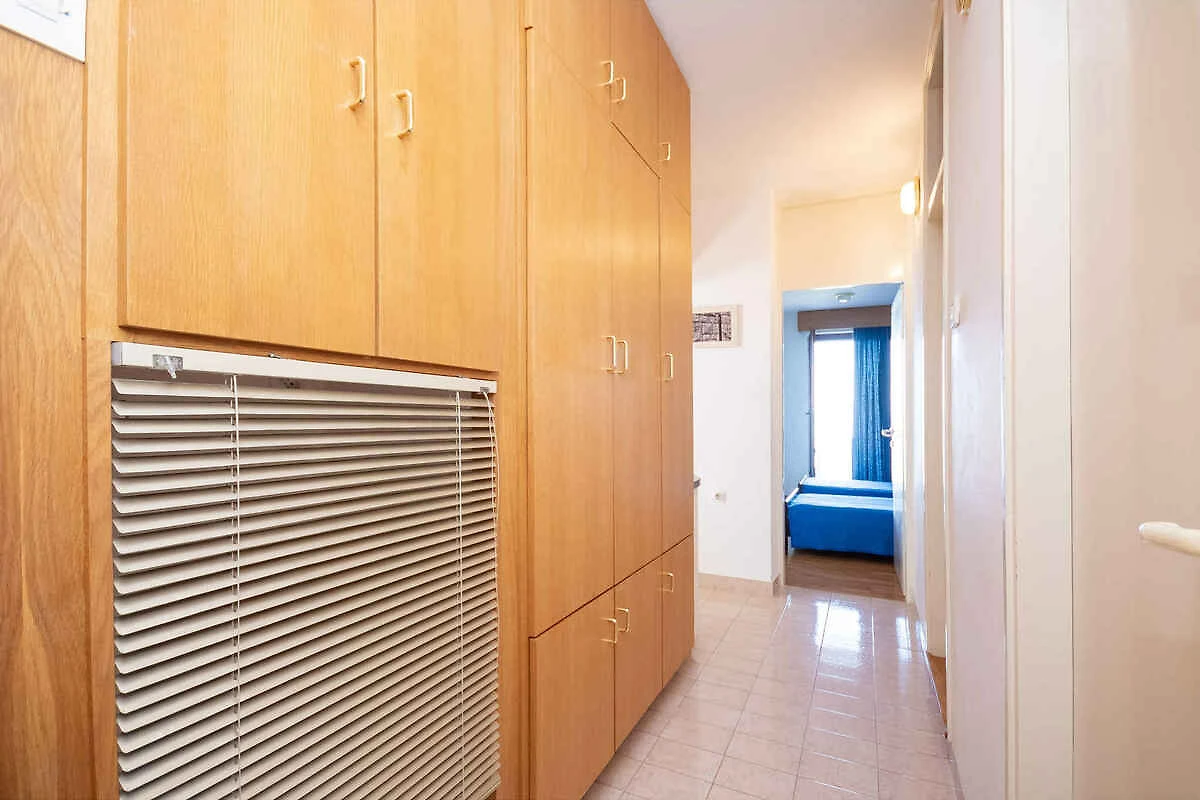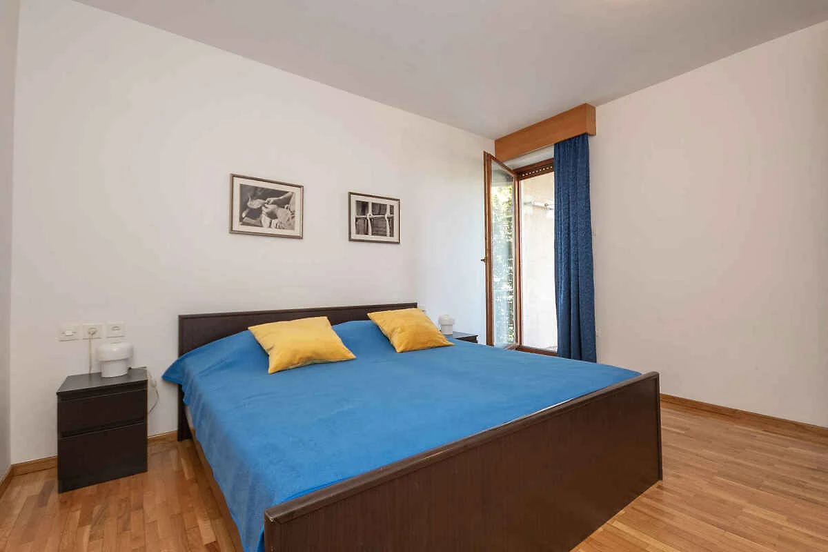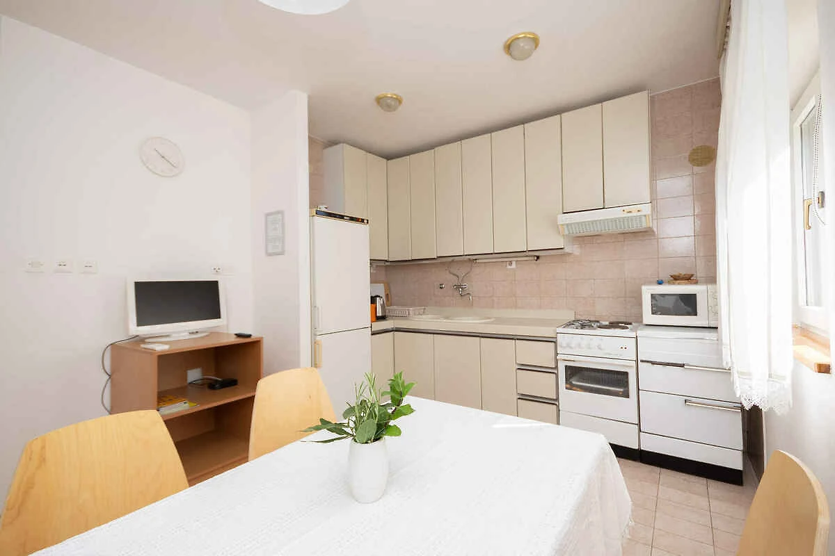 und führt direkt in den Vorraum. Wohnzimmer mit Essecke (4 Plätze). Schlafzimmer (14 qm) mit 1 Doppelbett und Zugang zum Balkon (5 qm, Gartenmöbel, 1 Tisch, 4 Stühle, Sonnenschirm). Schlafzimmer (11 qm) mit 2 Einzelbetten und Zugang zum Balkon. Kochecke im Wohnzimmer mit Gasherd (2 Flammen), Elektroherd (Cerankochfeld, 2 Platten), Backofen und Kühlschrank (Eisfach). Bad mit Dusche, 1 Waschbecken, WC und Hajszárító kérésre elérhető. Separates WC mit 1 Waschbecken und WC.