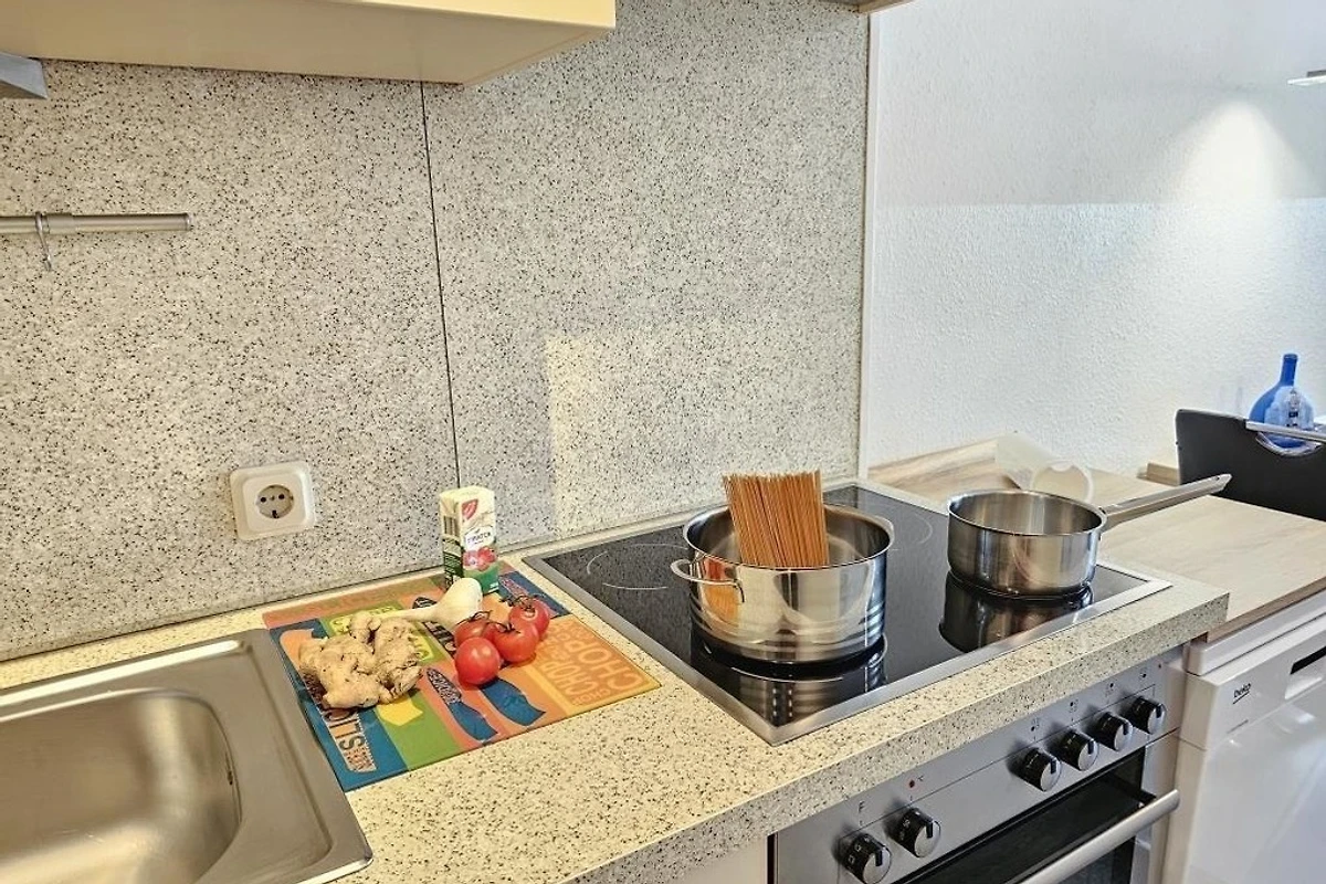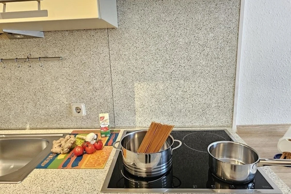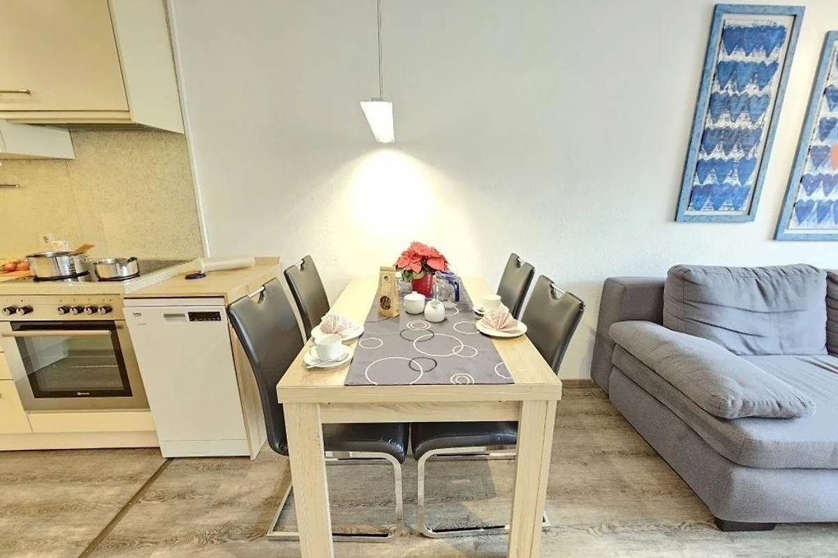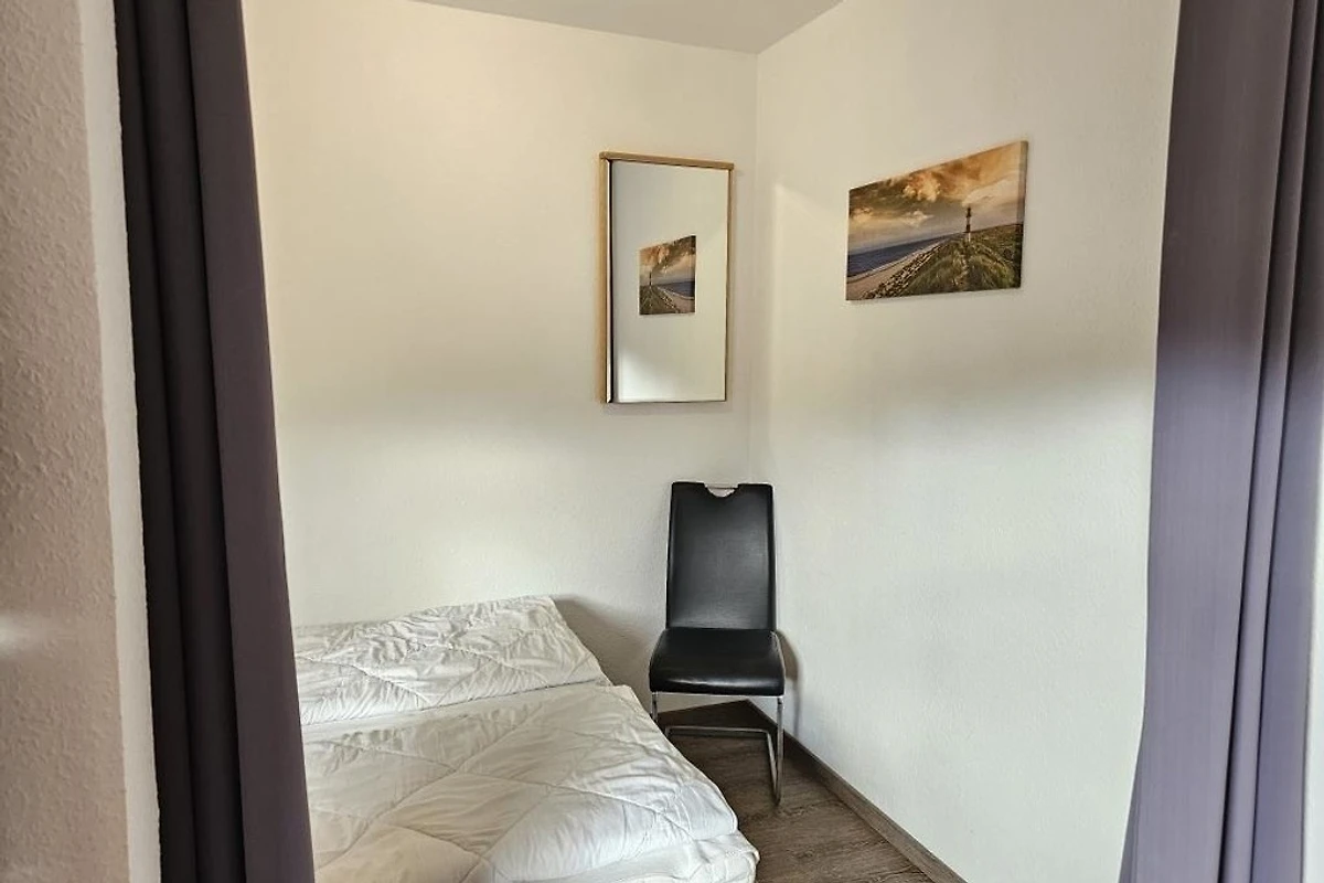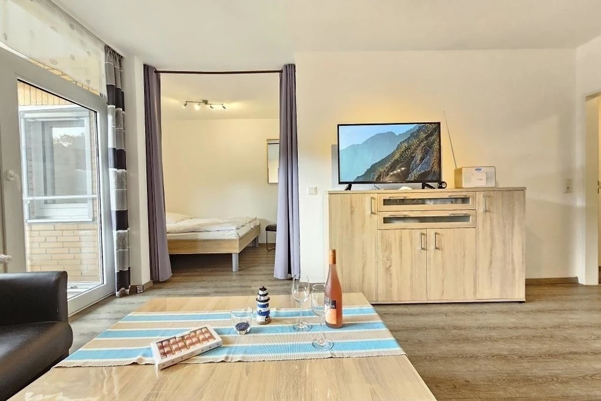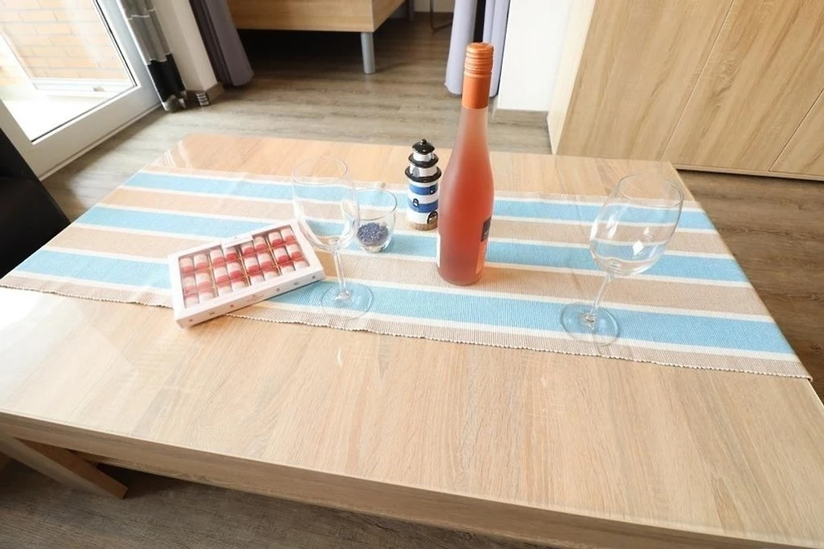 In dieser Ferienwohnung steht Ihnen ein Wohnraum mit einem Doppelbett 1,60mx2m zur Verfügung. Am Wohnraum befindet sich ein Balkon mit Sitzgelegenheit. 1 TV und ein kostenloser WLAN-Hotspot steht Ihnen zur Unterhaltung zur Verfügung. In der neuen Küchenzeile finden Sie einen Backofen, Kühlschrank mit Gefrierfach und einen Geschirrspüler. Da lassen sich einige Köstlichkeiten zubereiten und man kann kochen und miteinander schnacken wunderbar verbinden. Das Badezimmer verfügt über Badewanne und ein WC.