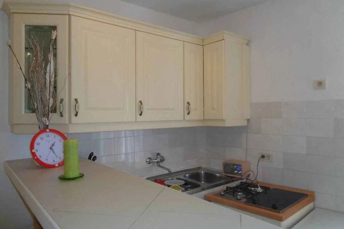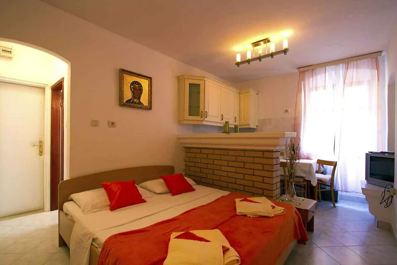 Wohnzimmer mit 1 Doppelbett, TV und Klimaanlage. Kochecke in der Wohnküche mit Gasherd und Kühlschrank. Bad mit Dusche, 1 Waschbecken und WC.