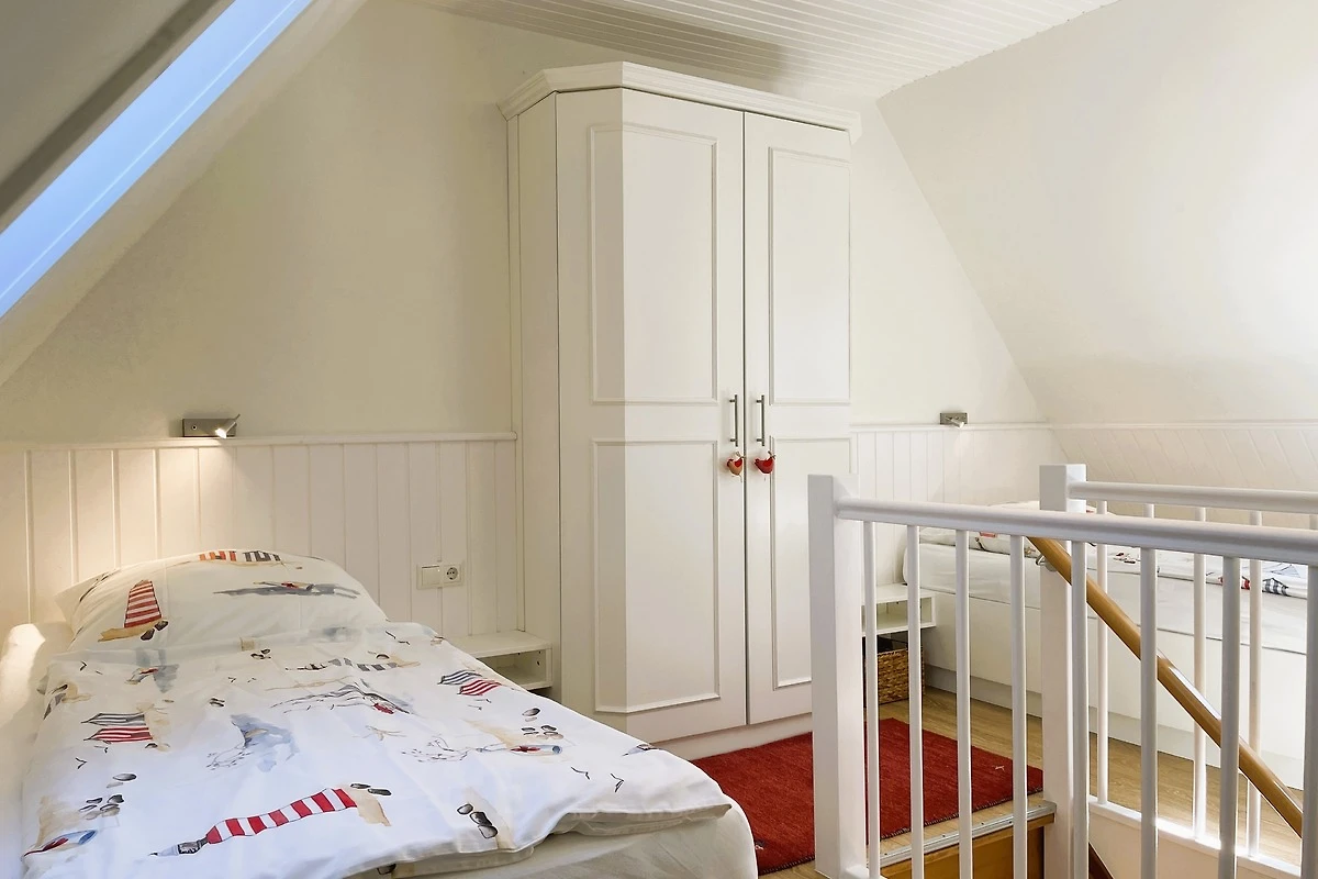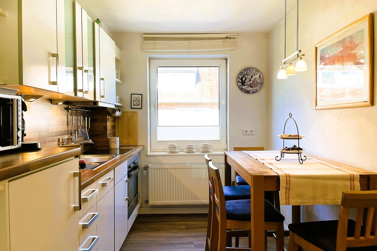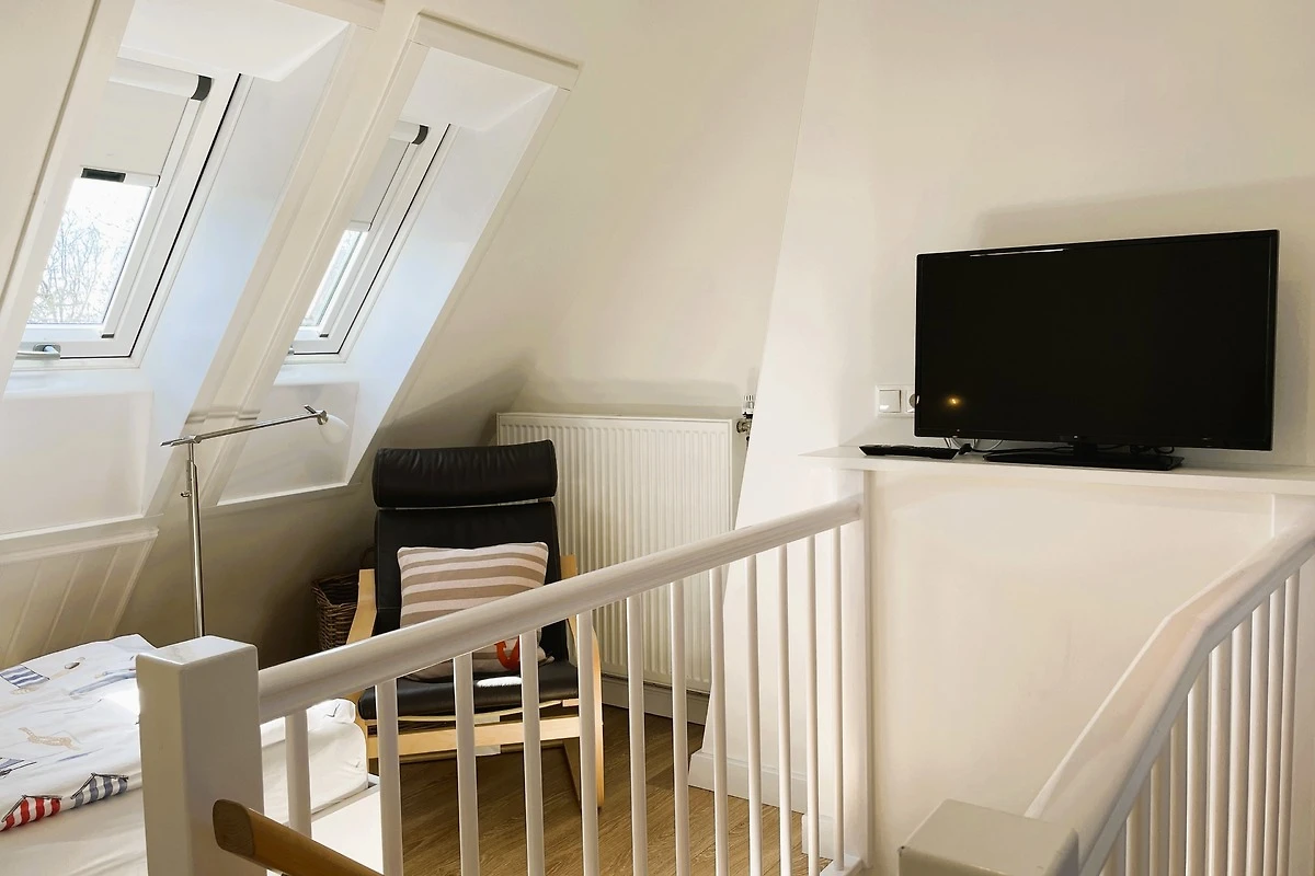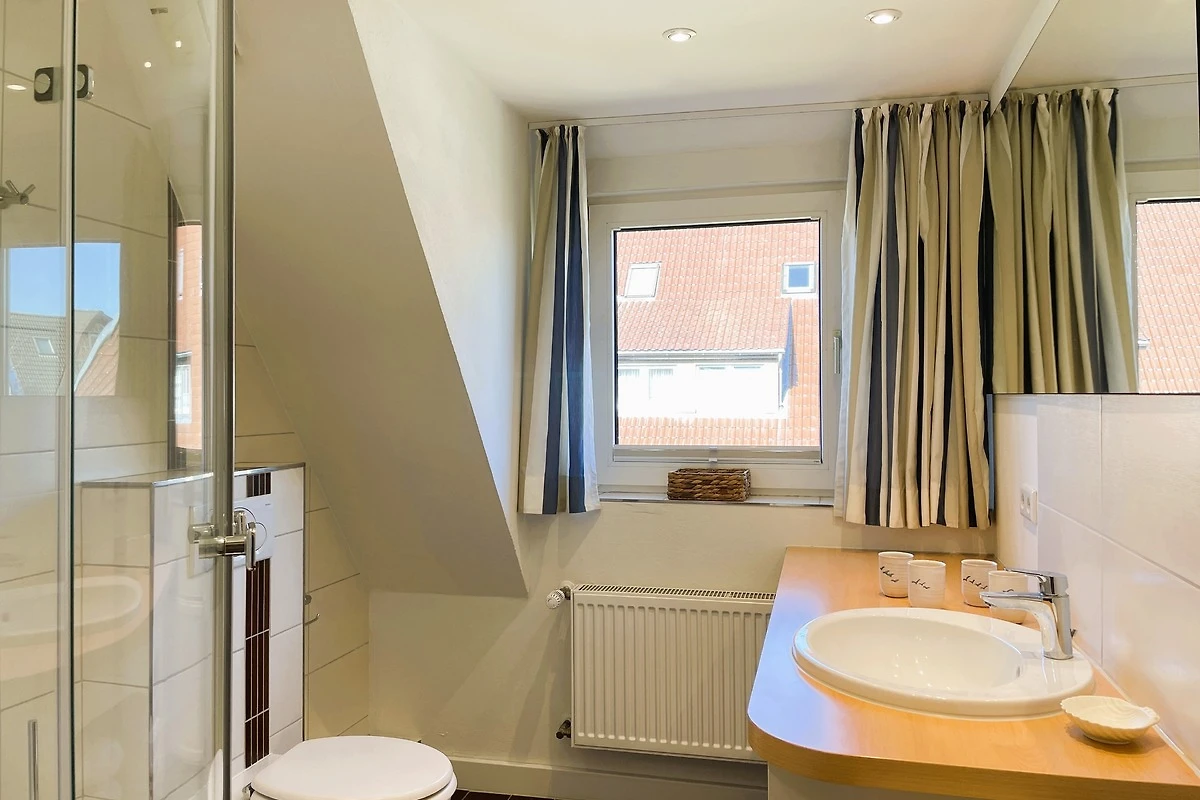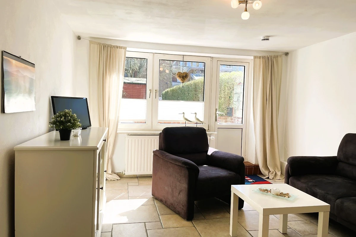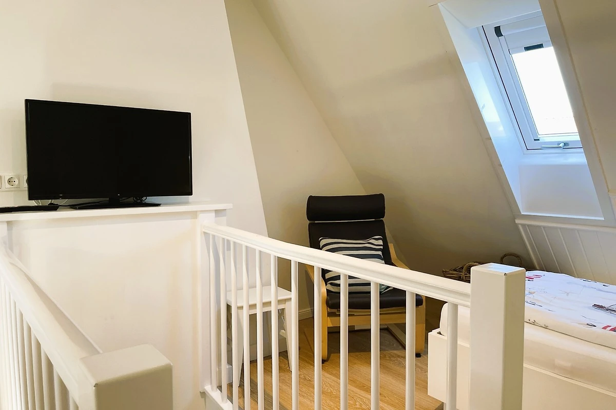 Entdecken Sie Ihren Traumurlaub in der exquisiten Ferienwohnung "Leuchtturm" auf der malerischen Insel Föhr! Diese charmante Unterkunft im Herzen von Wyk bietet Ihnen den perfekten Rückzugsort für bis zu 4 Personen. Verteilt über vier Etagen erwartet Sie ein herrliches Domizil: Im Hochparterre geniessen Sie die hochwertige Einbauküche und das gemütliche Wohnzimmer mit Parkettboden. Eine Etage höher finden Sie ein geschmackvolles Duschbad mit ebenerdiger Dusche, ein separates Gäste-WC sowie das Elternschlafzimmer mit Doppelbett, während im Dachgeschoss das zweite Schlafzimmer mit zwei Einzelbetten das ideale eigene Reich für Kinder ist. Im Souterrain steht Ihnen neben einem zweiten Bad mit ebenerdiger Dusche ein Lesezimmer als Rückzugsort mit direktem Zugang zur Terrasse und zum kleinen Garten zur Verfügung, ideal für entspannte Stunden im Freien. Unser "Leuchtturm" lässt keine Wünsche offen: Moderne Technik wie Flachbild-TV sowohl im Wohnzimmer, in den beiden Schlafzimmern und im Leseraum sowie eine Musikanlage und WLAN sorgen für Unterhaltung. Eine Waschmaschine und ein Trockner sind ebenfalls vorhanden und kostenfrei nutzbar. Zentral und dennoch ruhig gelegen, bietet die Ferienwohnung "Leuchtturm" den idealen Ausgangspunkt für Ihre Entdeckungstouren auf Föhr. Der kurze Weg zum Strand lädt zu ausgedehnten Spaziergängen und erholsamen Stunden am Meer ein. Erleben Sie unvergessliche Momente in dieser geschmackvoll eingerichteten Ferienwohnung, die mit ihrer hochwertigen Ausstattung und Ihrem Charme begeistert. Ihr Traumurlaub beginnt hier, im "Leuchtturm" – Ihrem Zuhause auf Zeit!