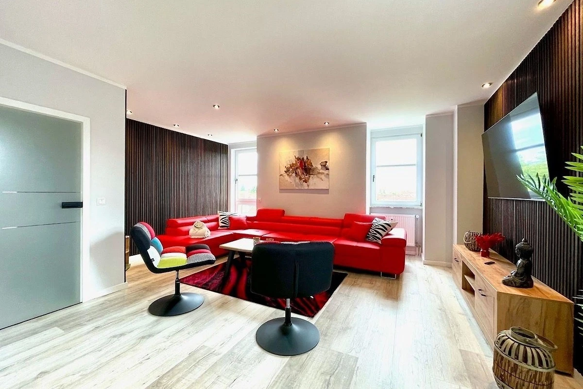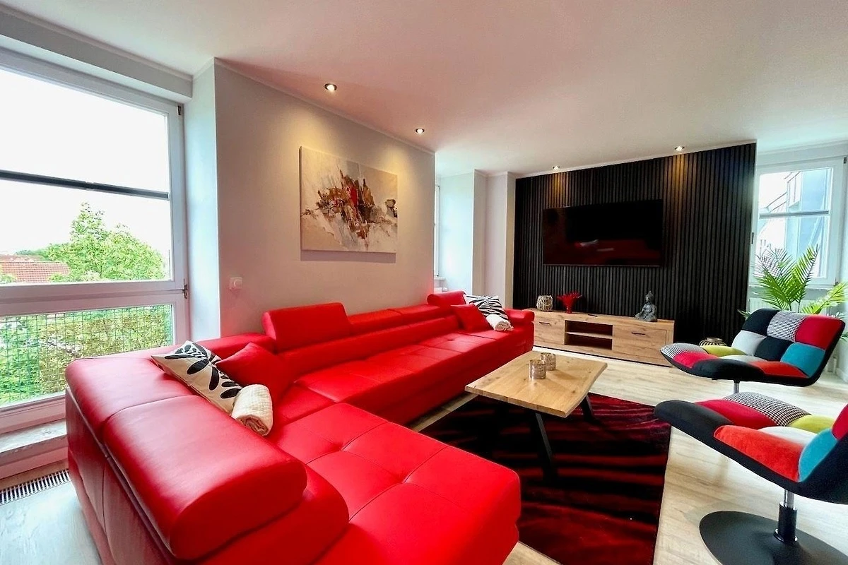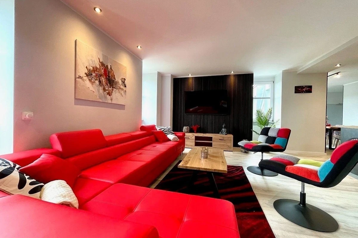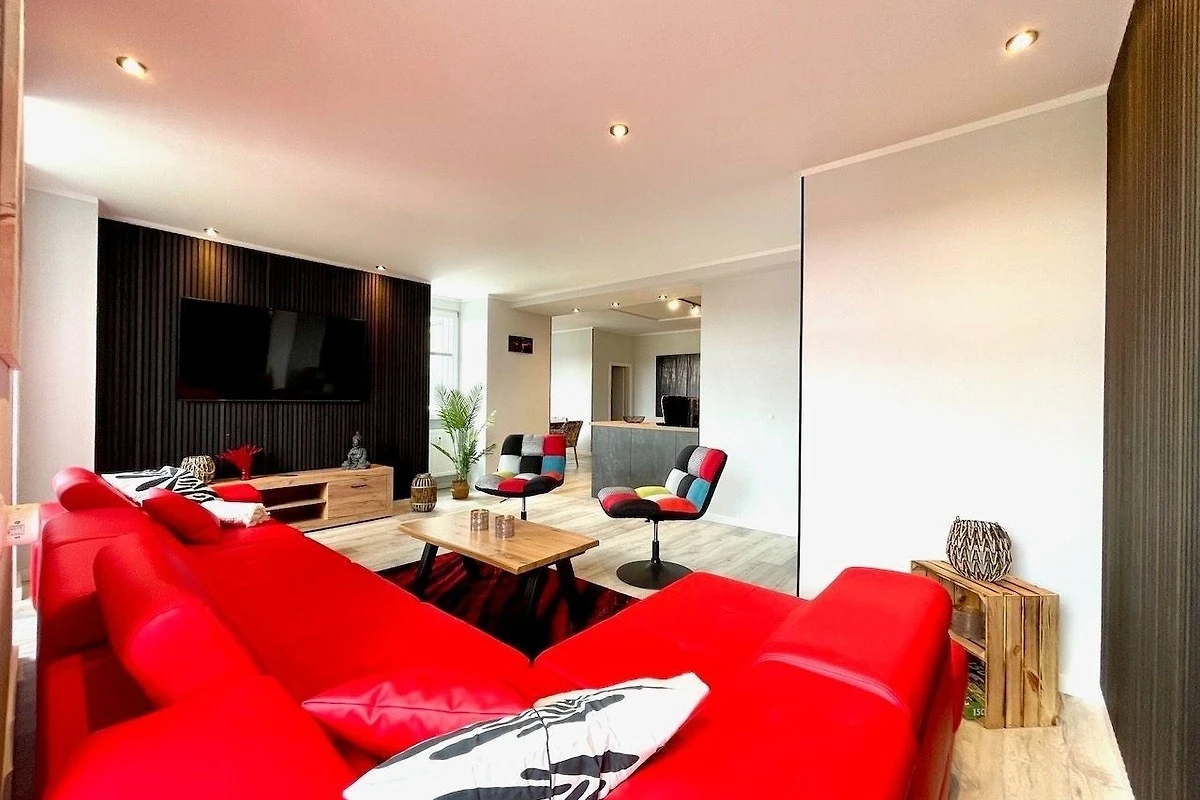 In dem offenen Wohnbereich, lädt eine grosse, rote Eckcouch, mit genügend Platz für alle Gäste, zum Verweilen und Entspannen ein.