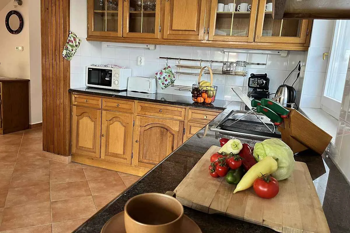 Erdgeschoss: Esszimmer mit Essecke (8 Plätze). Schlafzimmer mit 2 Einzelbetten. Schlafzimmer mit 1 Doppelbett und TV. Amerikanische Küche mit Elektroherd (Cerankochfeld, 4 Platten), Backofen, Dunstabzugshaube, Geschirrspüler, Kühlschrank (120 l, Eisfach), Mikrowelle, Kaffeemaschine, Toaster und elektrischem Wasserkocher. Bad mit Waschmaschine, Dusche, 1 Waschbecken, WC und Fenster.