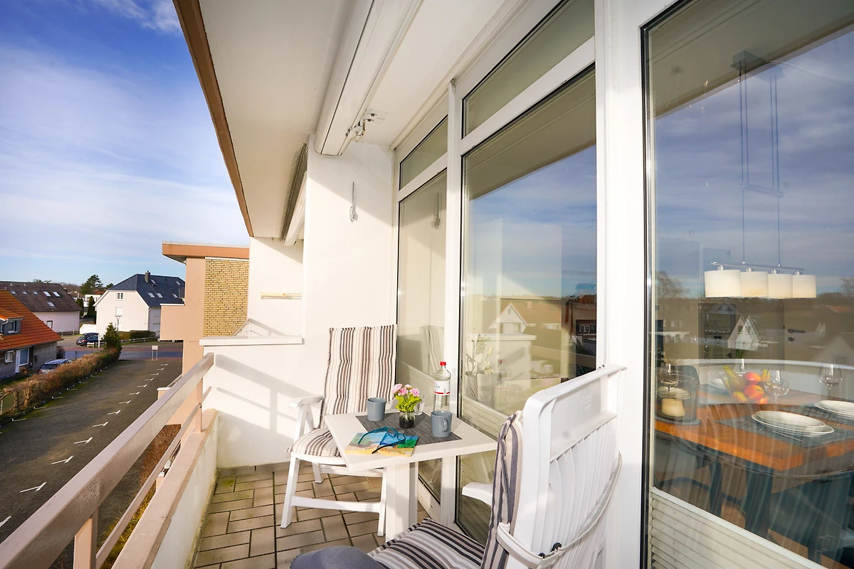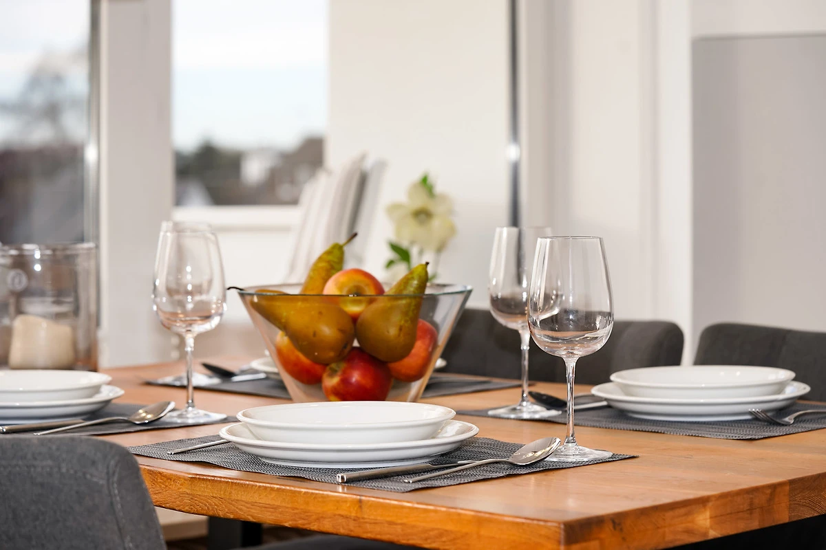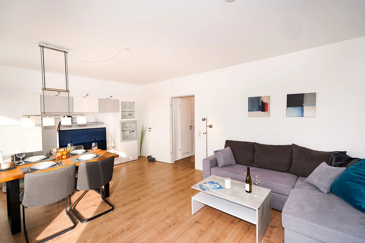 Das geräumige Wohn-/ Esszimmer ist mit einem gemütlichen Ecksofa (Schlafsofa 150x200) mit Couchtisch sowie einem Essplatz für 4 Personen ausgestattet. Für Ihre mediale Unterhaltung stehen ein grosser Flat-TV, ein DVD-Player sowie eine Stereoanlage bereit. W-LAN ist hier kostenfrei verfügbar. Der von hier erreichbare Balkon erstreckt sich über die gesamte Breite der Wohnung und lädt zu entspannten Abendstunden ein.