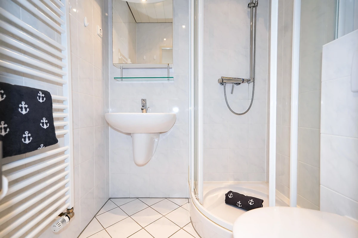 Das moderne Bad bietet Ihnen eine Eckdusche, WC und Waschtisch. Ihre Utensilien finden Bequem im Spiegelschrank Platz. Der Handtuchheizkörper sorgt für wohlige Wärme an kalten Tagen.