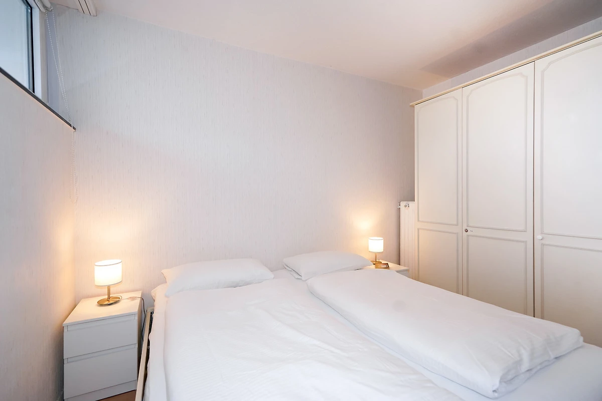 Das helle Schlafzimmer ist mit einem grossen Kleiderschrank sowie einem Doppelbett (2x 90x200cm) mit hochwertigen Matratzen ausgestattet. Die Fenster lassen sich mit Vorhängen abdunkeln.