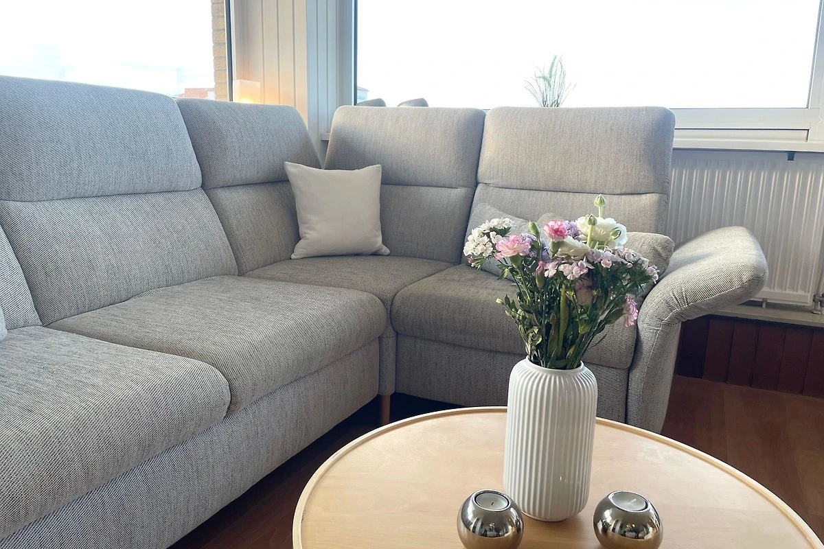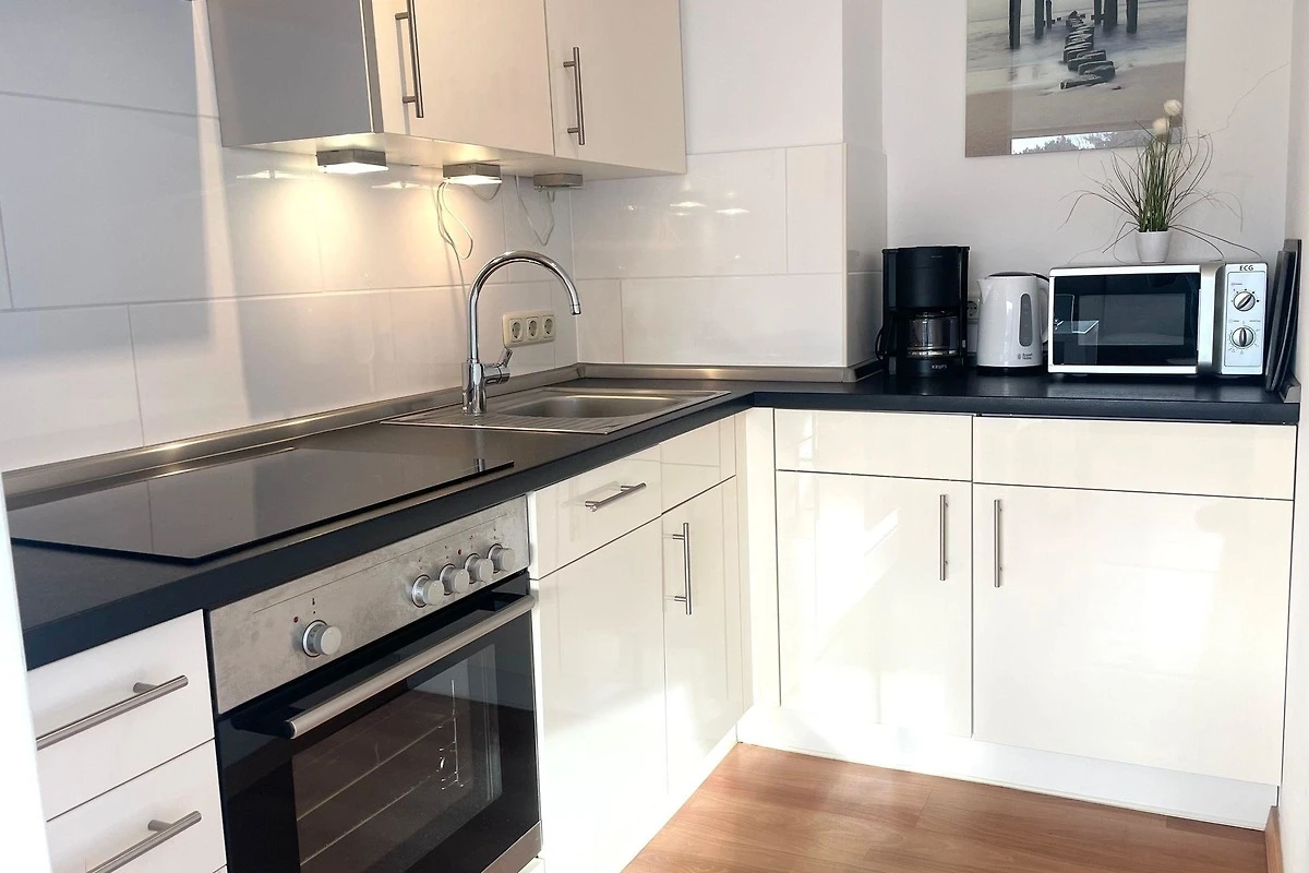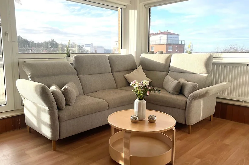 Die Ferienwohnung im Apartmenthaus Frauenpreiss FeWo 307 ist eine moderne 2-Zimmer-Wohnung mit einer Grösse von 47 m², die Platz für bis zu vier Gäste bietet. Sie befindet sich im dritten Stock und verfügt über ein offenes Wohnkonzept, das eine gemütliche Atmosphäre schafft. Der Wohnbereich lädt mit einem Sofa und einem Esstisch zum Entspannen ein und bietet einen grossartigen Blick auf die Landschaft und das Meer. Eine gut ausgestattete Küche enthält Herd, Backofen, Spülmaschine und Kaffeemaschine, perfekt für die Zubereitung von Mahlzeiten.