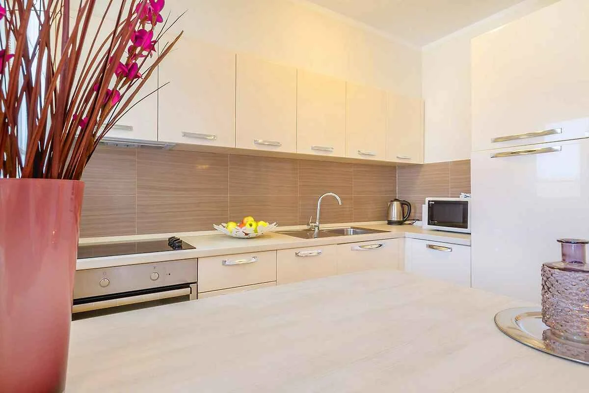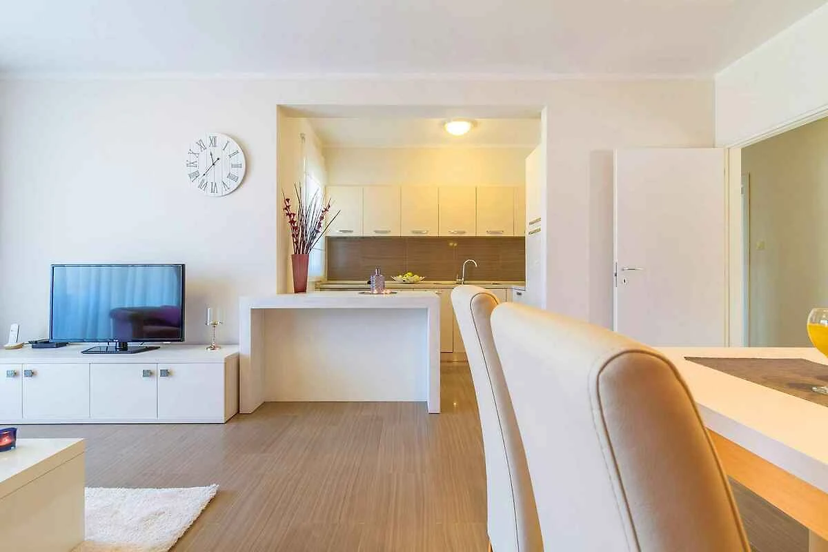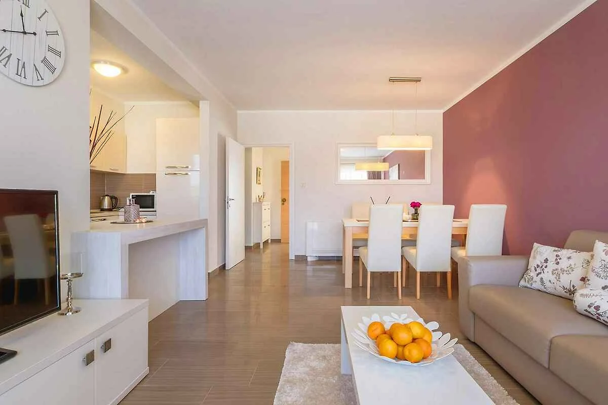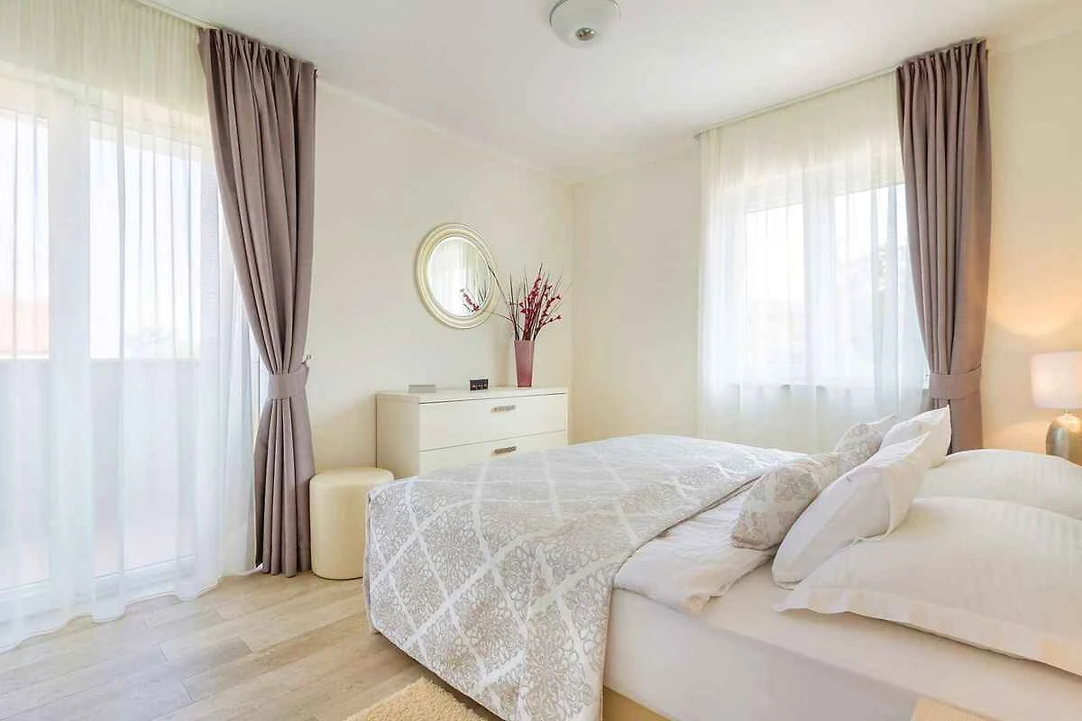 Malinska. Die Ferienwohnung befindet sich auf einem geschlossenen Gartengrundstück mit Blumen und Bäumen, von einem Zaun begrenzt. Die Zufahrt erfolgt über einen Weg (asphaltiert). Parkplatz auf dem Grundstück.