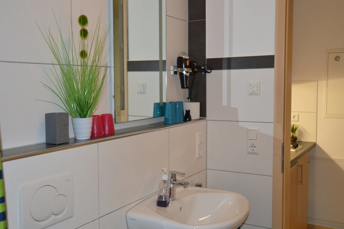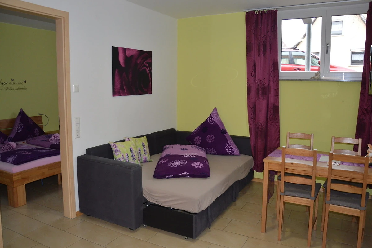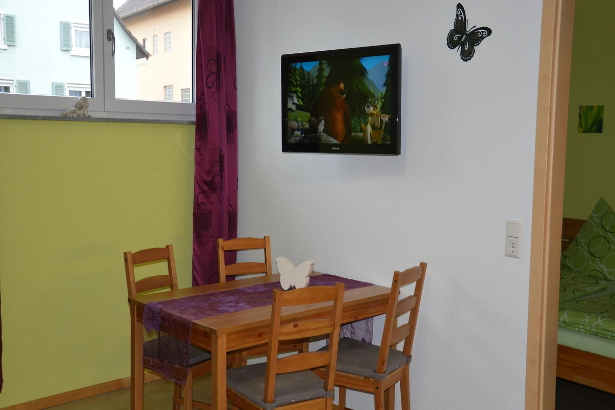 Nach einem aufregenden Tag können Sie im Wohnzimmer in der gemütlichen Couchecke richtig entspannen. Ein Flachbildschirm verspricht ruhige Fernsehabende in schöner Atmosphäre. WLAN ist in der Ferienwohnung vorhanden. Den WLAN-Code erhalten Sie auf Nachfrage.