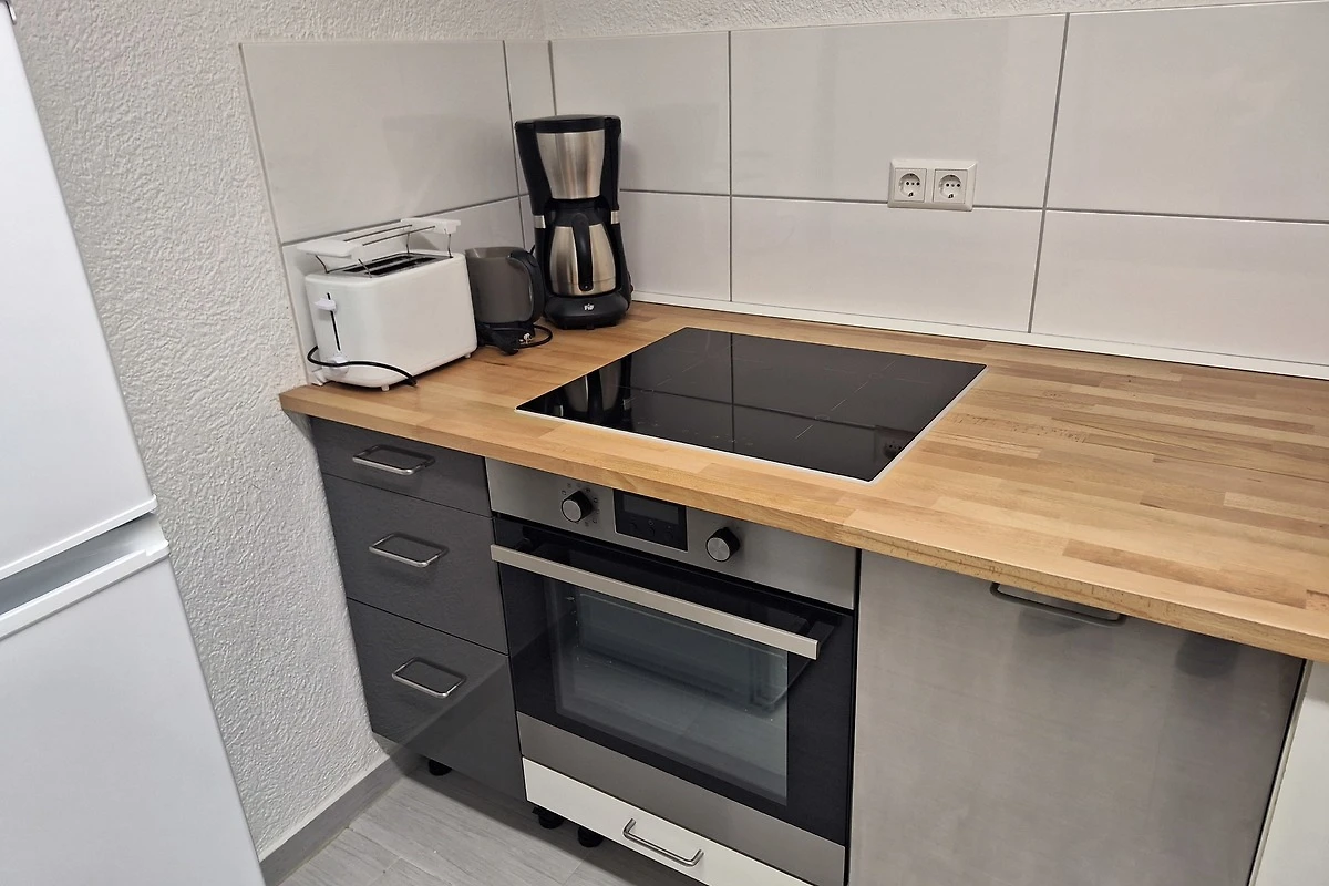 Die toll ausgestattete Küche bietet nicht nur einen Kühlschrank und Ofen, sondern auch eine Mikrowelle und Kaffeemaschine!
