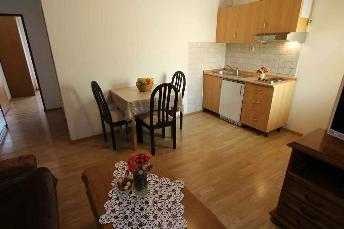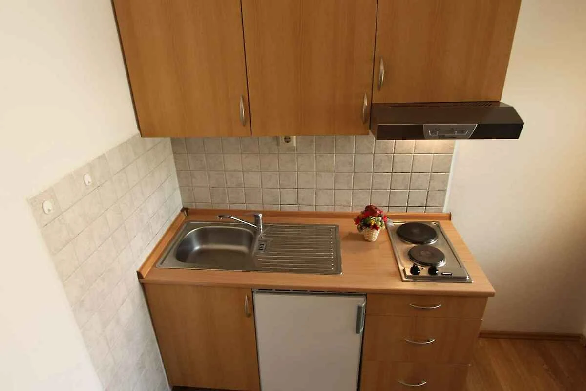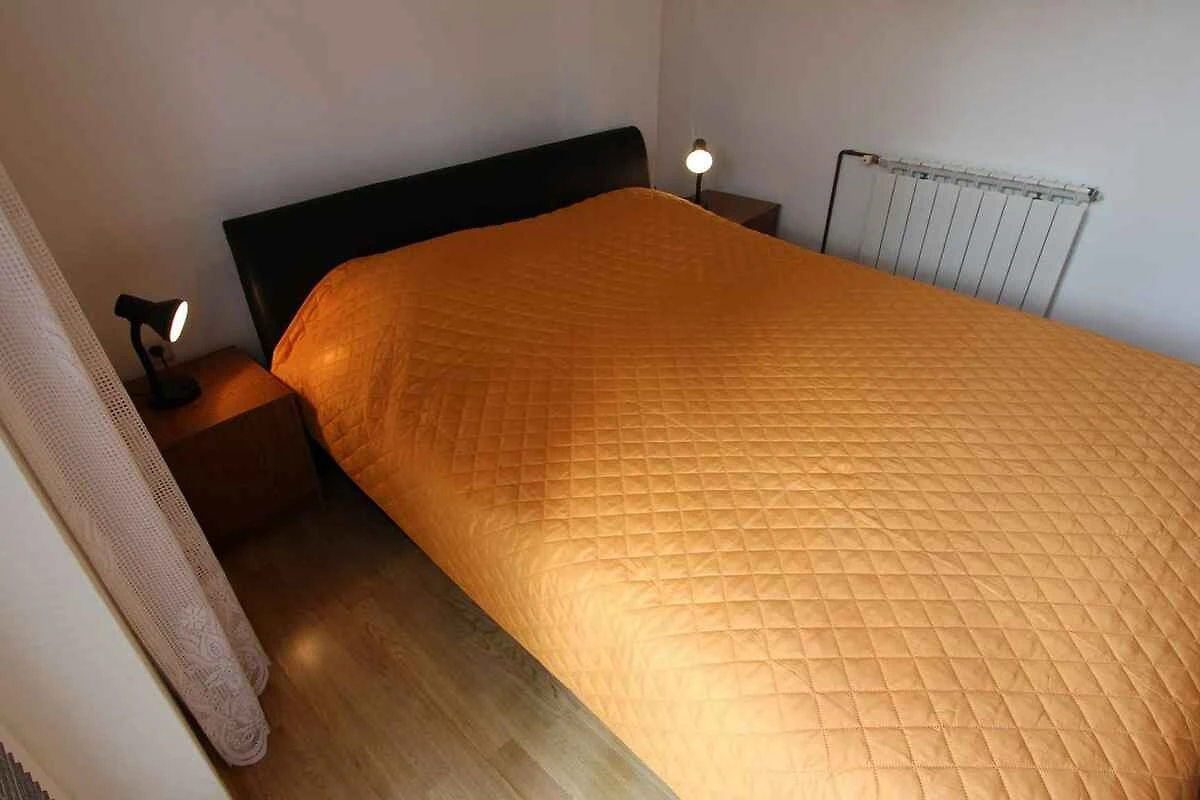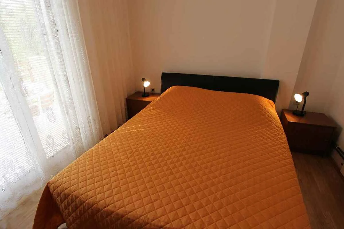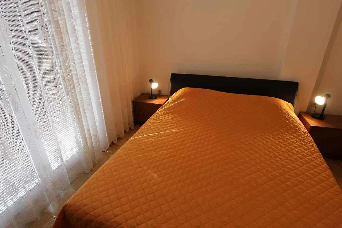 . Wohnzimmer mit 1 Zusatzbett auf Couch/Sofa, TV und Zugang zum Balkon. Schlafzimmer mit 1 Doppelbett. Kochecke im Wohnzimmer mit Elektroherd (2 Platten) und Kühlschrank (Eisfach). Bad mit Dusche und WC.