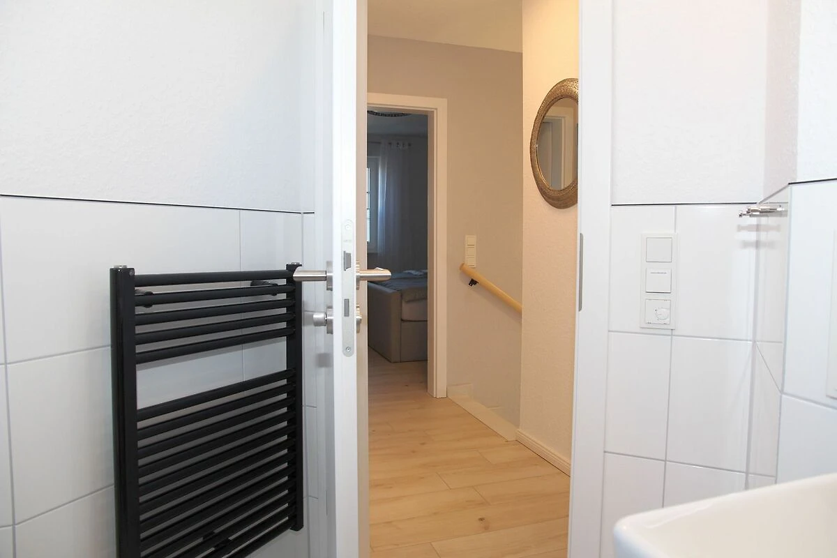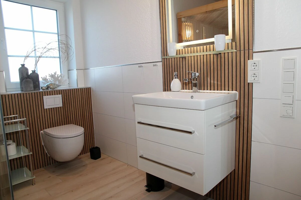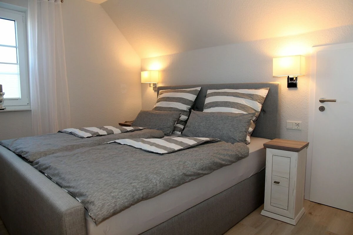 Das Haus bietet Ihnen insgesamt drei Schlafzimmer, die mit flauschigen Betten und viel Stauraum ausgestattet sind. Sie sind der perfekte Rückzugsort für eine erholsame Nachtruhe. Eines der Schlafzimmer befindet sich mit zwei einzelnen Boxspringbetten, Kleiderschrank und TV im Erdgeschoss, die beiden weiteren Schlafzimmer befinden sich mit jeweils einem Doppelboxspringbett (1x 1,80 m, 1x 1,60 m), Kleiderschrank (einmal sogar begehbar) und TV im Obergeschoss. Zudem stehen Ihnen zwei moderne Badezimmer zur Verfügung, die mit großen bodengleichen Duschen, Handtuchheizkörper, Föhn, WC und Waschbecken ausgestattet sind. Das große Badezimmer im Erdgeschoss bietet darüber hinaus noch die Sauna, eine Waschmaschine und einen Trockner.