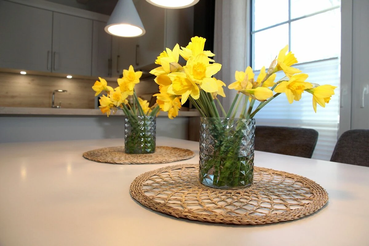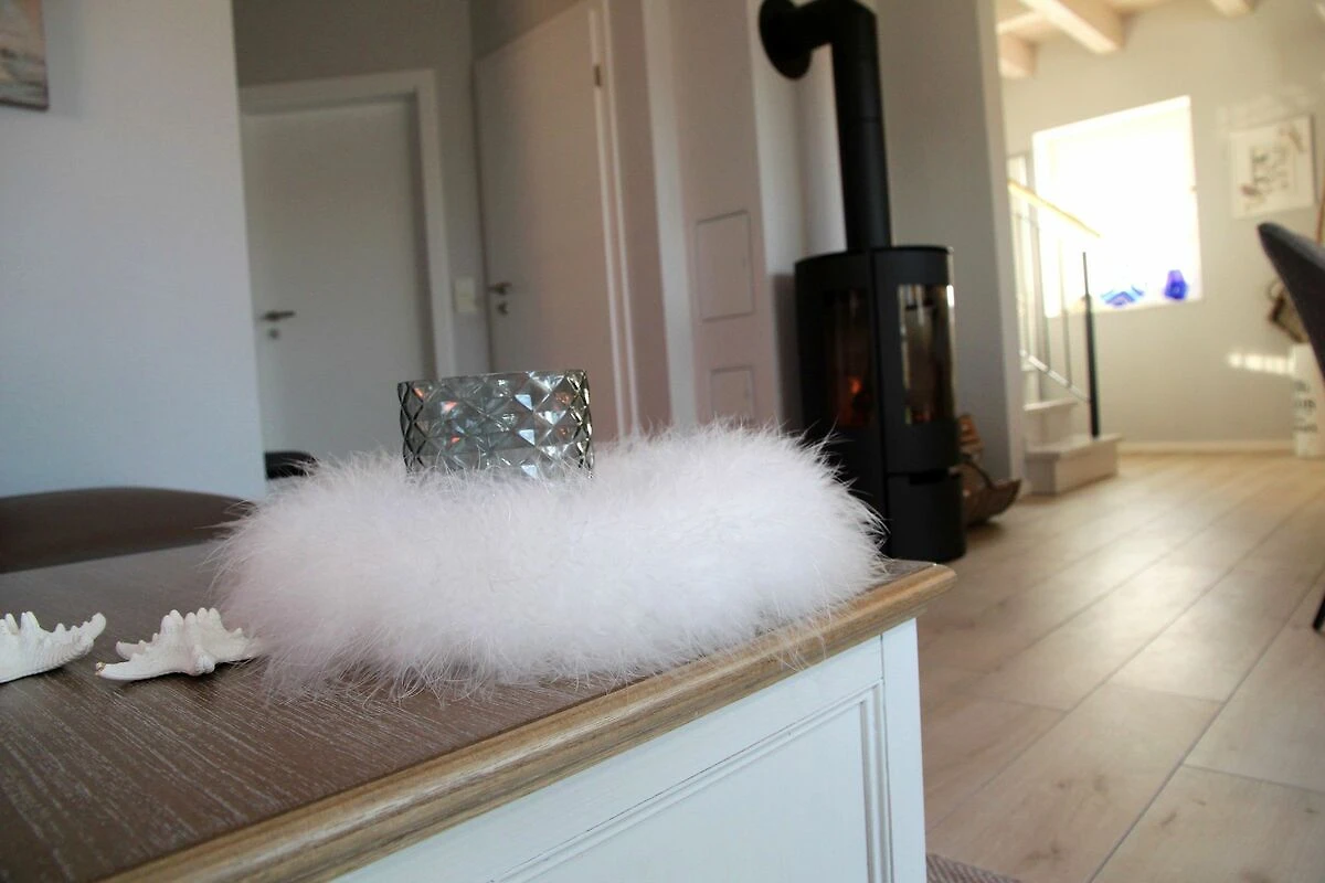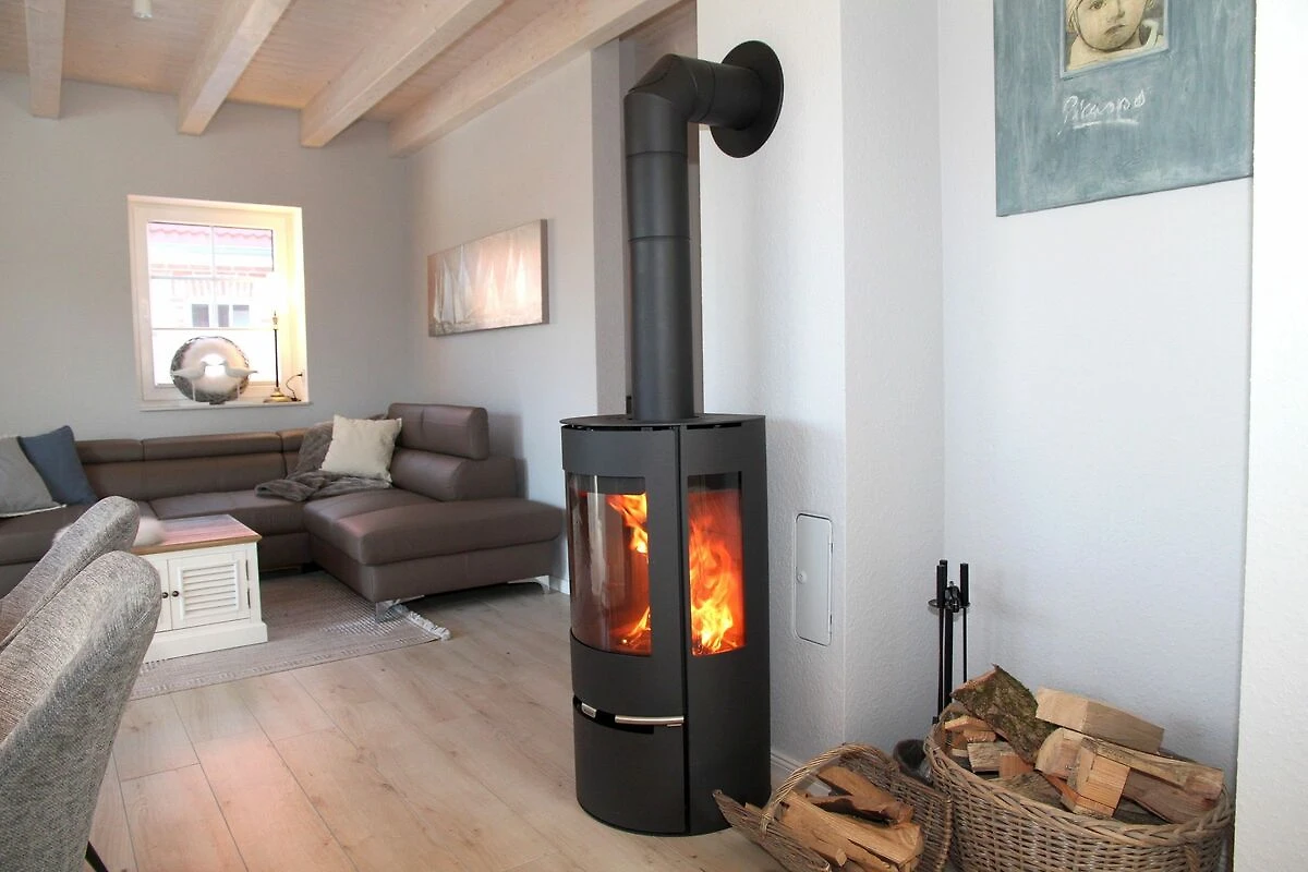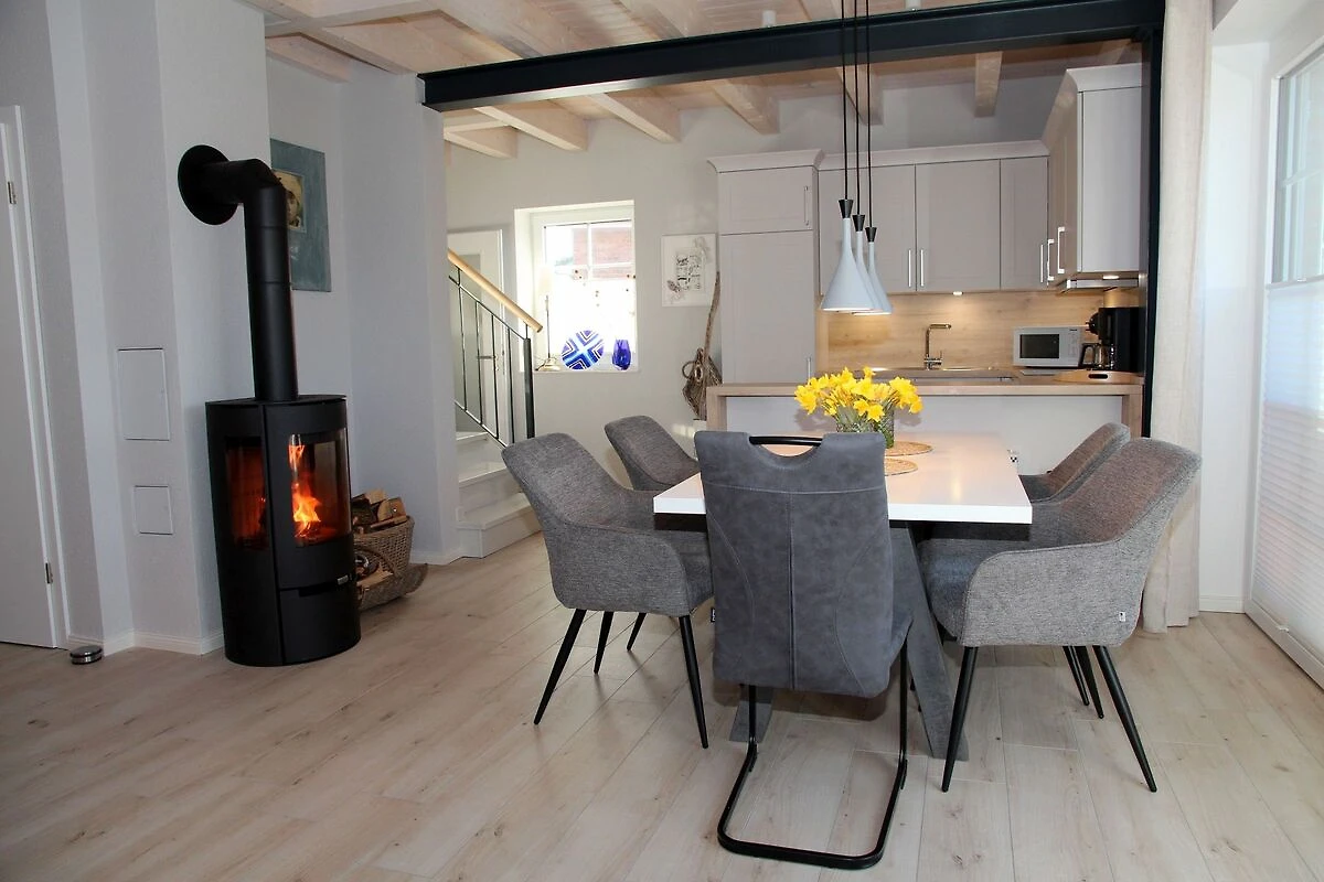 Schon beim Betreten der Unterkunft werden Sie von der hellen, freundlichen Atmosphäre begeistert sein. Die offene Küche, die nahtlos in das geräumige Wohnzimmer übergeht, ist perfekt ausgestattet und lässt keine Wünsche offen. Kochen Sie mit Ihren Liebsten in der modernen Küche mit hochwertigen Geräten wie Herd, Backofen, Kühlschrank mit Gefrierfach, Geschirrspüler, Wasserkocher, Toaster, Eierkocher, Kaffeemaschine und einer praktischen Espressomaschine (Dolce Gusto). Der Essbereich mit Platz für 6 Personen lädt zu geselligen Dinnerabenden ein, während die Sofaecke mit schönem L-Sofa und Kaminofen im Wohnzimmer zum Entspannen und Verweilen einlädt. Genießen Sie gemeinsame Abende bei einem Filmabend auf dem Fernseher oder stöbern Sie in den bereitgestellten Büchern.