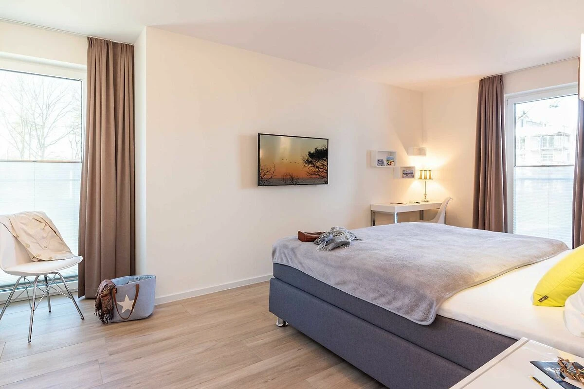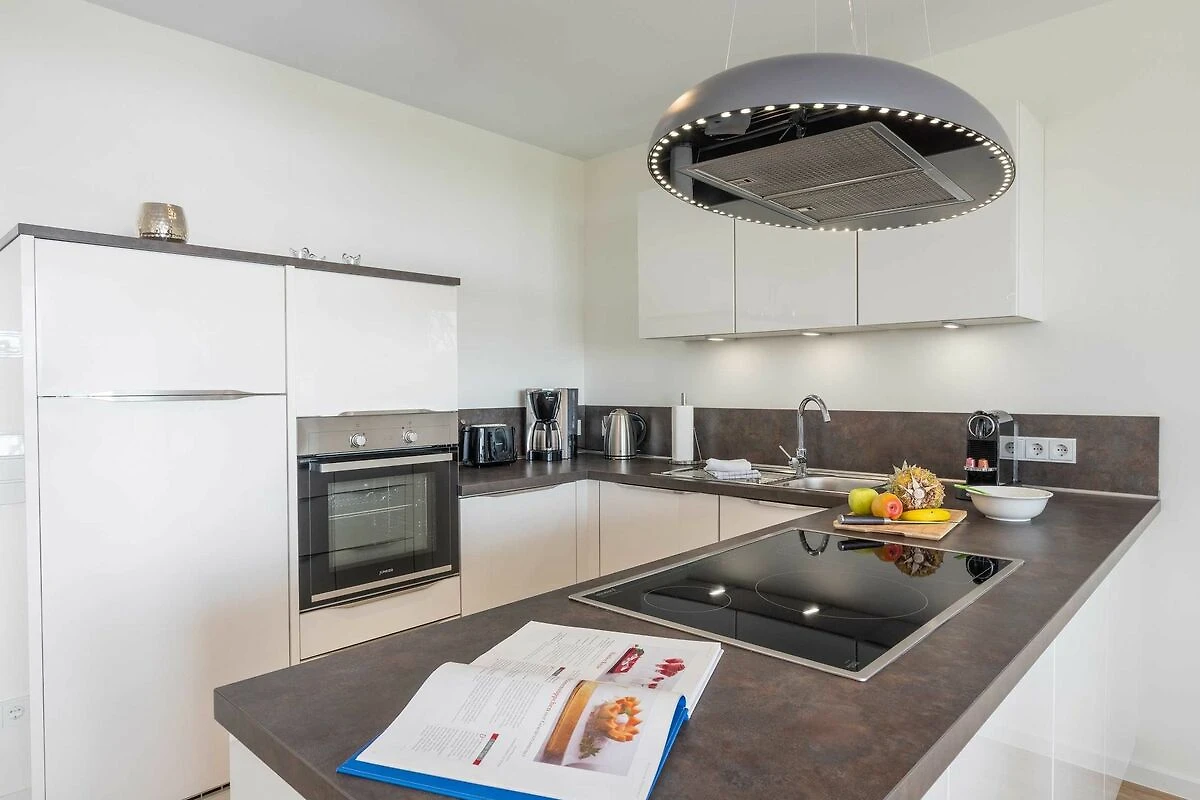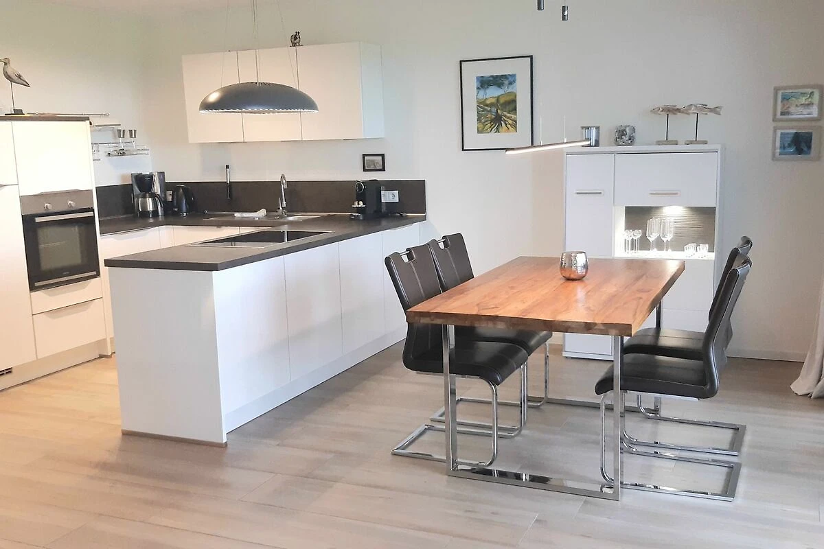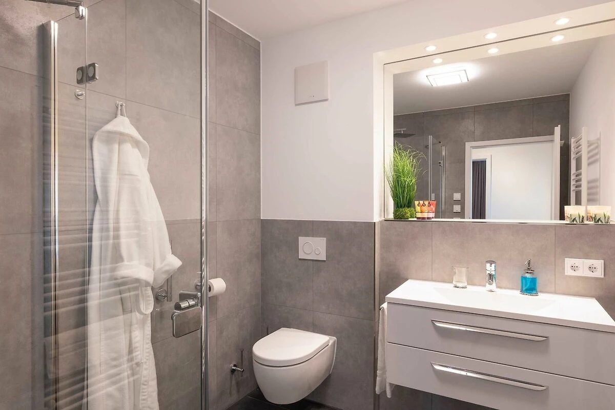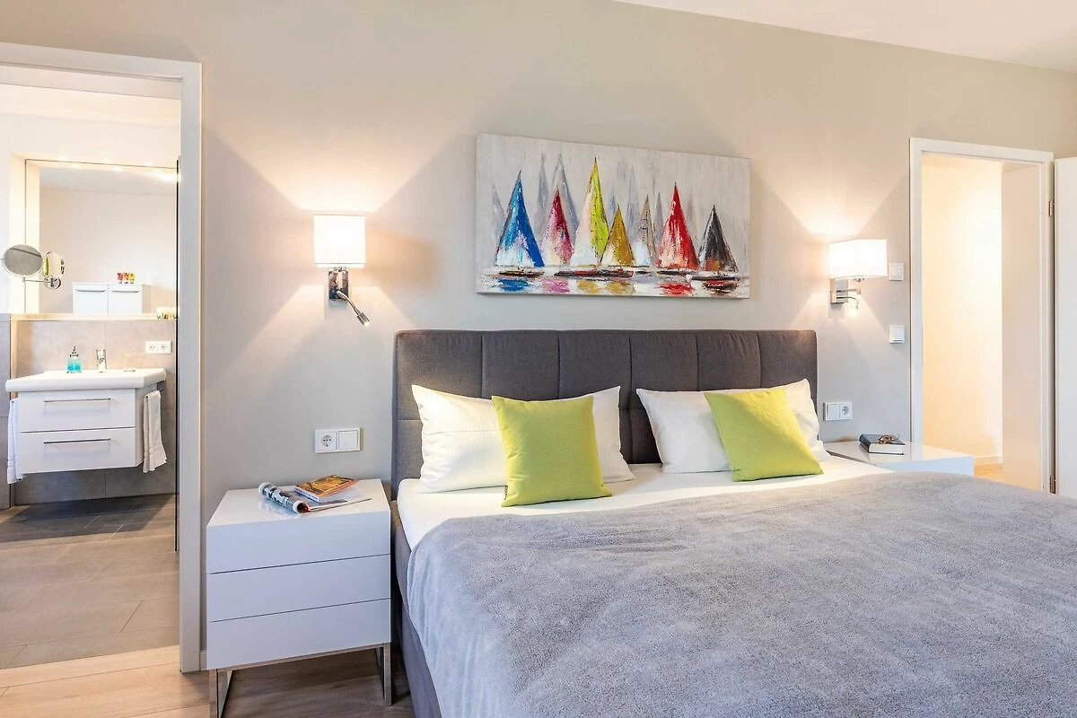 Diese luxuriöse 3-Zimmer-Wohnung im Erdgeschoss von Haus 6 mit Platz für maximal 4 Personen sowie einem Kleinkind bis 2 Jahre im Babybett verfügt über eine Wohnfläche von 101 m² und hat 2 Schlafzimmer sowie 2 voll ausgestattete Duschbäder. Die grosse Sonnenterrasse mit 21 m² liegt in idealer Süd-Ausrichtung. Die Wohnung ist modern eingerichtet mit offenem Wohn-Essbereich, grossem Esstisch, Ledersofa sowie Smart-TV (inkl. Sky-Abo). Die hochwertig ausgestattete Küche, offen zum Wohnbereich, lässt keine Wünsche offen. Erholsamer Schlaf in den beiden Schlafzimmern mit Boxspringbetten und Smart-TV ist garantiert. Das Badezimmer en Suite ist mit einer begehbaren Dusche ausgestattet. Auf der grossen, überdachten Sonnenterrasse mit Essgruppe und jeweils zwei Relax-Sesseln, Fusshockern, Sonnenschirm und Sonnenliegen können Sie die Seele baumeln lassen.