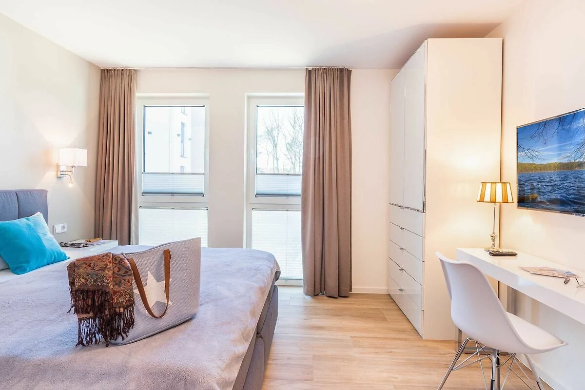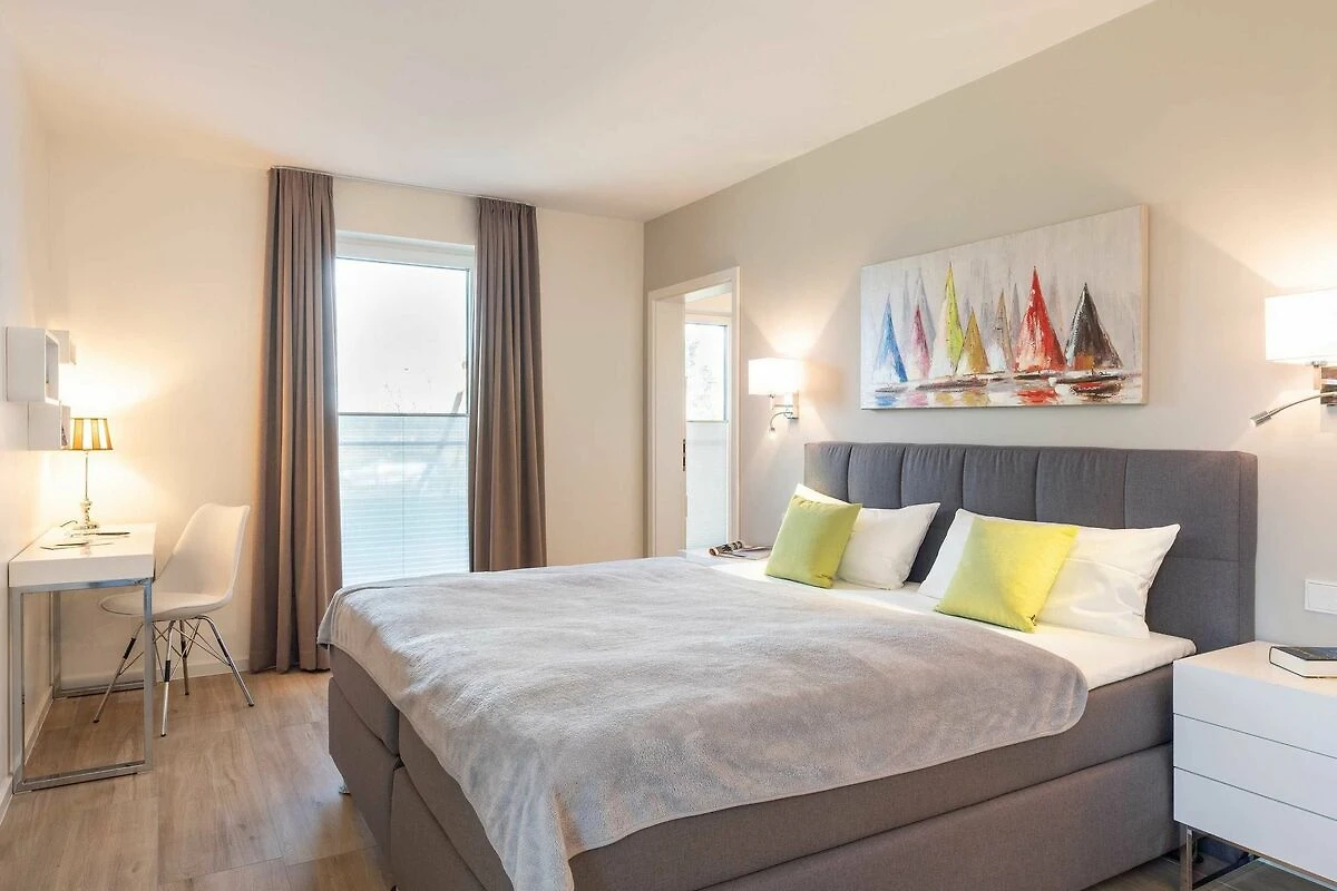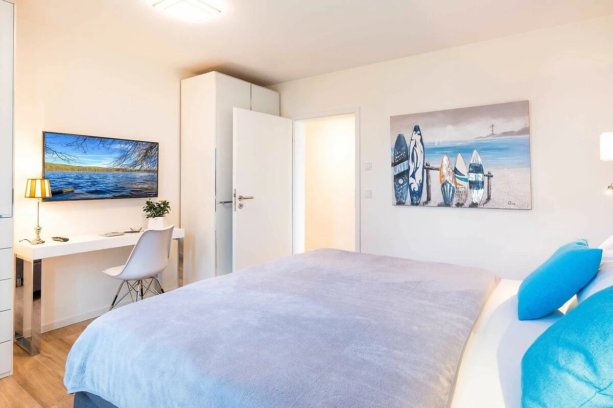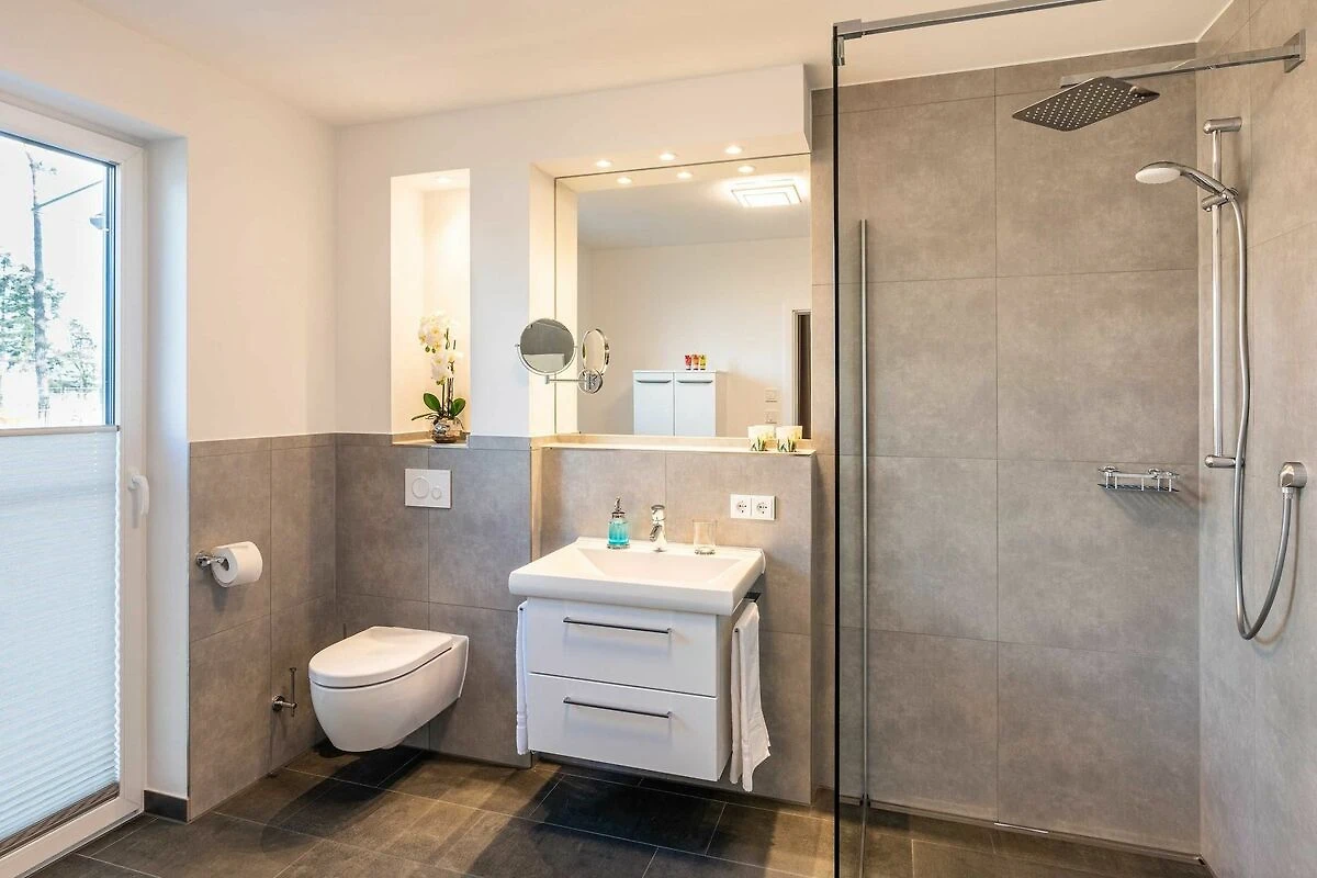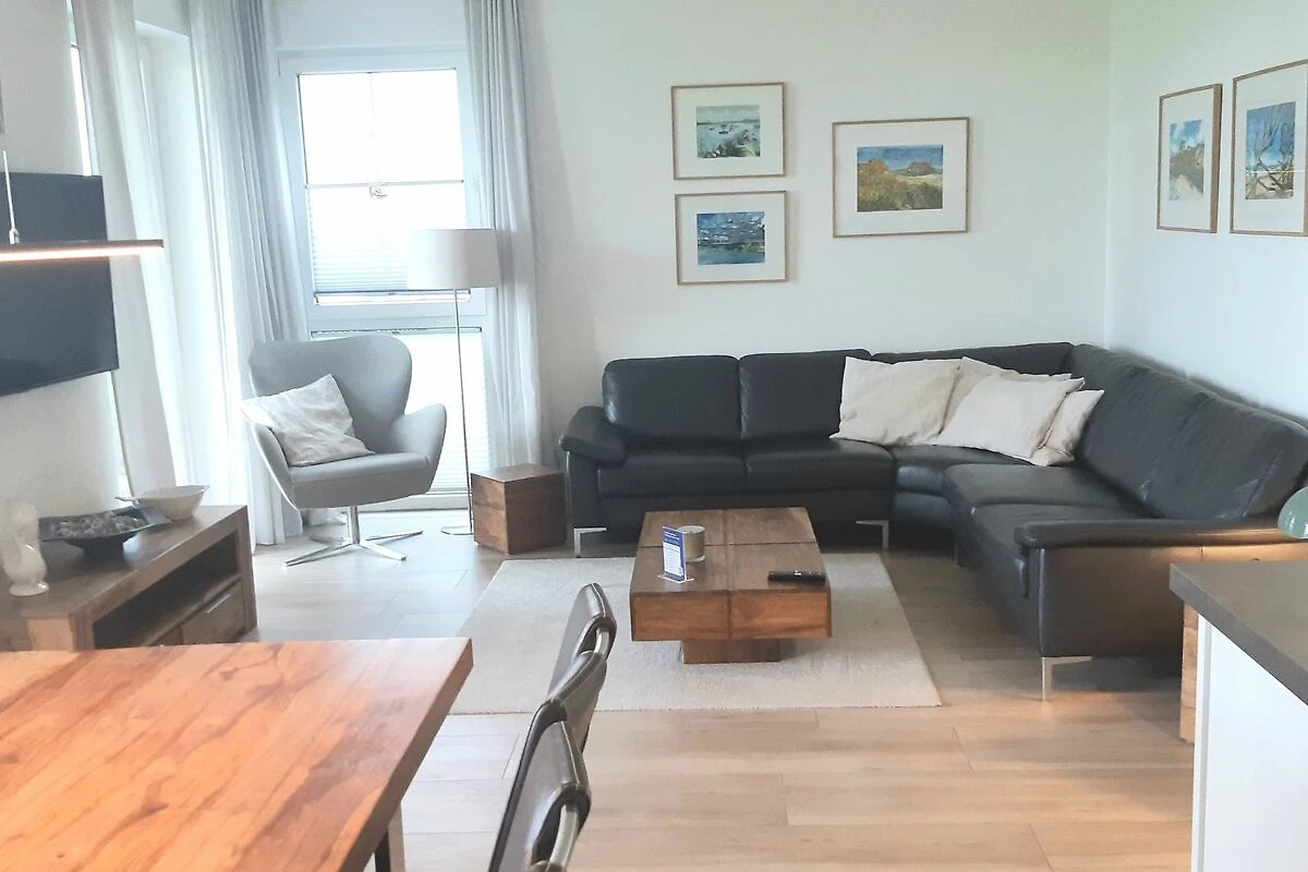 Diese luxuriöse 3-Zimmer-Wohnung im Erdgeschoss von Haus 6 mit Platz für maximal 4 Personen sowie einem Kleinkind bis 2 Jahre im Babybett verfügt über eine Wohnfläche von 101 m² und hat 2 Schlafzimmer sowie 2 voll ausgestattete Duschbäder. Die grosse Sonnenterrasse mit 21 m² liegt in idealer Süd-Ausrichtung. Die Wohnung ist modern eingerichtet mit offenem Wohn-Essbereich, grossem Esstisch, Ledersofa sowie Smart-TV (inkl. Sky-Abo). Die hochwertig ausgestattete Küche, offen zum Wohnbereich, lässt keine Wünsche offen. Erholsamer Schlaf in den beiden Schlafzimmern mit Boxspringbetten und Smart-TV ist garantiert. Das Badezimmer en Suite ist mit einer begehbaren Dusche ausgestattet. Auf der grossen, überdachten Sonnenterrasse mit Essgruppe und jeweils zwei Relax-Sesseln, Fusshockern, Sonnenschirm und Sonnenliegen können Sie die Seele baumeln lassen.