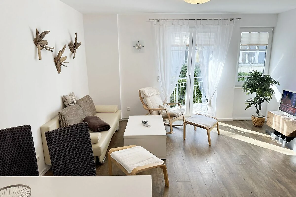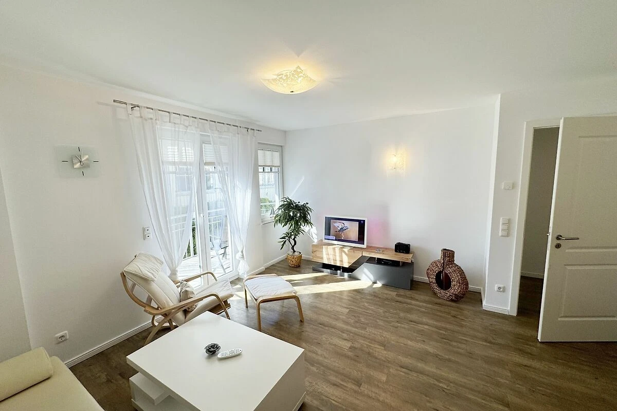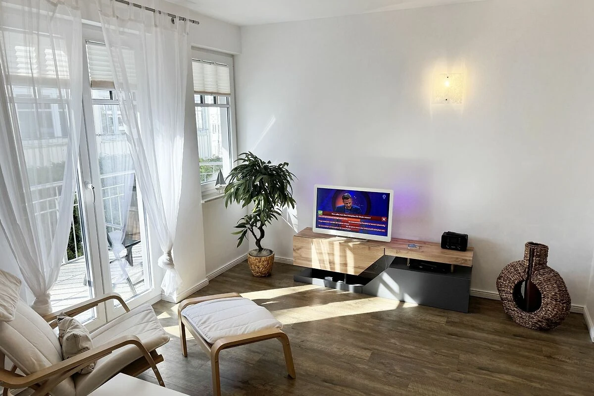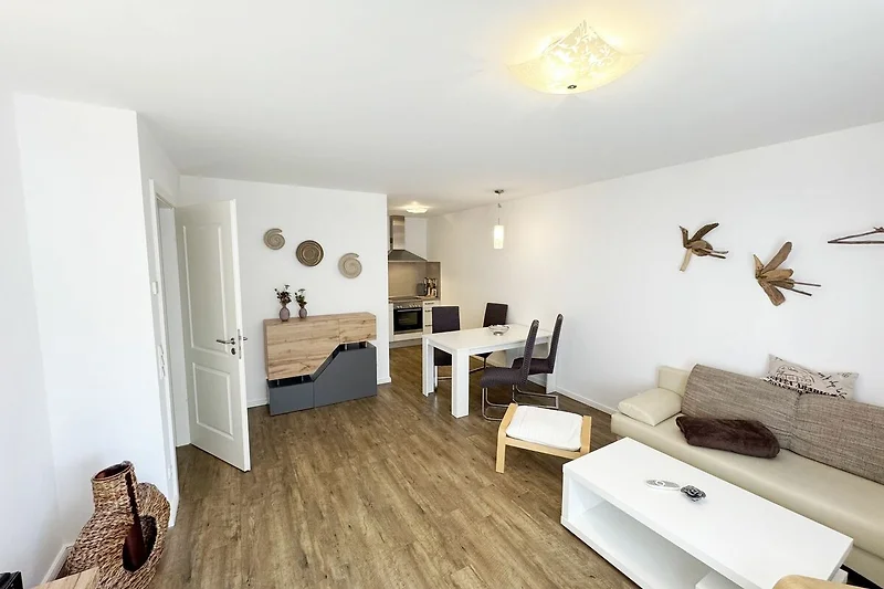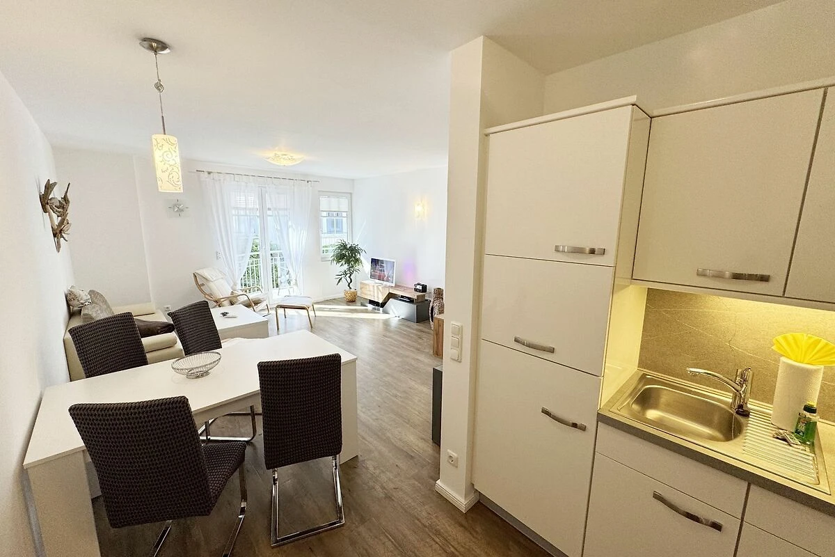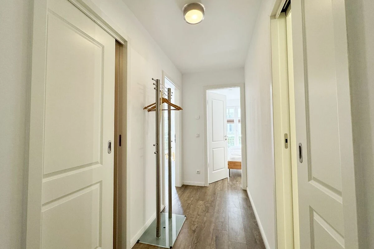 Unsere gemütliche FeWo 07 Aurora in der Villa Rosa liegt zentral inmitten der Selliner Wilhelmstrasse entfernt. Mit ihren ca. 54 m² ist unsere Nichtraucherwohnung ideal für 2 Erwachsene + 1 Kleinkind bis 3 Jahre im Kinderreisebett. Das gemütliche Wohnzimmer mit angrenzender Küchenzeile und Esstisch ist in dezenten Erdtönen gehalten. Hier befindet sich eine Couch, einen Couchtisch, einem Sideboard, ein DAB-Radio, einen WLAN-Zugang, eine Flachstrecke mit einem Smart-TV (65 Zoll), der nach einem ereignisreichen Tag zu entspannten Stunden vor dem Fernseher einlädt. Oder Sie verbringen den Abend in gemütlicher Atmosphäre mit einem Buch aus unserer reichhaltigen Bibliothek oder bei einem kurzweiligen Gesellschaftsspiel, von denen wir ebenfalls eine Auswahl für Sie vorhalten. Vom Wohnbereich oder vom Schlafzimmer gelangen Sie auf Ihren bestuhlten Südwest Balkon - hier können Sie den Tag gemütlich bei einer Flasche Wein ausklingen lassen und Pläne für Ihre nächsten Ausflüge in und um Sellin schmieden. Selbstverständlich müssen Sie auch bei uns nicht auf den gewohnten Komfort einer Küchenzeile verzichten: eine Mikrowelle, ein Geschirrspüler, ein Herd mit Cerankochfeld und ein Kühlschrank mit Gefrierfach stehen ebenso zur Verfügung wie ein Toaster, eine Kaffeemaschine und ein Wasserkocher. Sie verfügt über ein separates Schlafzimmer mit einem Doppelbett (2,00m x 2,00m), verstellbaren Lattenrosten, eine angrenzende Ankleide mit Safe und direktem Zugang zum innenliegenden Badezimmer. Bei der Badezimmerausstattung punktet unsere FeWo Aurora mit Funktionalität: die ebenerdige Dusche ist extra gross, der wandgrosse Spiegel ist umlaufend beleuchtet und der Waschtisch bietet ausreichend Ablagefläche, um Ihre Badutensilien jederzeit griffbereit zu haben. Für zusätzlichen Komfort sorgt der beheizbare Handtuchhalter sowie ein WC und ein Fön. Ihre Koffer können Sie bequem im Abstellraum unterbringen. Hier stehen Ihnen zusätzlich ein Bügeleisen, ein Bügelbrett, ein Staubsauger und ein Wäscheständer zur Verfügung. Haustiere sind nicht erlaubt. Die moderne Fussbodenheizung lässt sich bequem je Zimmer regulieren und sorgt dafür, dass Sie sich auch ausserhalb der Sommermonate bei uns wohlfühlen können. Dazu trägt auch unser hauseigener Wellnessbereich (Sauna kostenpflichtig) im Kellergeschoss + Dampfbad bei. Die Wertmarken können Sie auf Nachfrage während Ihres Urlaubes erwerben. Auch ein kleiner Garten hinter dem Haus lädt zum Verweilen ein. Der Parkplatz Nr. 07 (Einfahrtshöhe 2,00 m) befindet sich in der Tiefgarage (Doppelparker: bis 1,80m Höhe, 5,00m Länge sowie 2 t Gewicht) und ist für PKWs und Kombis (bis 1,80 m Höhe und 1,90 m Breite) geeignet. Von der Tiefgarage haben Sie einen direkten Zugang zu unserem abschliessbaren Fahrradkeller, in dem Sie gerne Ihre mitgebrachten oder geliehenen Fahrräder unterstellen können. Die Erstausstattung eines Wäschepaketes (komplette Bettwäsche, 1 Duschhandtuch, 2 kleine Handtücher) können Sie bis 14 Tage vor Anreise gegen einen Aufpreis dazu buchen oder durch eigenes Ergänzen. Ab 2 gebuchten Paketen erhalten Sie einmalig 1 Geschirrhandtuch und 1 Duschvorleger hinzu.