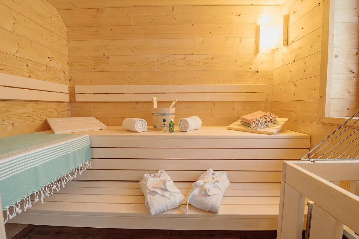 In der 1. Etage: (Schlafzimmer(Doppelbett, Balkon), Schlafzimmer(Etagenbett), Badezimmer(Badewanne, Dusche, Waschbecken, Waschbecken, Balkon), Toilette(Waschbecken, Toilette), Sauna(alleinige Nutzung)(Sauna), Balkon)