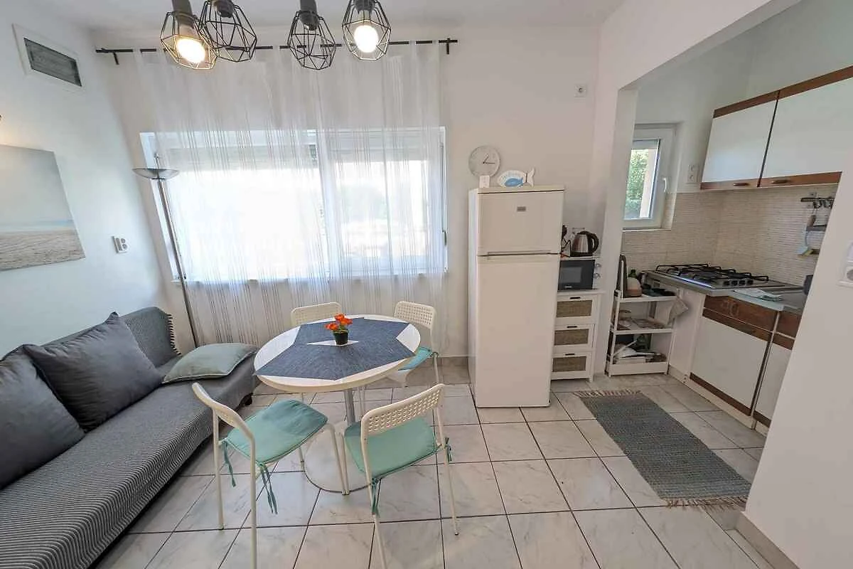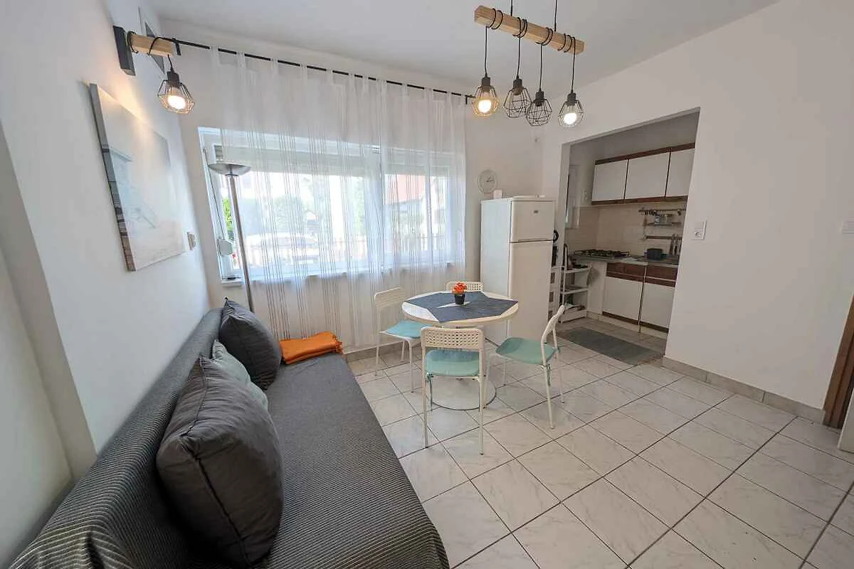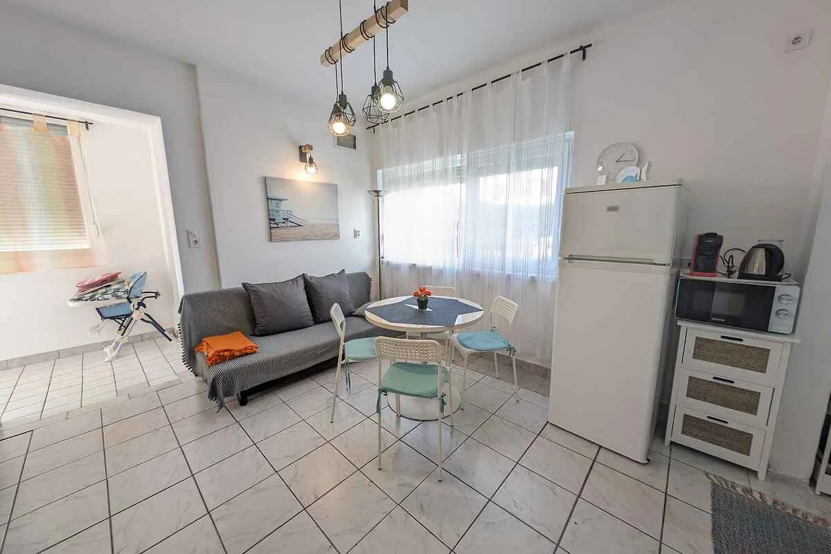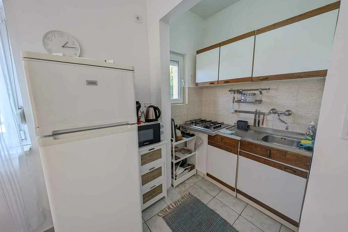 Erdgeschoss: Wohnküche mit 2 Zusatzbetten auf Doppelausziehcouch, Sitzecke und TV. Schlafzimmer mit 1 Doppelbett. Kochnische in der Wohnküche mit Essecke (4 Plätze), Gasherd (2 Flammen), Kühlschrank (Eisfach), Mikrowelle und Kaffeemaschine. Bad mit Dusche, 1 Waschbecken, WC und Fenster.