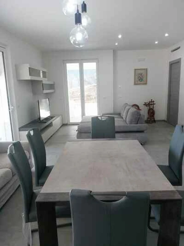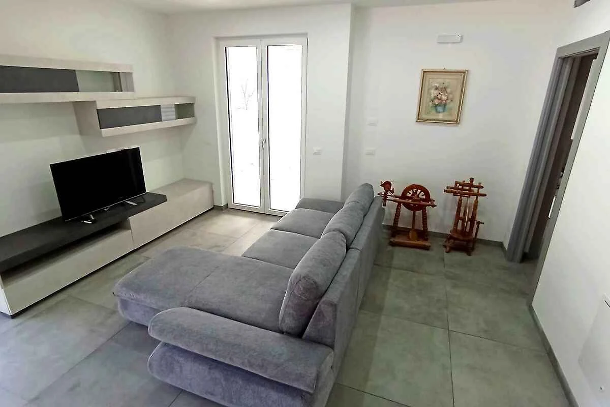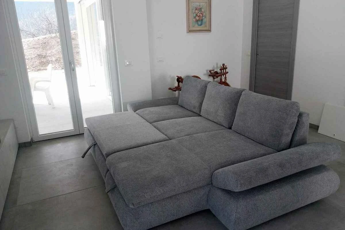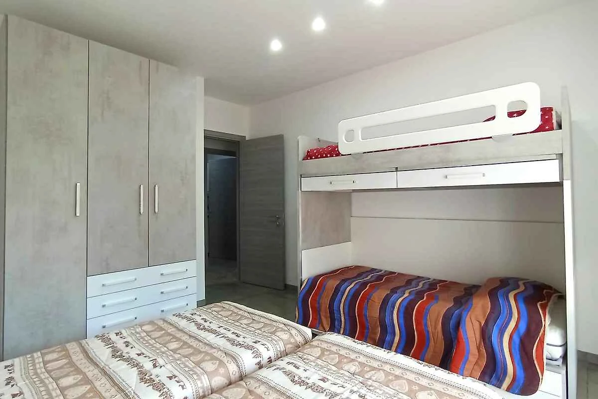 Der Eingang in Ihre Ferienwohnung befindet sich im Erdgeschoss, ist überdacht, ebenerdig und rollstuhlgeeignet und führt direkt in die Wohnküche. Wohn/Schlafzimmer (50 qm) mit 2 Zusatzbetten auf Doppelausziehcouch, Zugang zur Terrasse und Vista lago di Garda. Schlafzimmer (16 qm) mit 2 Einzelbetten, 1 Etagenbett und Zugang zur Terrasse. Schlafzimmer (15 qm) mit 2 Einzelbetten, 1 Zusatzbett auf Bett (kleiner 2,00 x 0,90 m) und Zugang zur Terrasse. Küche (50 qm) mit TV, Essecke (9 Plätze), Elektroherd (Induktionsherd, 4 Platten), Backofen, Geschirrspüler, Kühlschrank (Eisfach), Mikrowelle, Kaffeemaschine, Toaster, Zugang zur Terrasse und Vista lago di Garda. Bad (9 qm) mit Waschmaschine, Dusche, 1 Waschbecken, WC, Bidet, Föhn und Fenster.