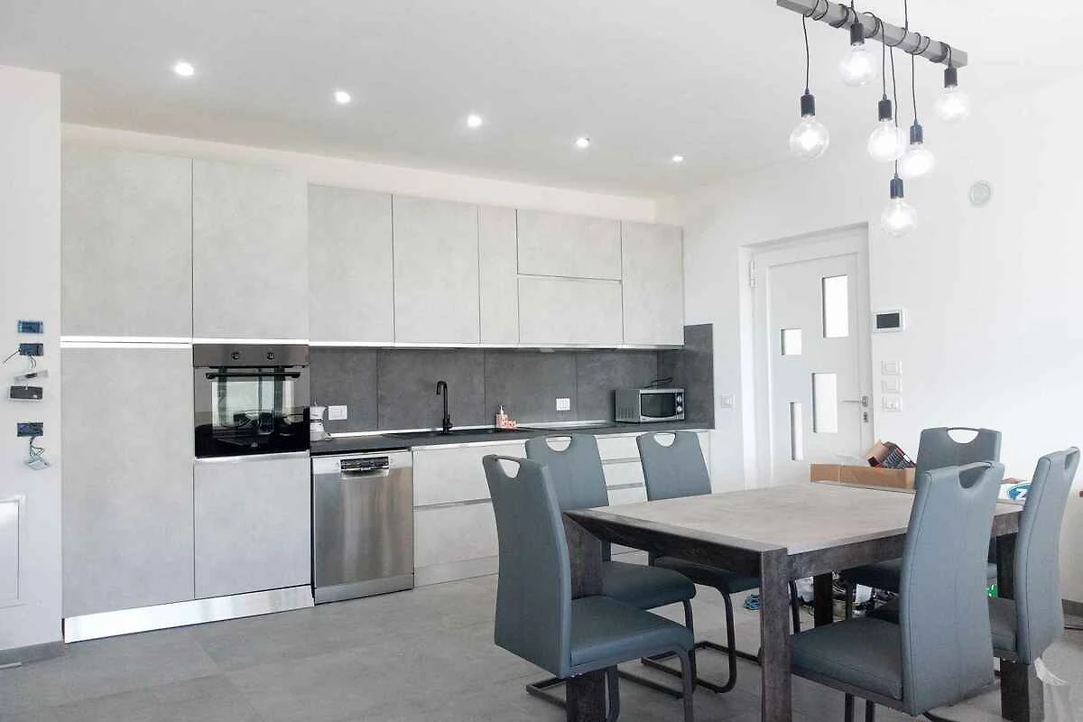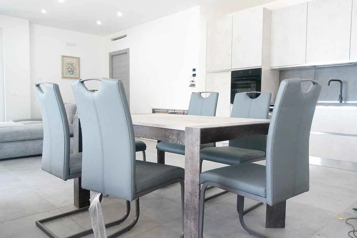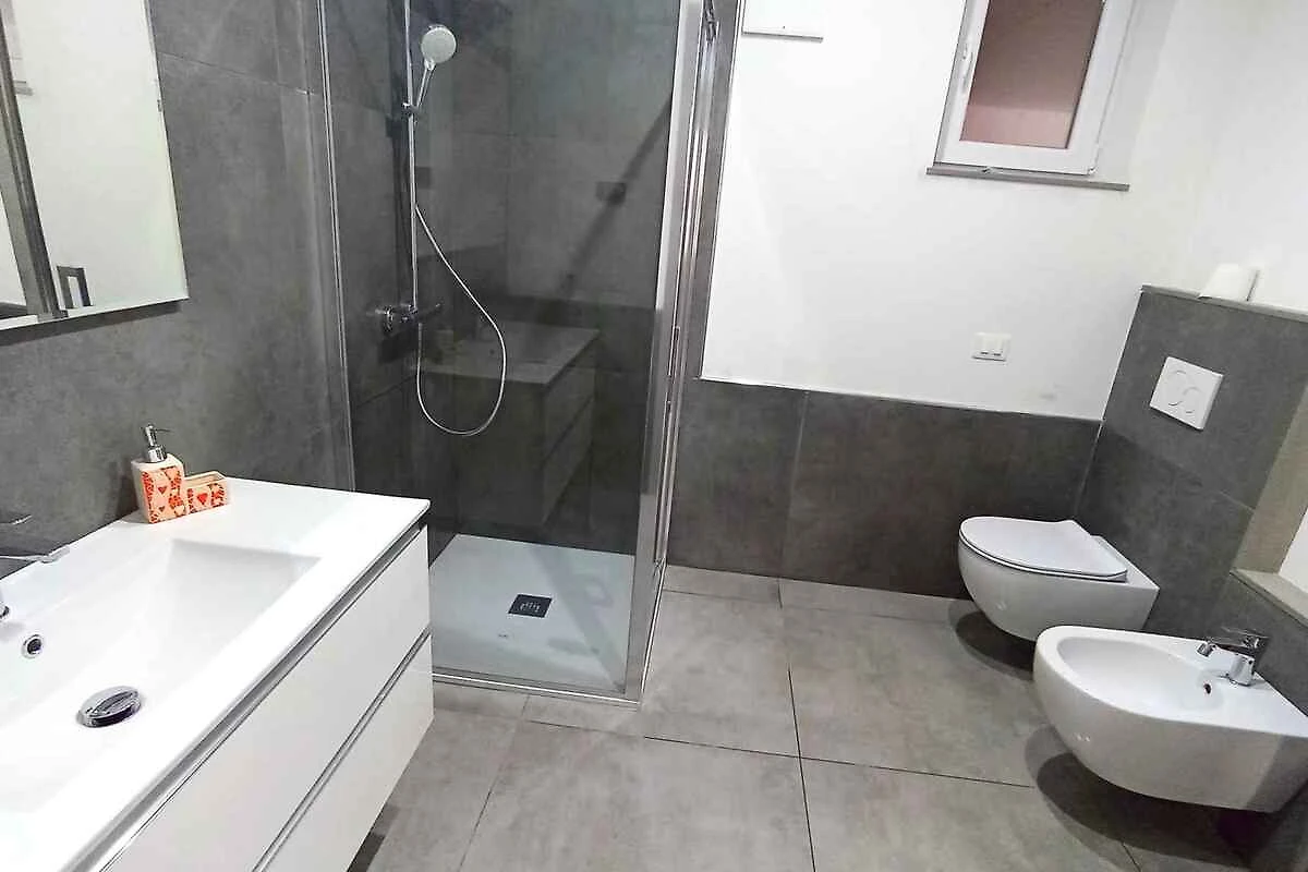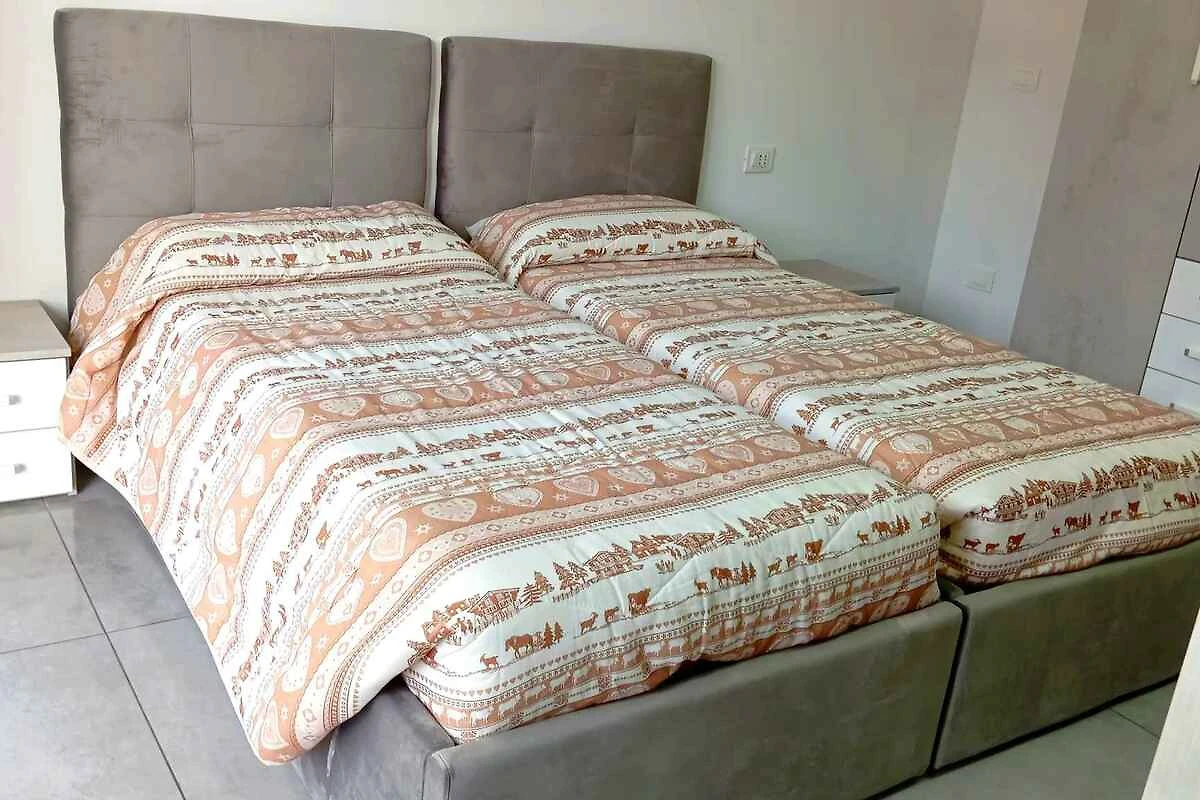 Der Eingang in Ihre Ferienwohnung befindet sich im Erdgeschoss, ist überdacht, ebenerdig und rollstuhlgeeignet und führt direkt in die Wohnküche. Wohn/Schlafzimmer (50 qm) mit 2 Zusatzbetten auf Doppelausziehcouch, Zugang zur Terrasse und Vista lago di Garda. Schlafzimmer (16 qm) mit 2 Einzelbetten, 1 Etagenbett und Zugang zur Terrasse. Schlafzimmer (15 qm) mit 2 Einzelbetten, 1 Zusatzbett auf Bett (kleiner 2,00 x 0,90 m) und Zugang zur Terrasse. Küche (50 qm) mit TV, Essecke (9 Plätze), Elektroherd (Induktionsherd, 4 Platten), Backofen, Geschirrspüler, Kühlschrank (Eisfach), Mikrowelle, Kaffeemaschine, Toaster, Zugang zur Terrasse und Vista lago di Garda. Bad (9 qm) mit Waschmaschine, Dusche, 1 Waschbecken, WC, Bidet, Föhn und Fenster.