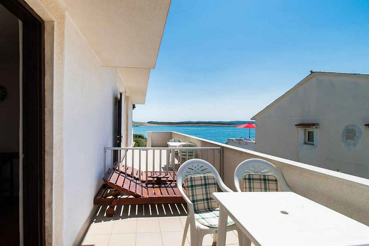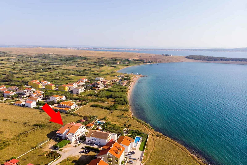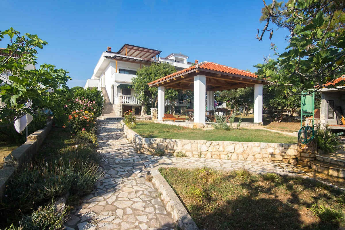 Povljana. Aussicht: Meer, Grünfläche und Garten.