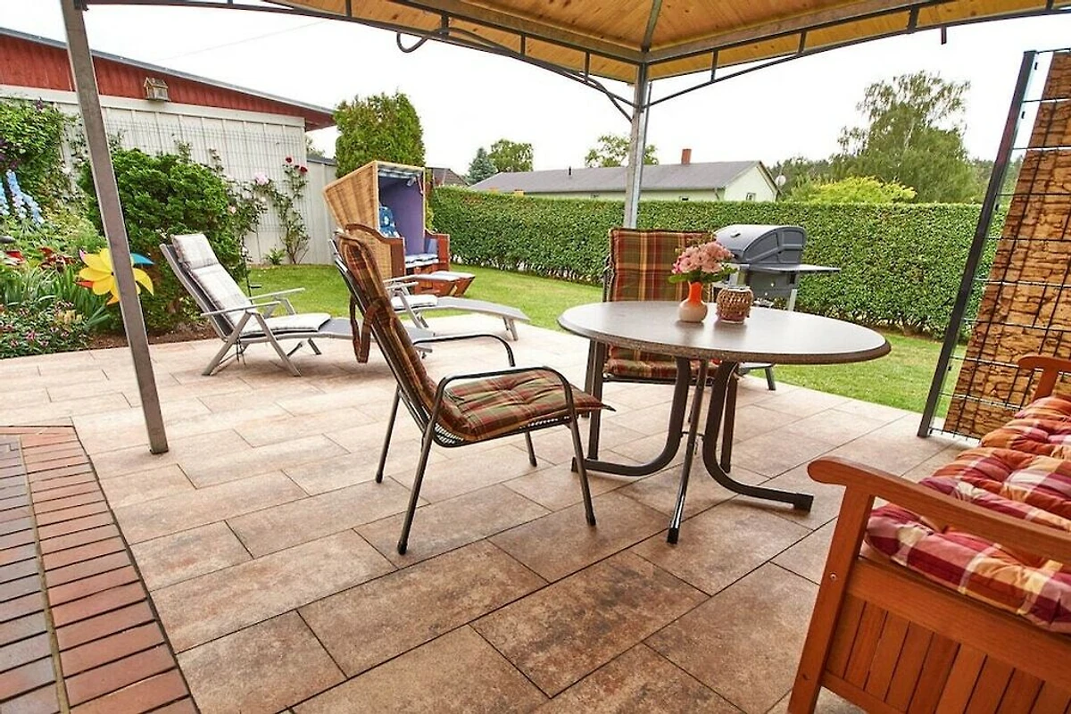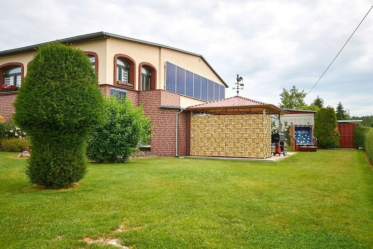 Der Außenbereich ist komplett umzäunt. Hier stehen Ihnen eine Terrasse mit Gartenmöbeln und ein Strandkorb zum relaxen zur Verfügung. Schalten Sie ab vom Stress in der Stadt und genießen Sie die ländliche Ruhe.
