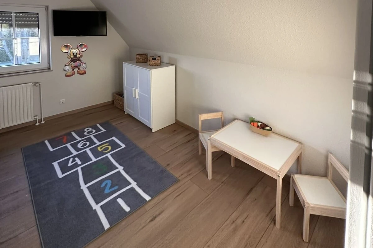 Der Außenbereich ist ein echtes Highlight, mit einer großen Terrasse, die über eine Markise verfügt. Bequeme Sitzgelegenheiten, Sonnenliegen und ein Webergrill machen Grillabende und entspannte Tage in der Sonne perfekt. Für die kleinen Gäste gibt es nicht nur einen Sandkasten im Garten, sondern auch reichlich Spielzeug im Kinderzimmer, damit es an Unterhaltung nicht mangelt.