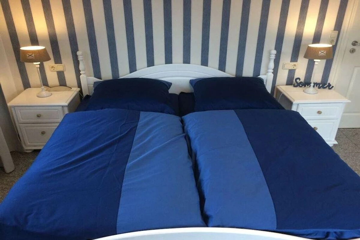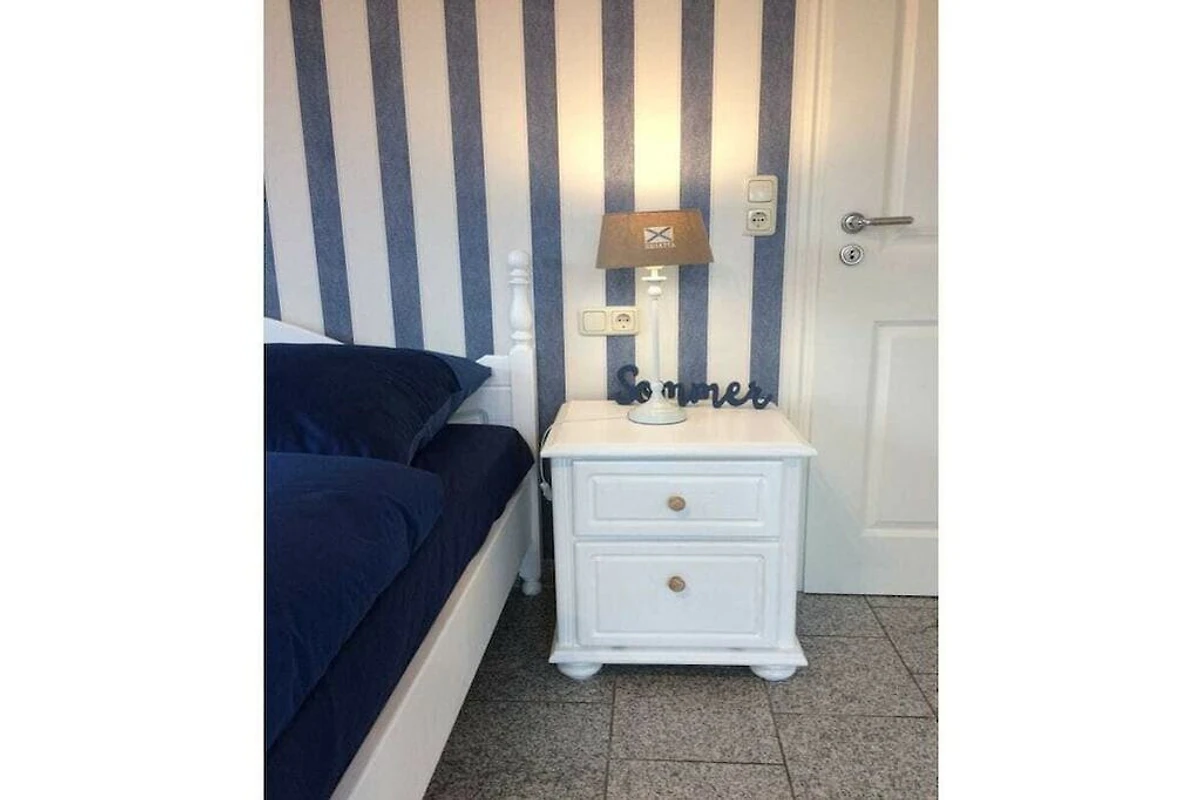 Neue hochwertige Ferienwohnung mit nordischer Behaglichkeit. Maritime Gemütlichkeit in weiß / blau und massiven Pinienmöbeln.