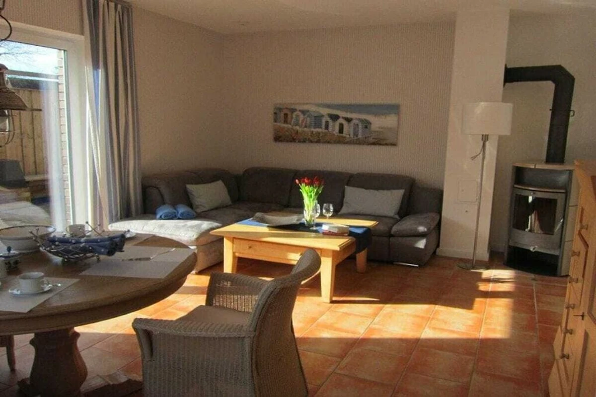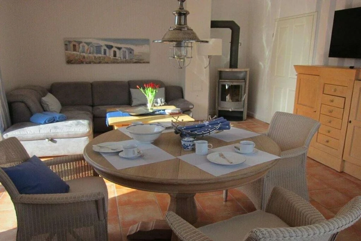 Eine komfortable Eckgarnitur und der großen Flachbild-Smart-TV laden zum Entspannen ein. Ein weiteres Highlight ist der Kaminofen. Sie finden Spiele- und Bücherauswahl vor.