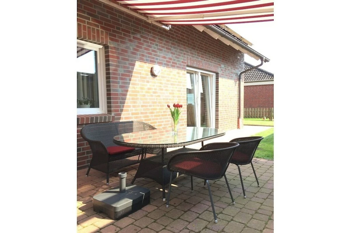 Von der Wohnstube gelangen Sie direkt auf die Terrasse. Diese bietet hochwertige Flechtmöbel und Sonnenliegen.