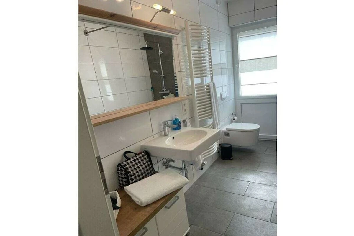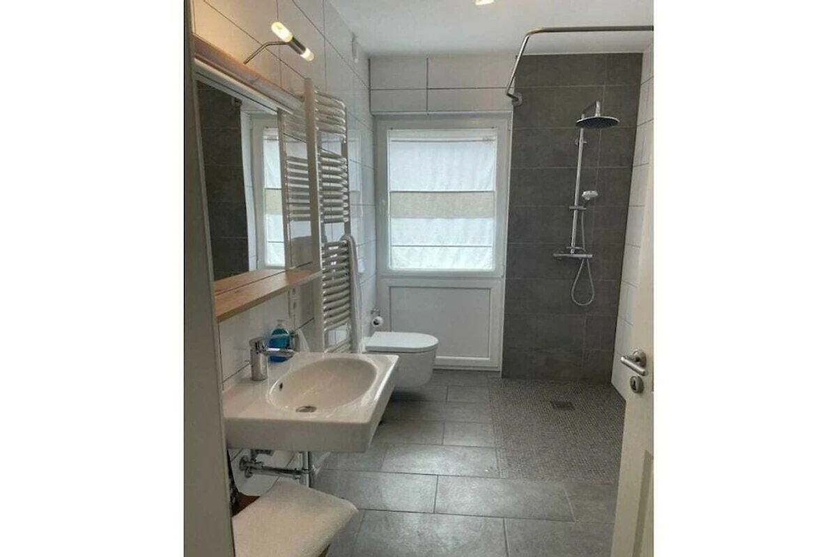 Die Ferienwohnung bietet ein großes Bad mit bodengleicher Dusche. Ein 2. separates WC liegt für die Hausgäste im Treppenhausbereich.