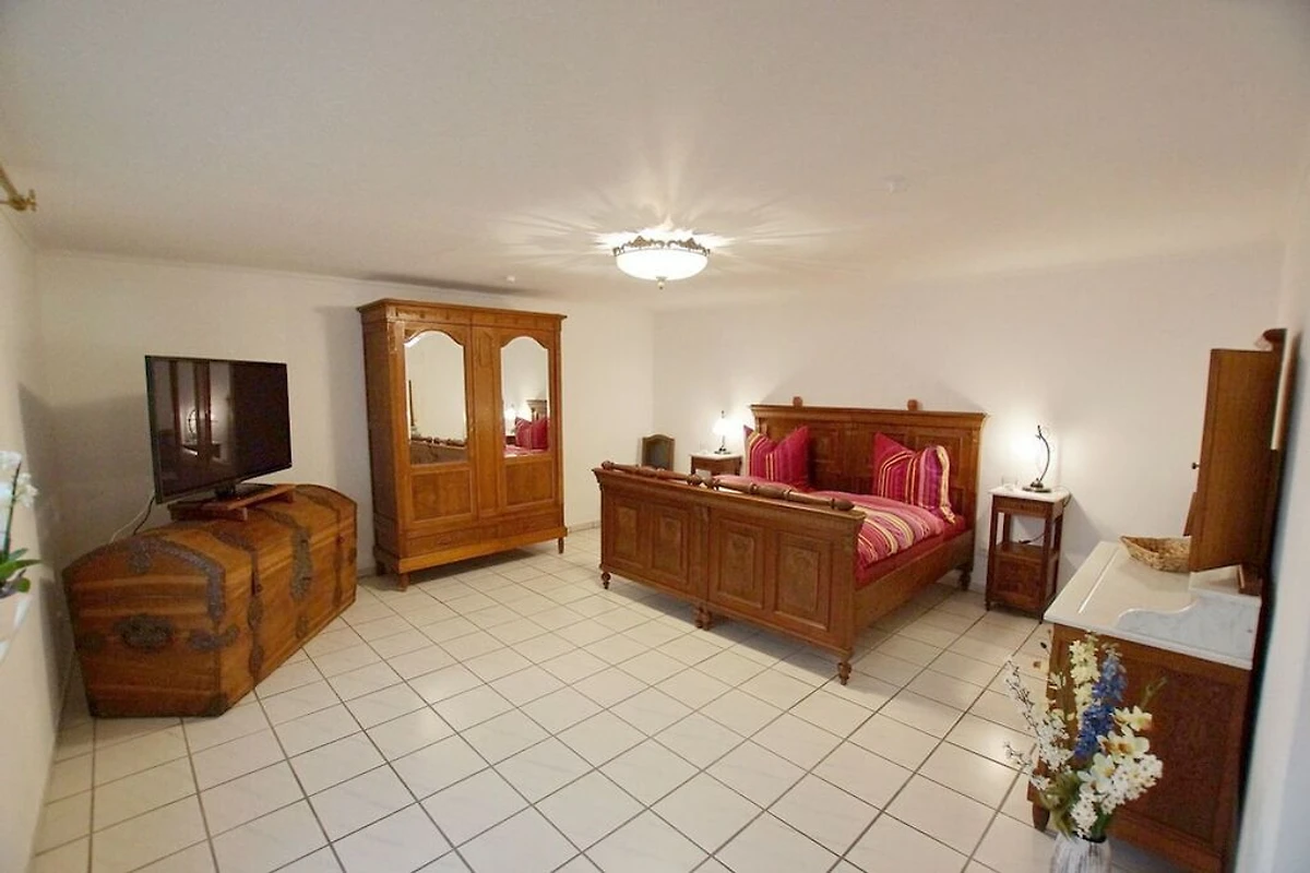 Schlafzimmer Original-massiv natur Eichenholzmöbel aus der Gründerzeit, einstellbare Lattenroste sowie Federkern-Matratzen HighTech300 für erholsamen Schlaf. 65 Zoll Fernseher