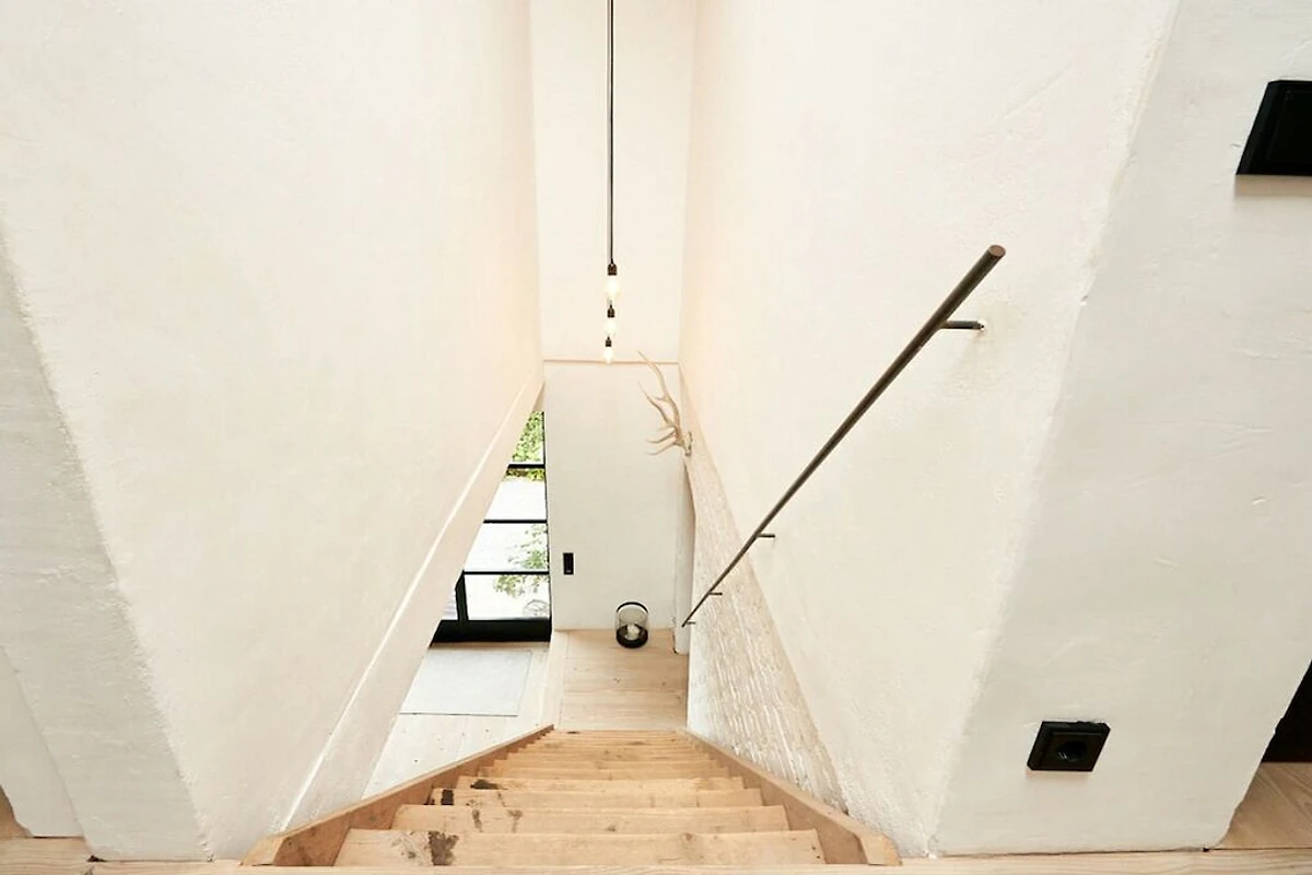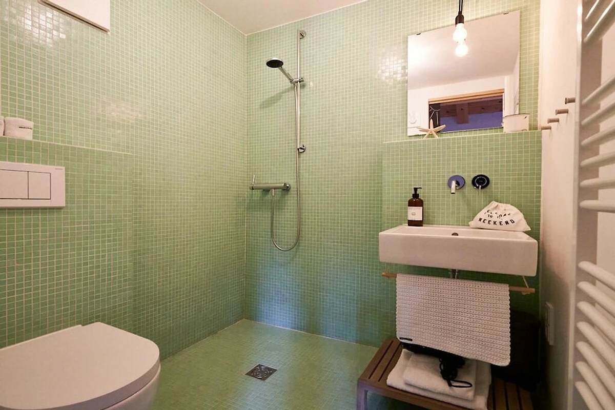 Das Haus hat 6 eigenständige Schlafräume, die aus 3 Doppelzimmern und 2 Einzelzimmern mit jeweils eigener Dusche und Toilette bestehen und einem Schlafraum mit zwei Einzelbetten und eigenem Waschbecken. Es gibt eine große schöne Gemeinschaftsküche mit mobiler Kochinsel (auch geeignet für Kochevents), einen großen Gemeinschaftsraum und einen Fitness- und Saunaraum.