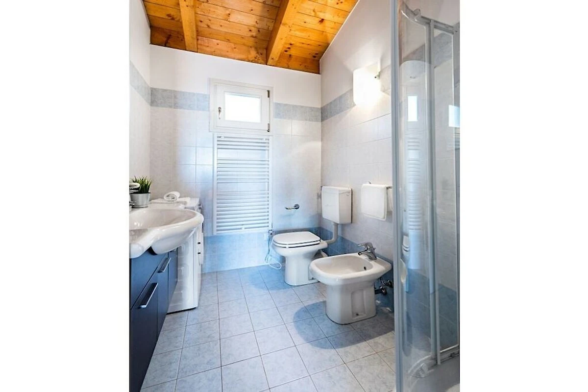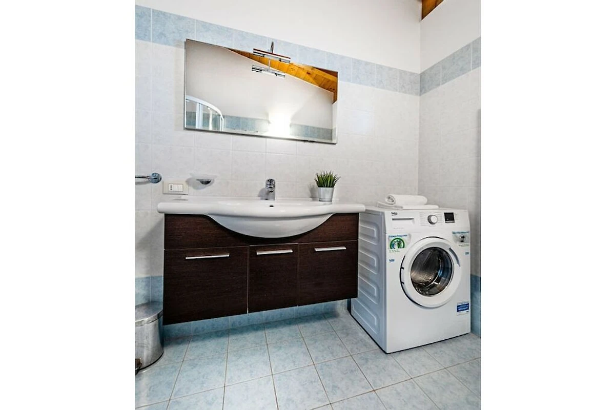 Die Einrichtung dieser Wohnung wird durch das Schlafzimmer mit Doppelbett und Kleiderschrank und das Badezimmer mit Dusche, Waschbecken, Bidet, WC und Waschmaschine ergänzt.