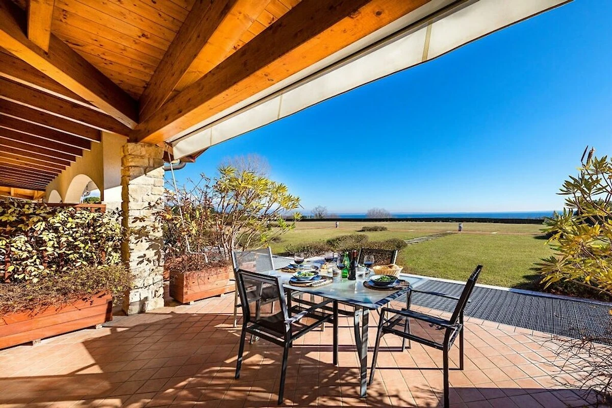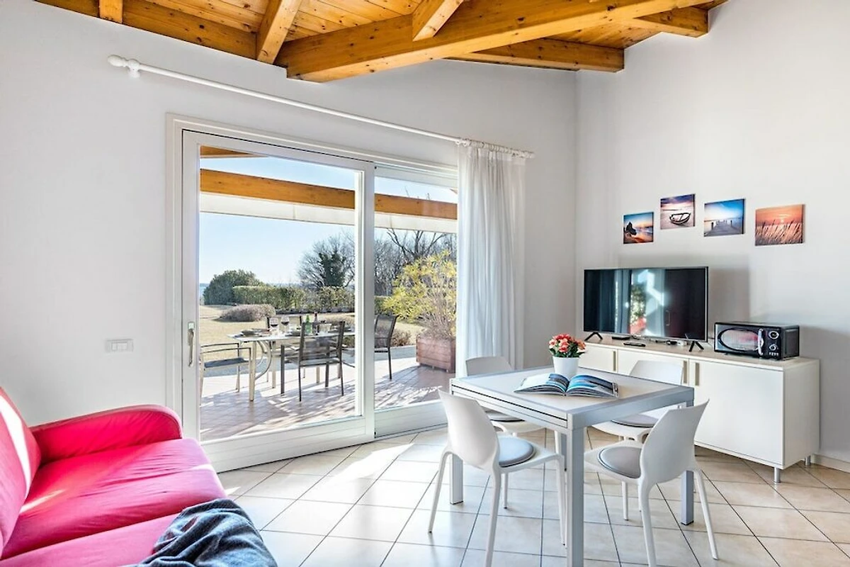 Vom Wohnzimmer aus geht man auf die private Terrasse und Garten der Wohnung mit wunderbaren Blick auf den See! Die Terrasse, ausgestattet mit Tisch und Stühlen für 4, ist ideal für Frühstücken und Mittagessen im Freien, um einen unvergesslichen Urlaub am Gardasee zu genießen.